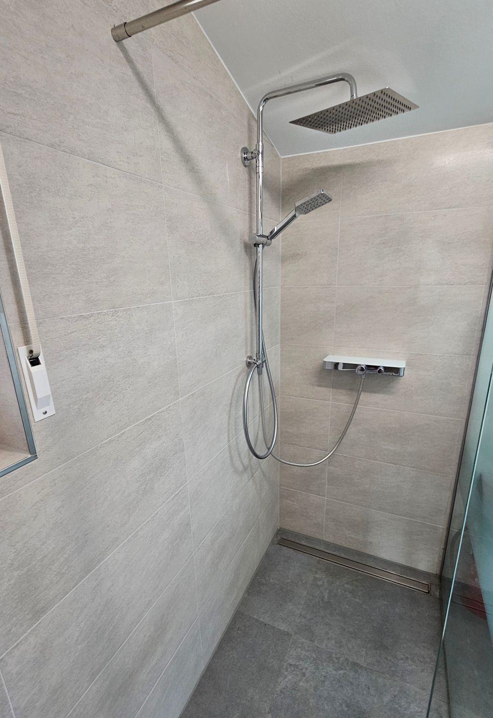 Das modern geflieste Bad verfügt über eine ebenerdige Dusche, WC, Waschbecken, Spiegel und eine kompakte Waschmaschine – praktisch für längere Aufenthalte. Klare Linien, helle Farben und funktionale Ausstattung schaffen einen gepflegten Raum zum Wohlfühlen.