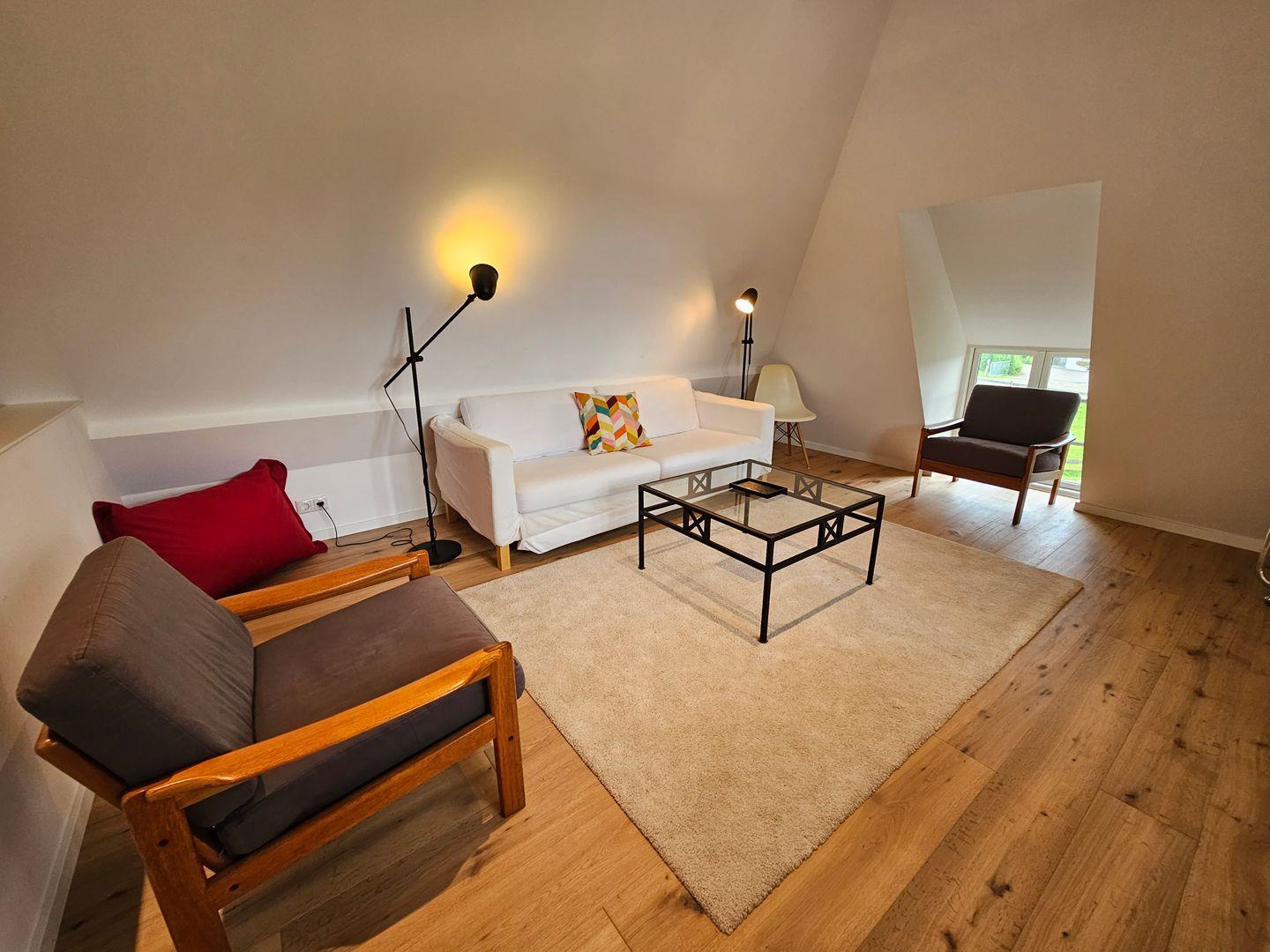 Über eine Holztreppe gelangt man in das Obergeschoß, welches zu einem weiteren offenen Wohn- und Schlafbereich ausgebaut wurde. Dänische Holzfenster und Türen runden das originalgetreue Gesamtbild dieses besonderen Objektes ab. Im Obergeschoss des Hauses befindet sich ein Fernseher (dieser verfügt lediglich über die Möglichkeit für Streamingdienste, reguläre Sender sind nicht vorhanden (kein SAT-TV, kein Kabel-TV)).