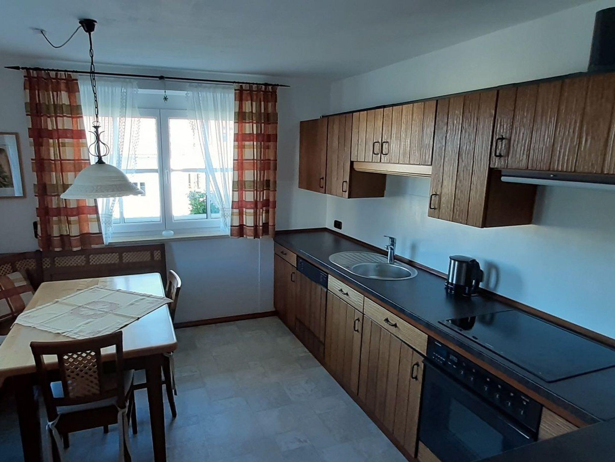Unsere Ferienwohnung befindet sich im 1. Stock und hat einen Südbalkon mit Bergblick. Die Küche ist komplett ausgestattet mit Kaffeemaschine, Toaster, Geschirrspüler und Kühlschrank mit Gefrierfach. Das Bad ist neu renoviert und ist mit einer Dusche ausgestattet. Im Bad befindet sich eine Waschmaschine, die auf Anfrage benützt werden kann. Im Dachgeschoss befindet sich ein Zimmer mit einem Bett 200x140 cm.