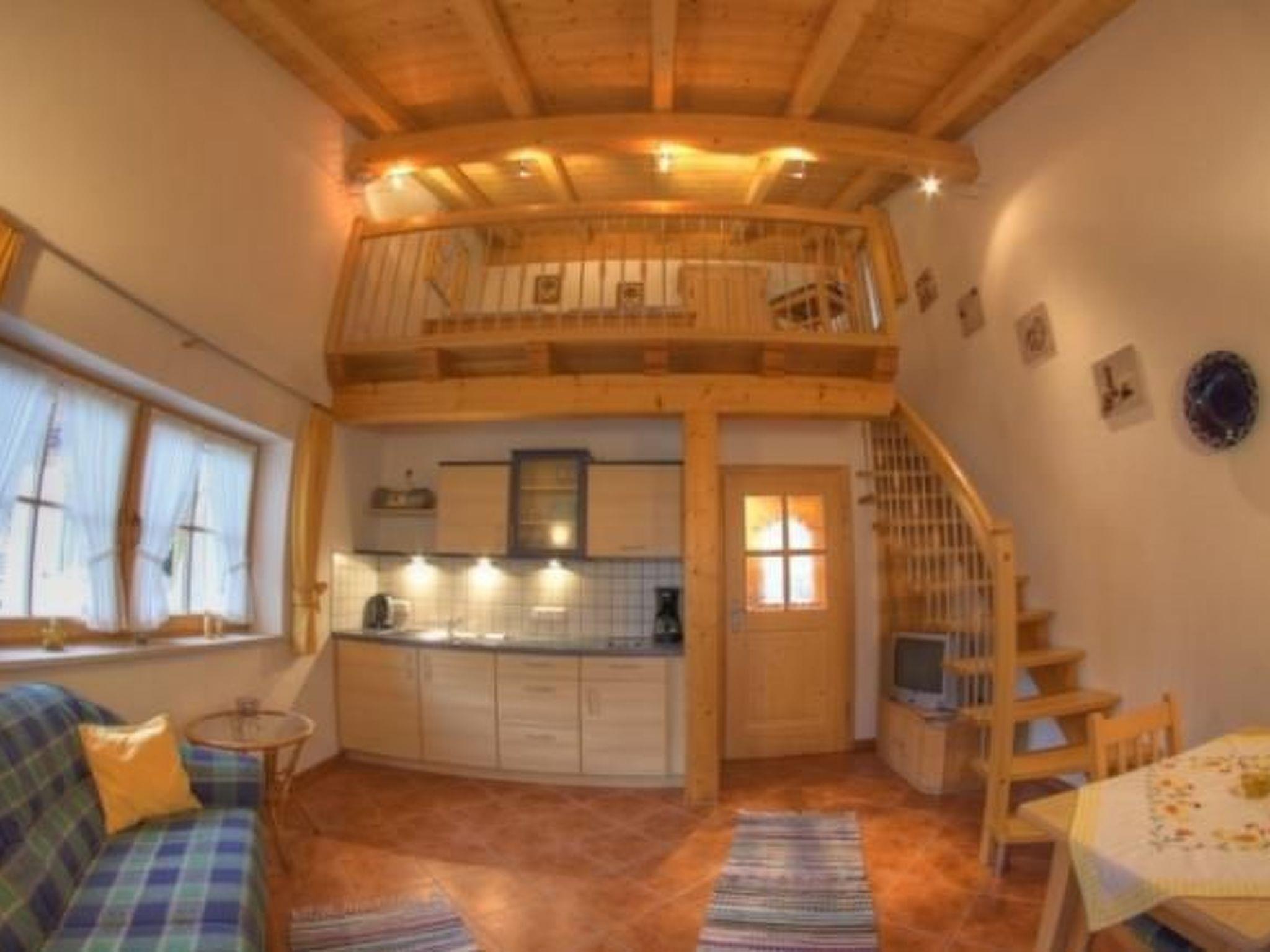 The non-smoking holiday apartment for 2 people has a separate entrance and a terrace. It is fully equipped including bed linen, towels and hairdryer. The apartment is equipped with a kitchenette, dining area, pull-out couch, cable TV, radio and internet connection. The bedroom is located on a cosy gallery above the living room.