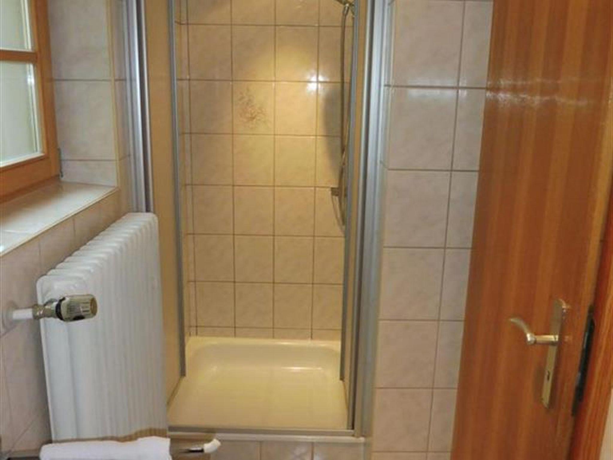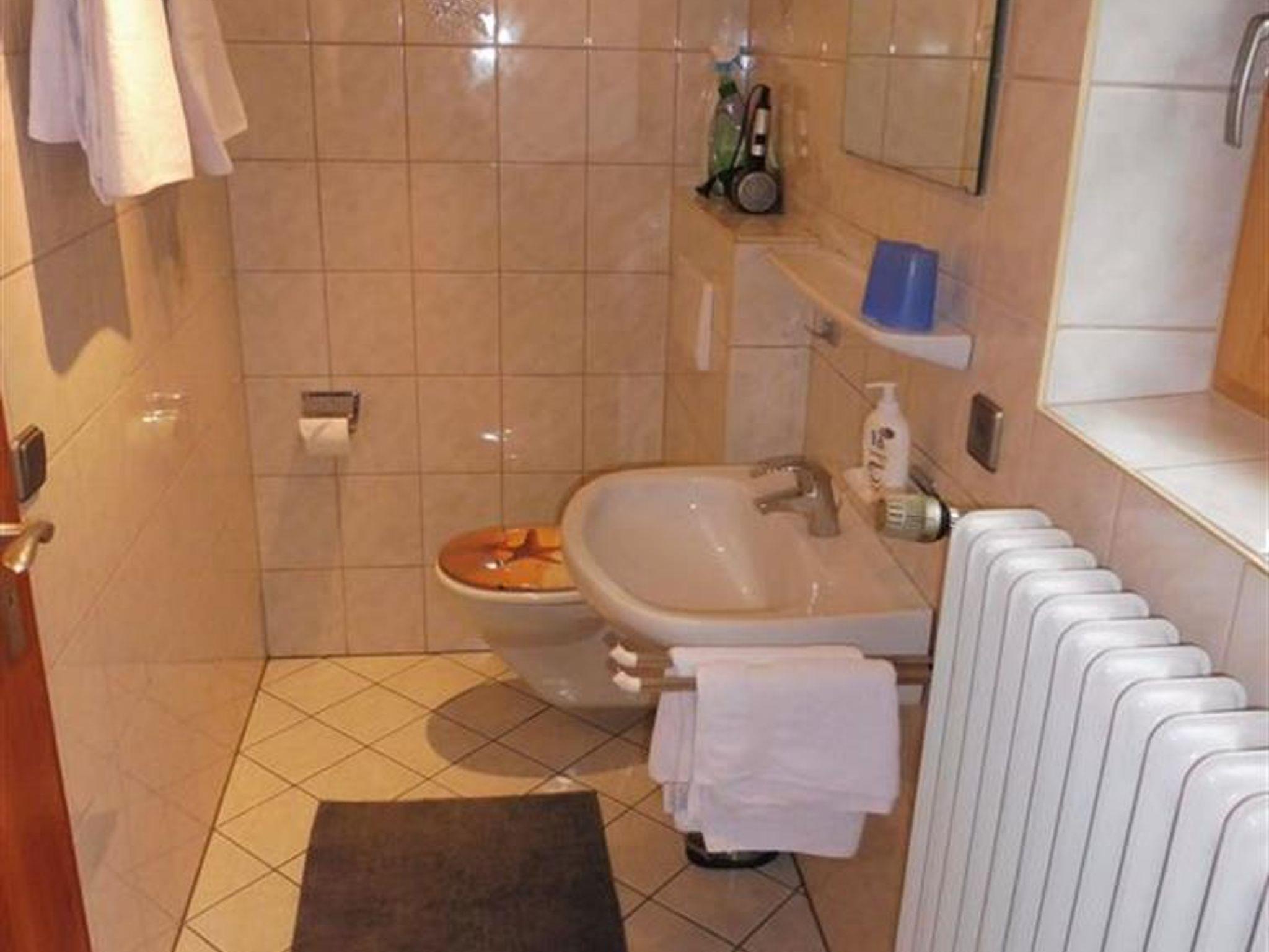 Das Badezimmer ist mit einer Dusche, Waschbecken und WC ausgestattet.