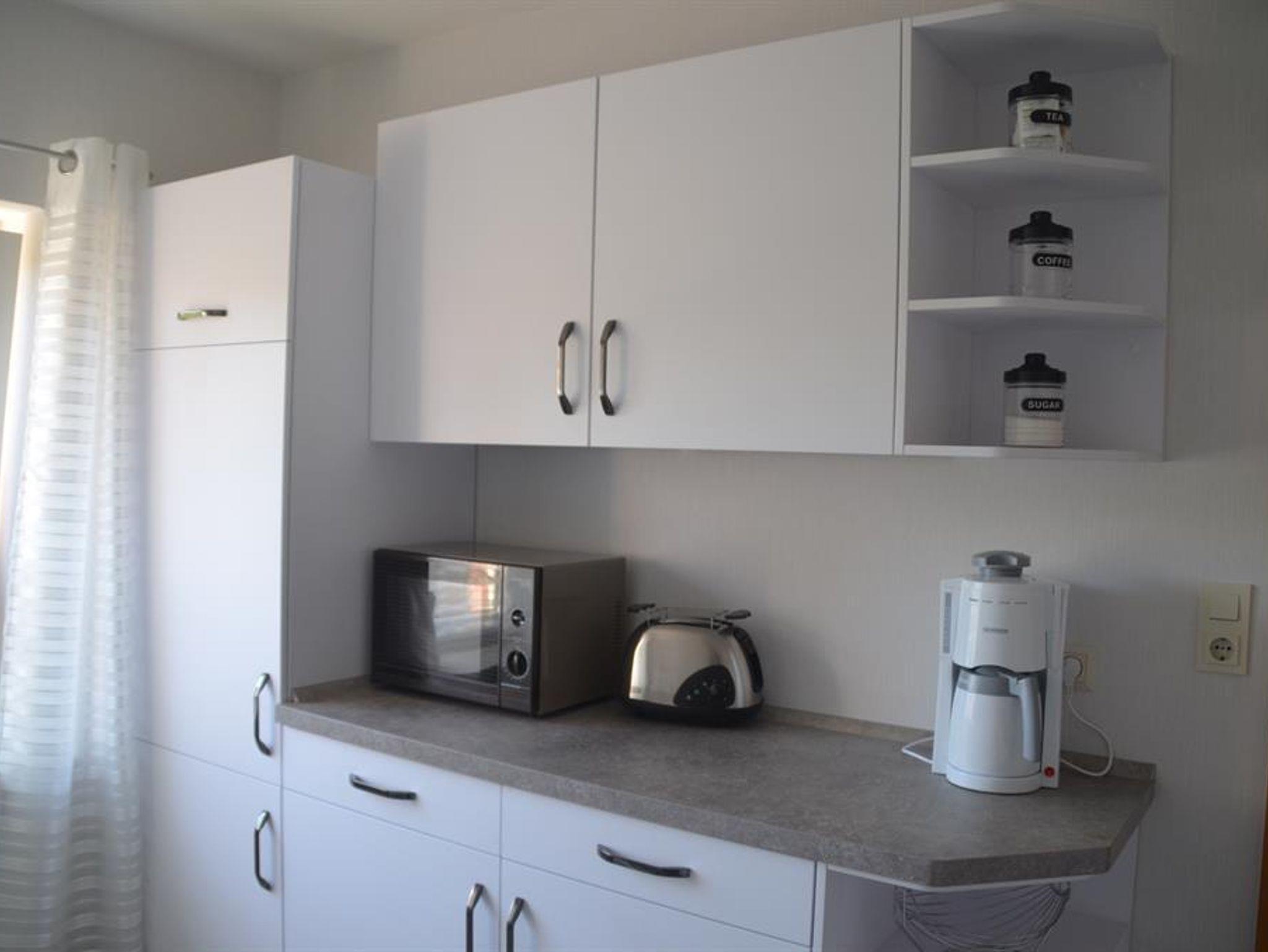 Die hell und modern eingerichtete Ferienwohnung verfügt über eine komplett ausgestattete Küche, ein Wohnzimmer, ein Schlafzimmer mit einem Doppelbett und einem Einzelbett, einen Abstellraum sowie ein Bad mit Badewanne und WC.