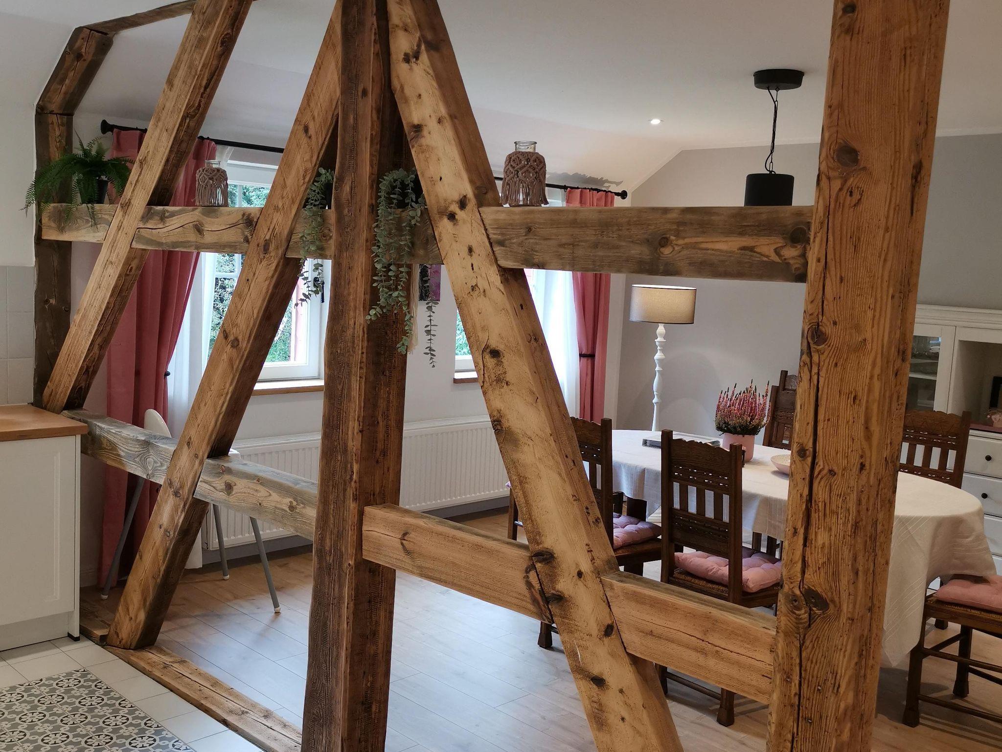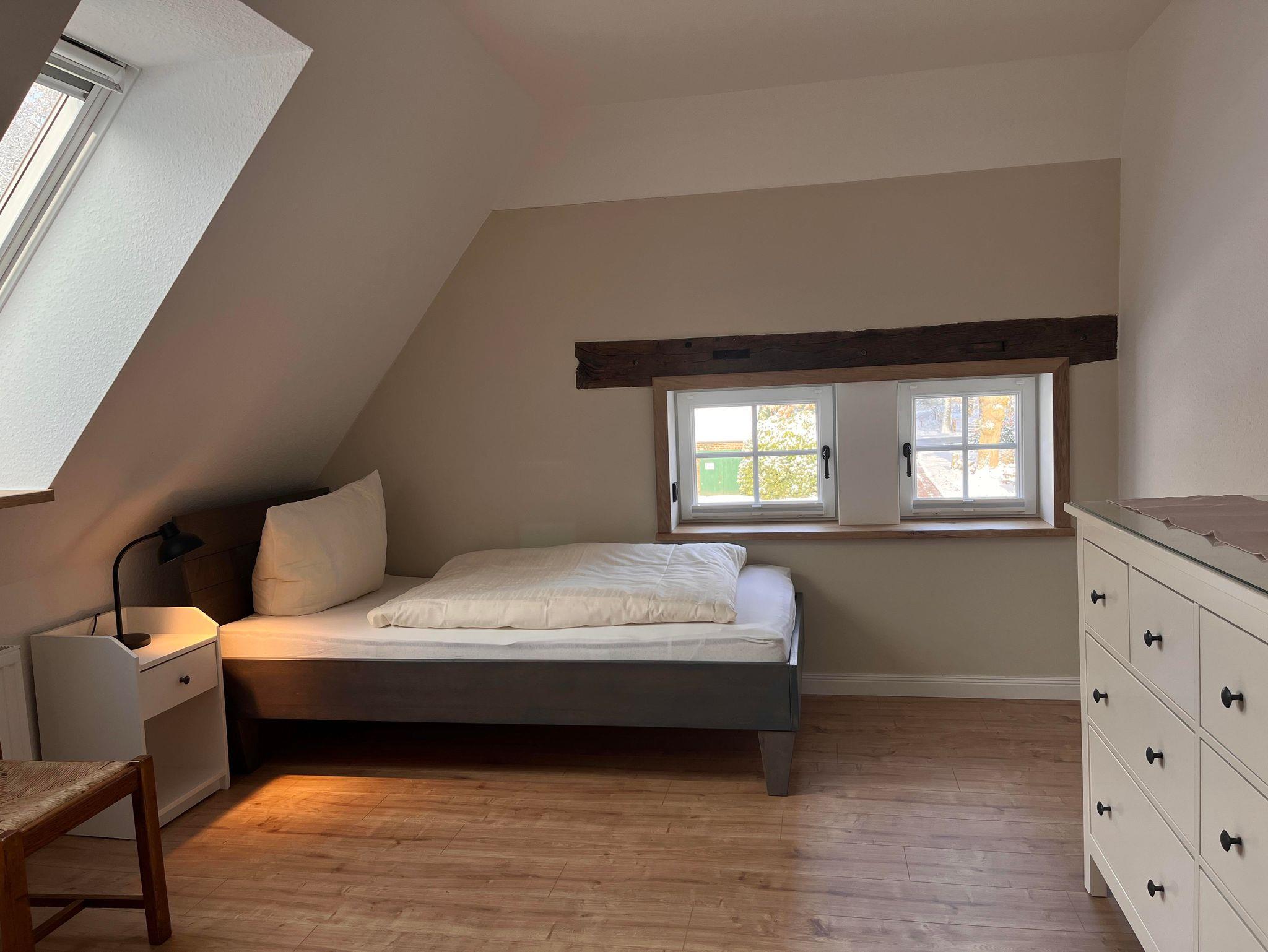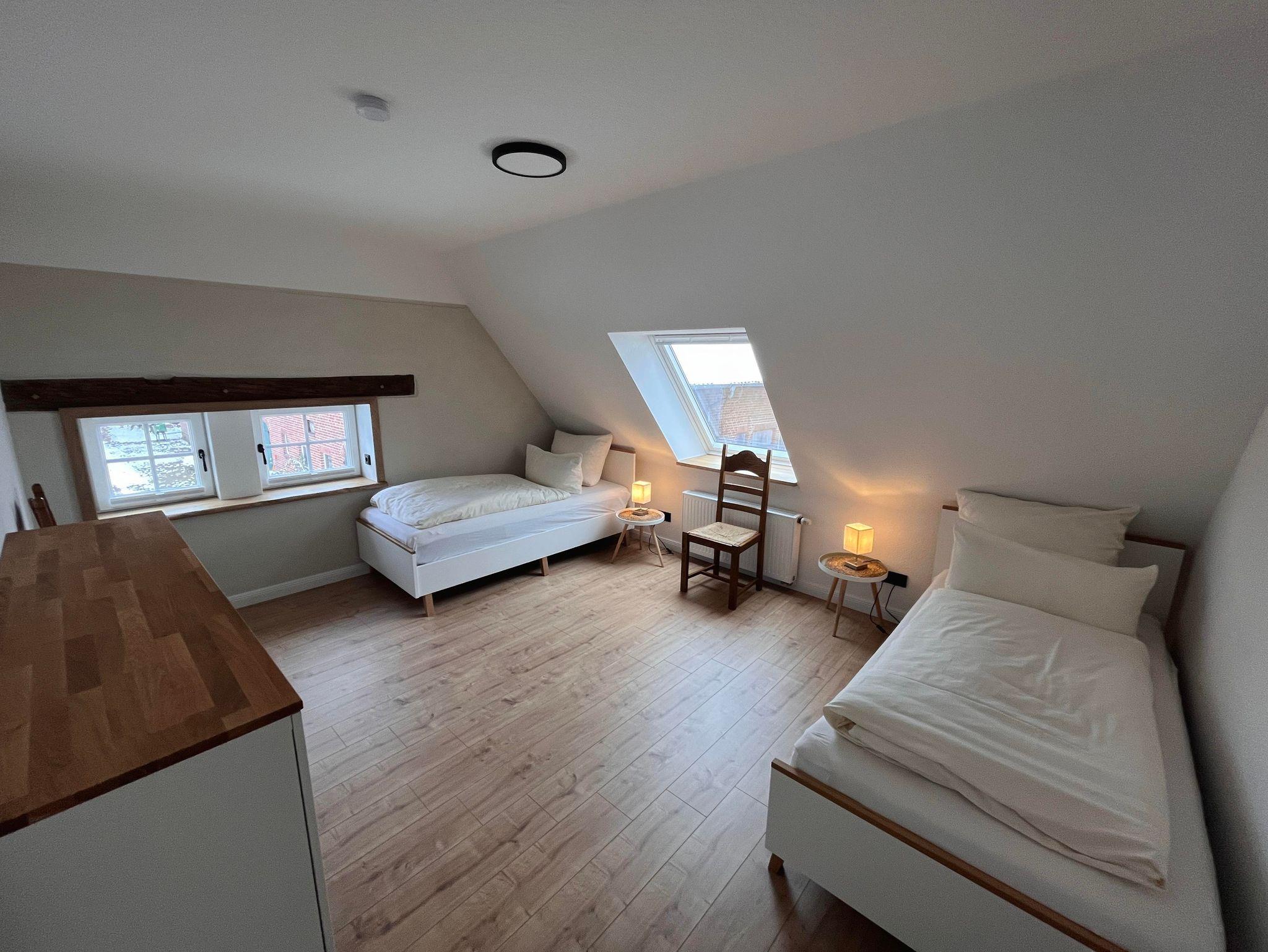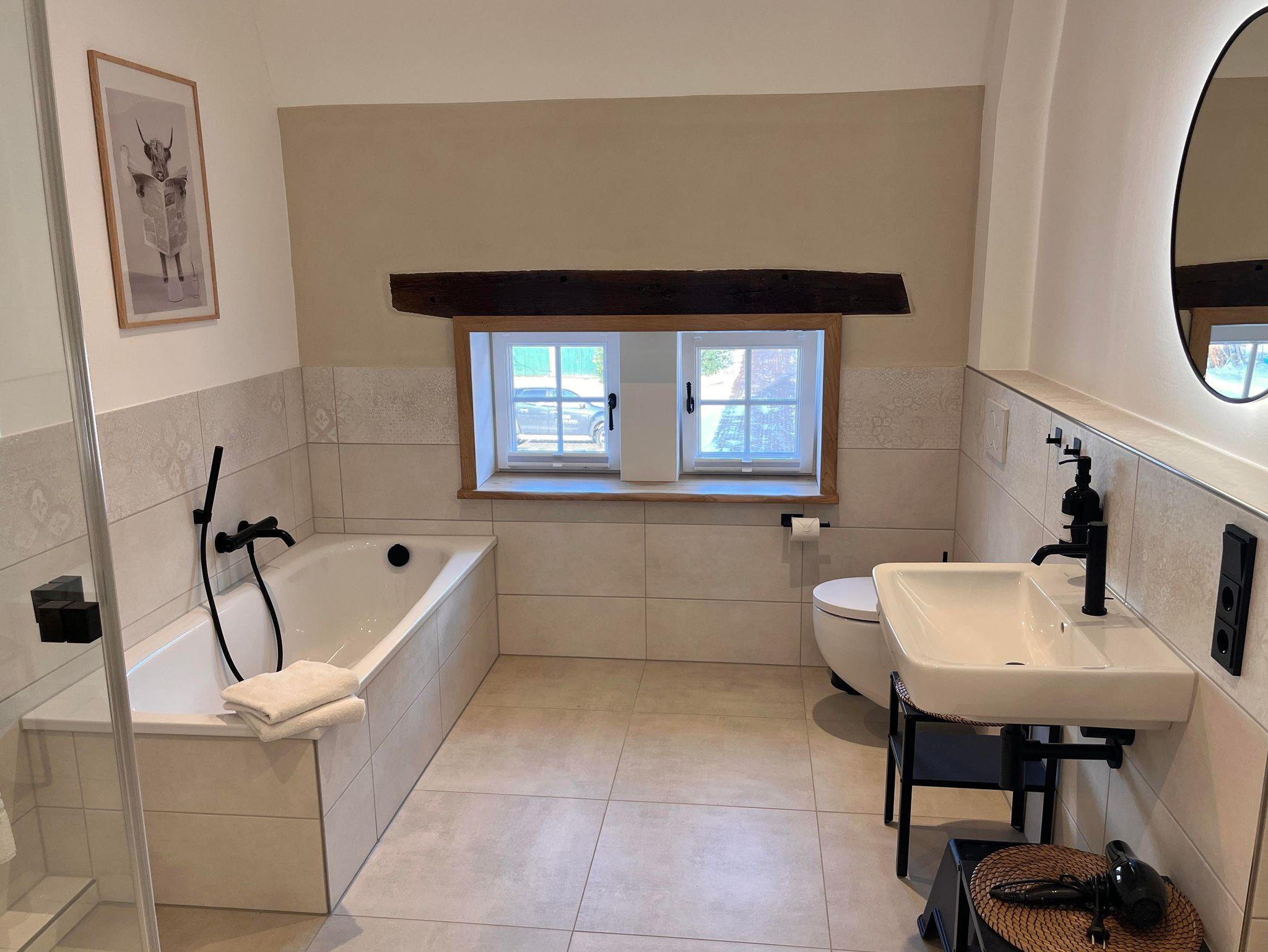 Die Wohnung ist im Obergeschoss des alten Fachwerkhauses über eine Treppe zu erreichen. Der große offene Wohn- und Essbereich in einem modernen Landhausstil, verleiht der Wohnung ein gemütliches Wohnambiente. Vier Schlafzimmer und zwei Bäder (eines davon mit Badewanne) runden die Wohnung ab.