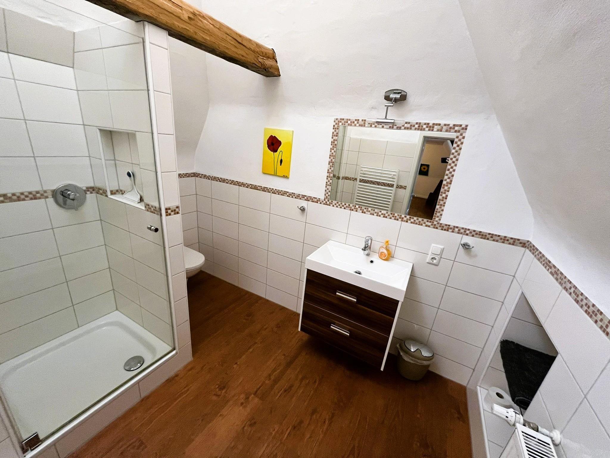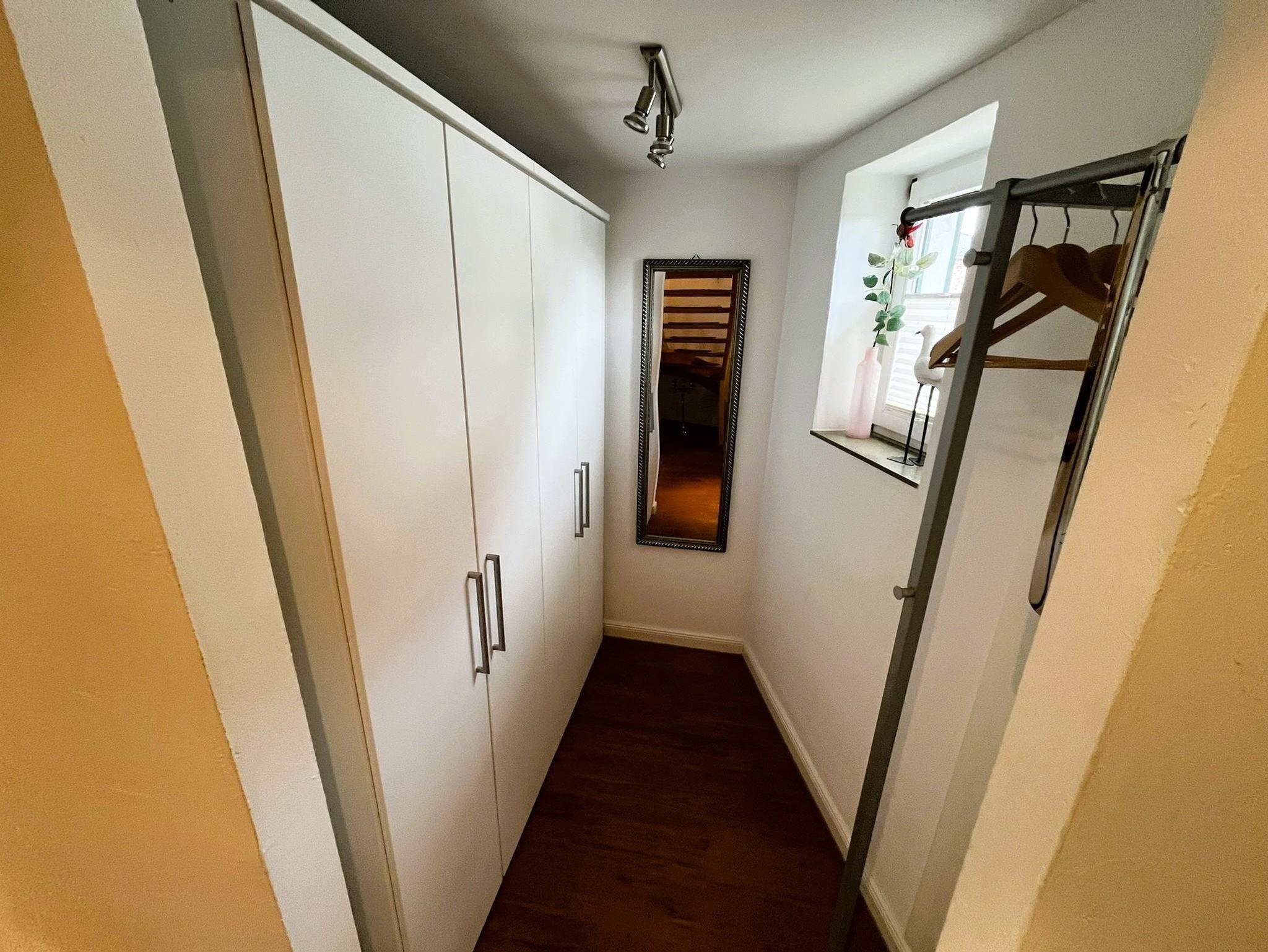 Im Erdgeschoss des Ferienhauses befindet sich ein Flur mit Garderobe, eine vollausgestattete Küche, ein hell und liebevoll eingerichteter Wohn-Essraum mit angrenzender Terrasse und idylischem Garten. Das Sofa im Wohnzimmer kann als Schlafgelegenheit für 2 Personen ausgezogen werden. Über eine Treppen gelangen Sie zur Galerie, dort befindet sich das Doppelbett und ein ausziebarer Sessel als Schlafgelegenheit für eine weitere Person. Das Bad mit Dusche und WC grenzt direkt an den Schlafbereich an.