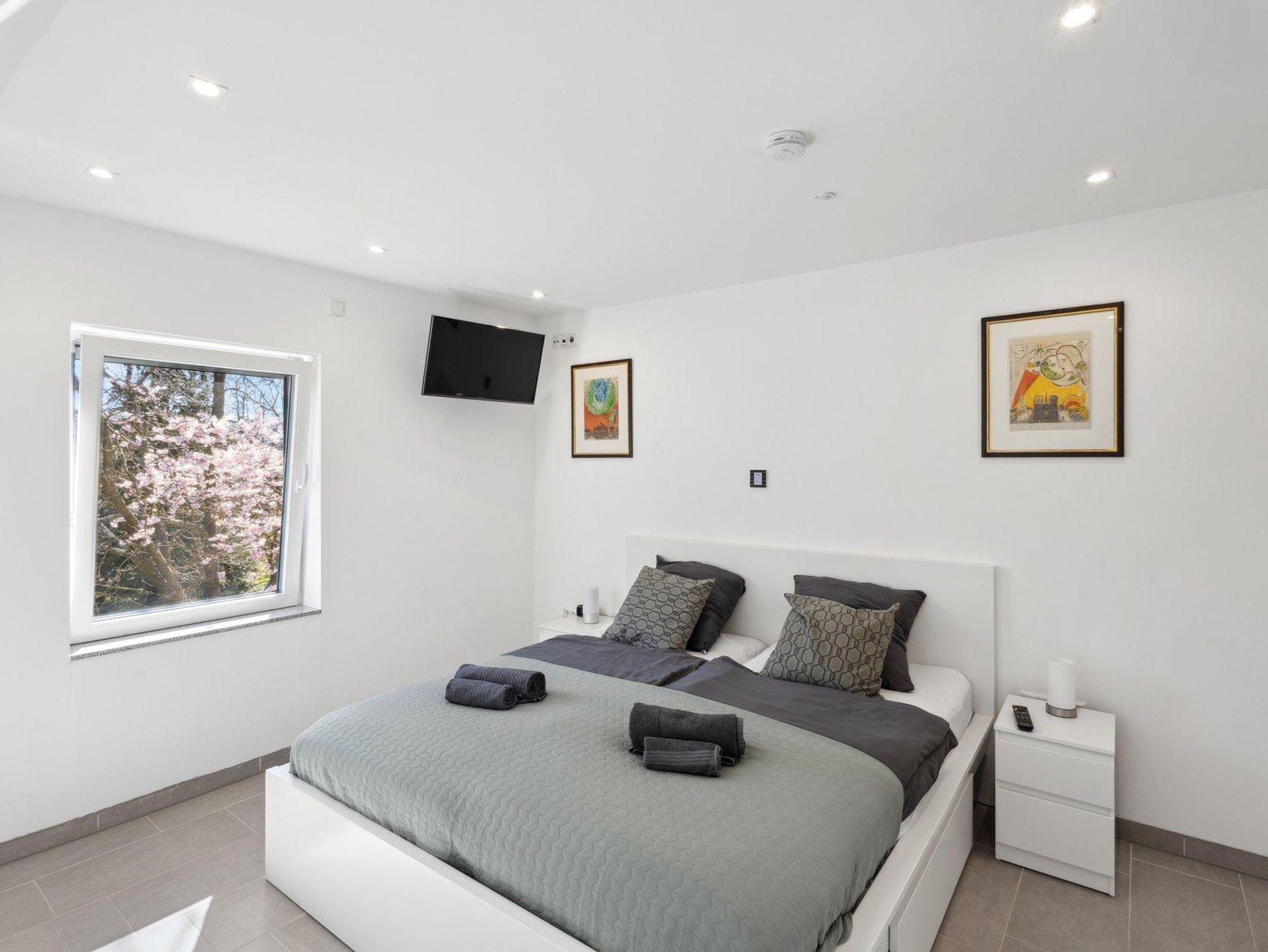 Es stehen zwei separate Schlafzimmer zur Verfügung: eines mit einem Doppelbett, das andere mit zwei Einzelbetten.