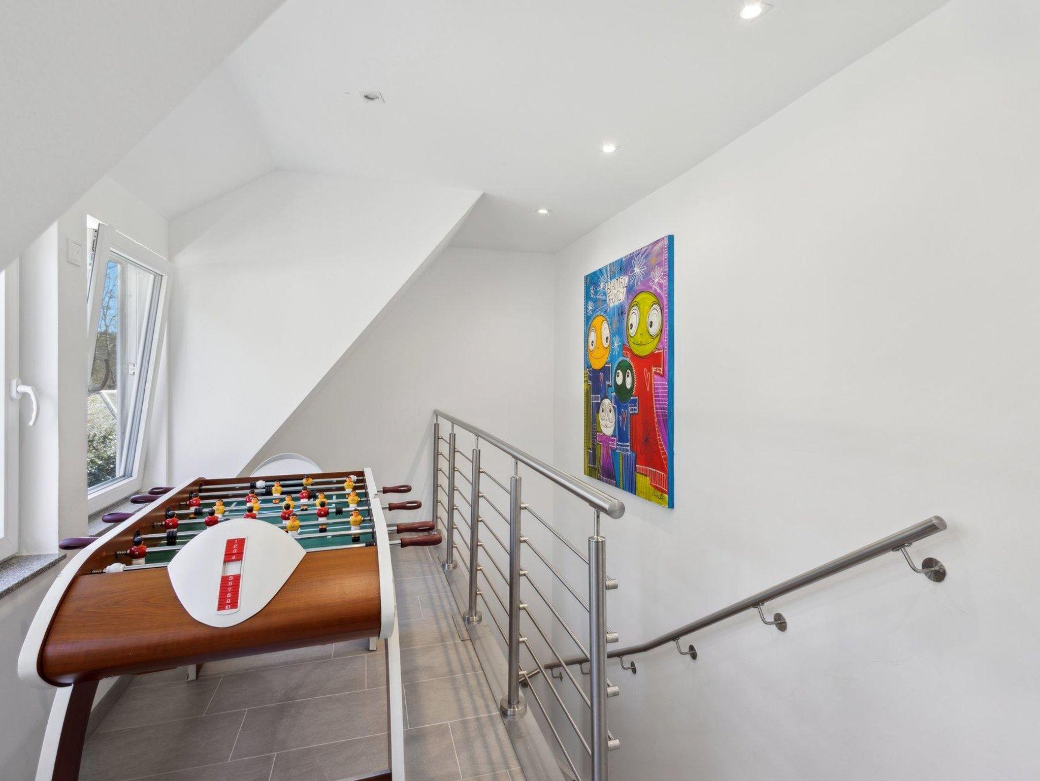 Das Badezimmer verfügt über eine Dusche und WC. Ein besonderes Extra: Ein eigener Tischkicker sorgt für Spielspaß bei Groß und Klein.