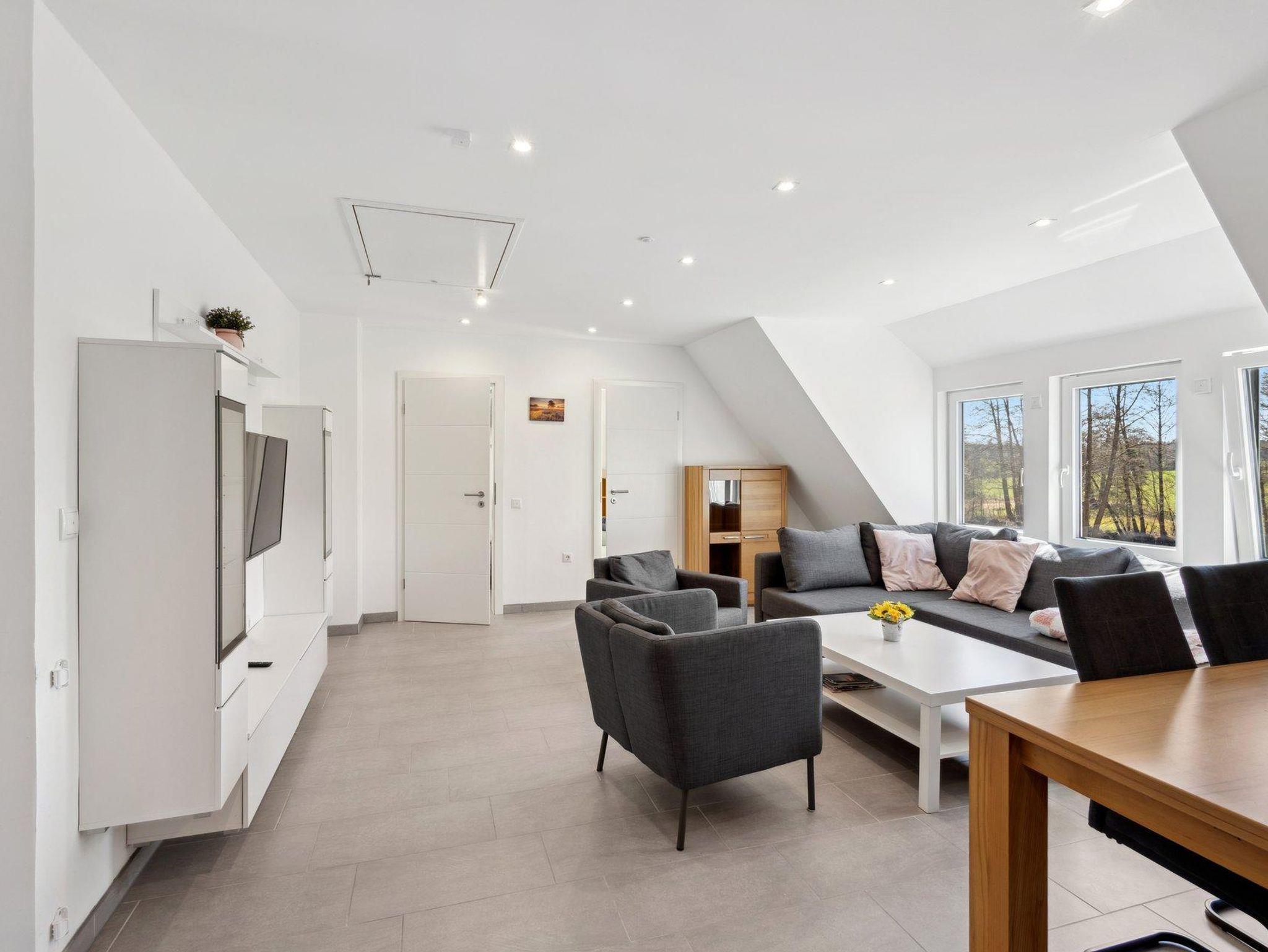 Diese Ferienwohnung bietet Komfort für bis zu 6 Personen. Der zentrale Wohnbereich vereint Wohnzimmer und Küche zu einer großzügigen Wohnküche – ausgestattet mit einem Kaffeevollautomat, einer Geschirrspülmaschine und einem gemütlichen Essbereich. Ein Flachbild-TV sowie ein Sofa, das sich in eine Schlafgelegenheit für die 5. und 6. Person umwandeln lässt.
