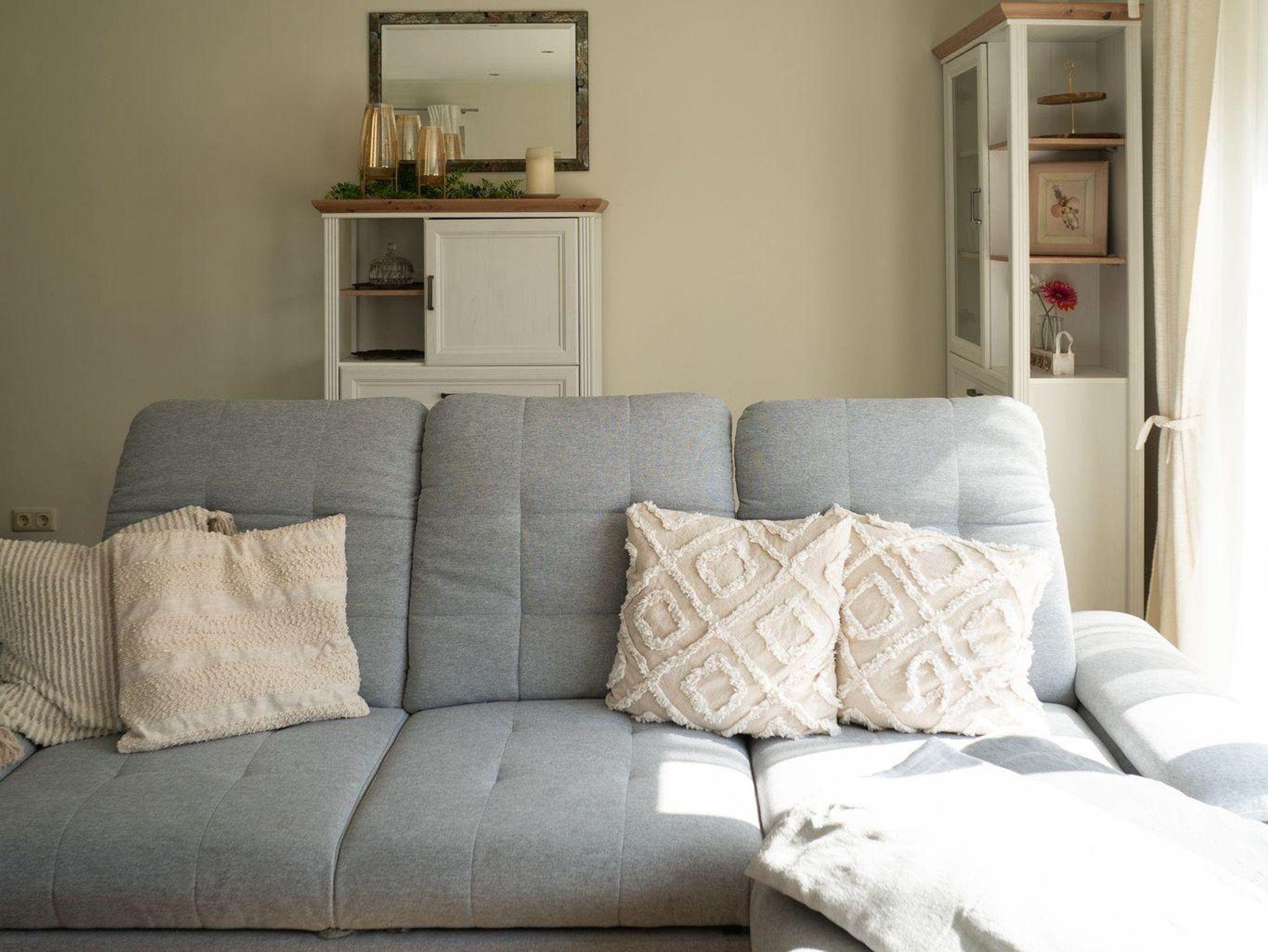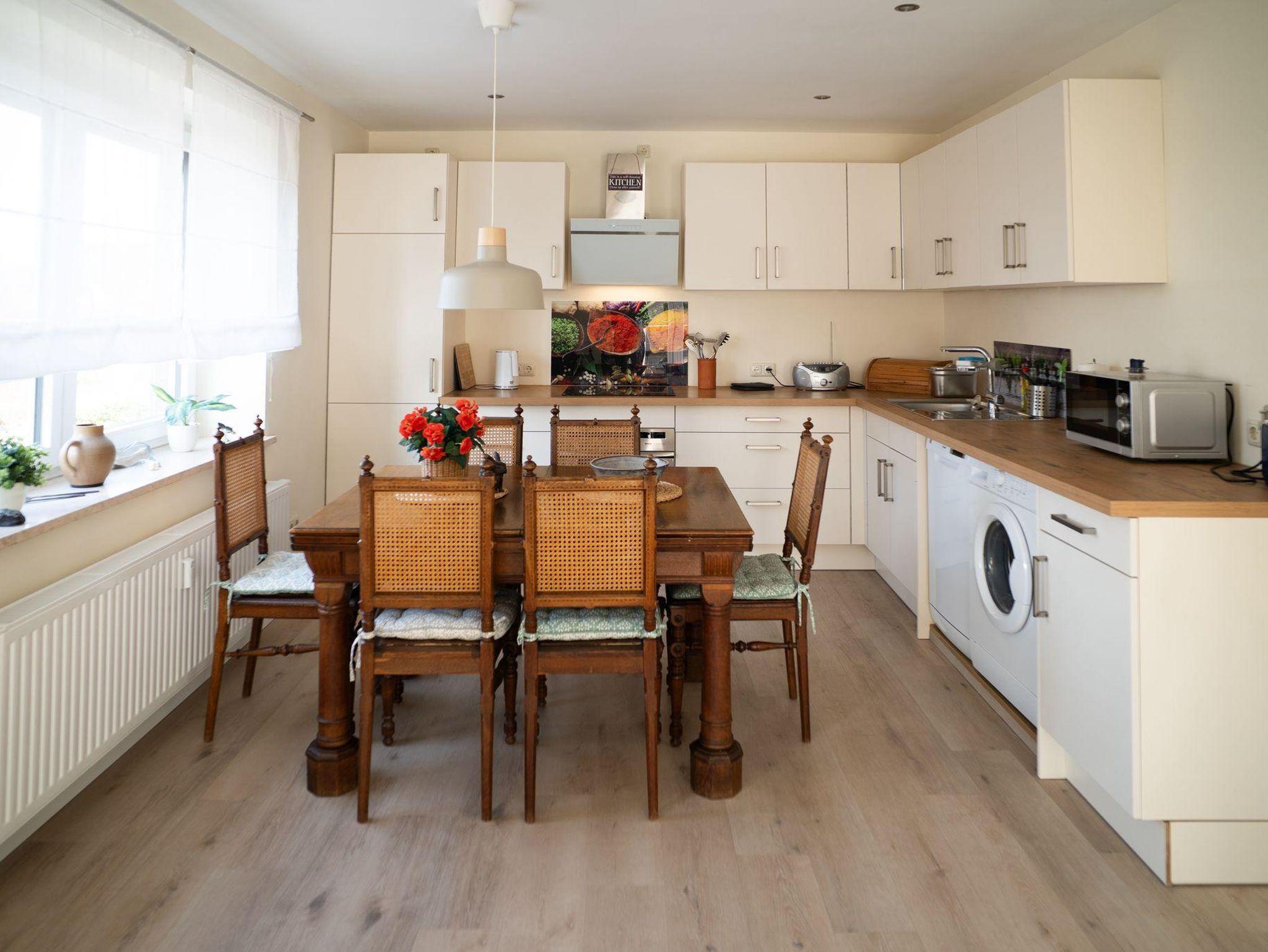 Hell und modern eingerichtete Ferienwohnung im Erdgeschoss. Die Ferienwohnung verfügt über eine Wohnküche mit vollausgestatteter Küchenzeile und Essgelegenheit, ein Schlafzimmer mit einem 1,80 m großen Boxspringbett und TV und ein Bad mit Dusche und WC welches barrierearm ist. Die großzügige Terrasse ist vom Wohnzimmer erreichbar. Im Bad und im Wohnzimmerbereich ist die Ferienwohnung mit einer Fußbodenheizung ausgestattet.
