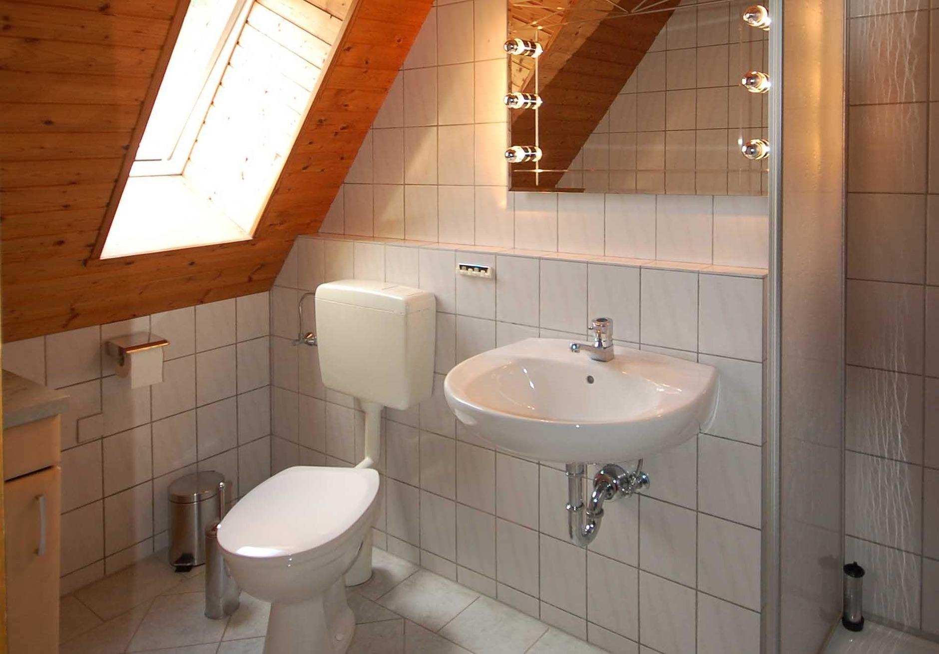 Das Badezimmer ist mit einer Dusche, WC und Waschbecken versehen.