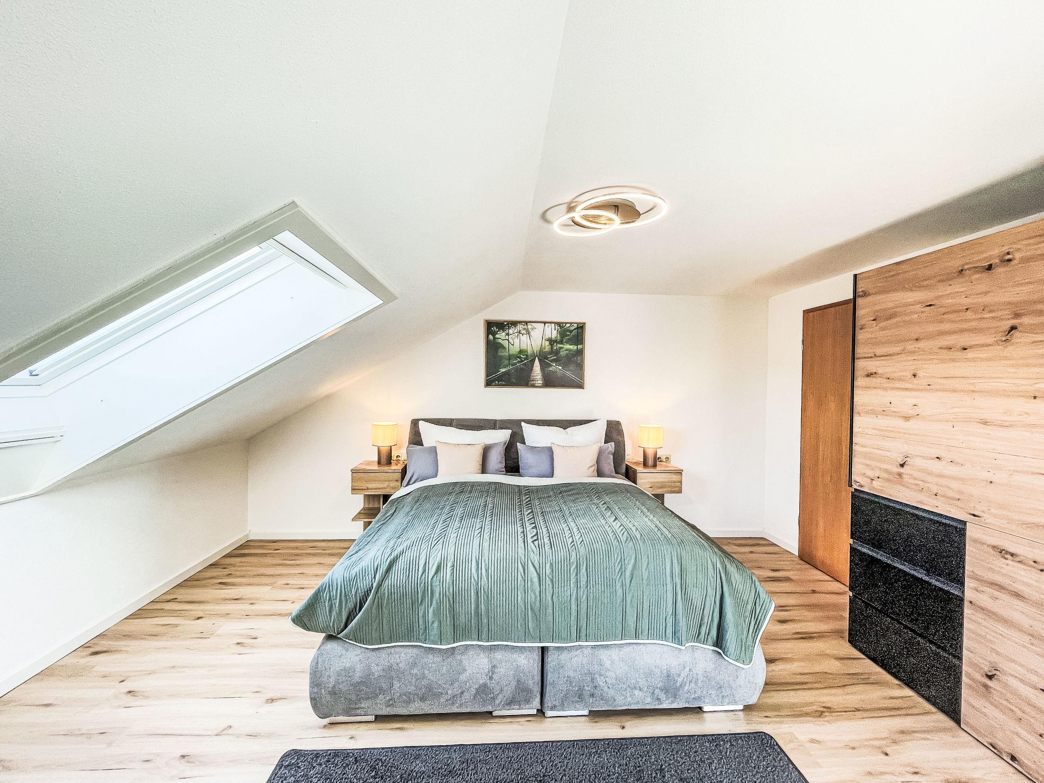 "Alexanders Domizil", 4-room apartment 104 m2 on 1st floor. Bright, partly with sloping ceilings, fully renovated in 2025, tasteful and stylish furnishings: large living/dining room with sloping ceilings with 1 sofabed (160 cm, length 200 cm). 2 rooms, each room with 1 bed (90 cm, length 200 cm). 1 double bedroom with 1 double bed (1 x 180 cm, length 200 cm). Open kitchen 8 m2 (oven, dishwasher, 4 ceramic glass hob hotplates, toaster, kettle, microwave, electric coffee machine). Shower/WC, sep. WC. Heating. Parquet floors. Small balcony 5 m2, west facing position, large balcony 10 m2, east facing position. Very beautiful panoramic view of the mountains and the ski run. Facilities: Internet (WiFi, free).