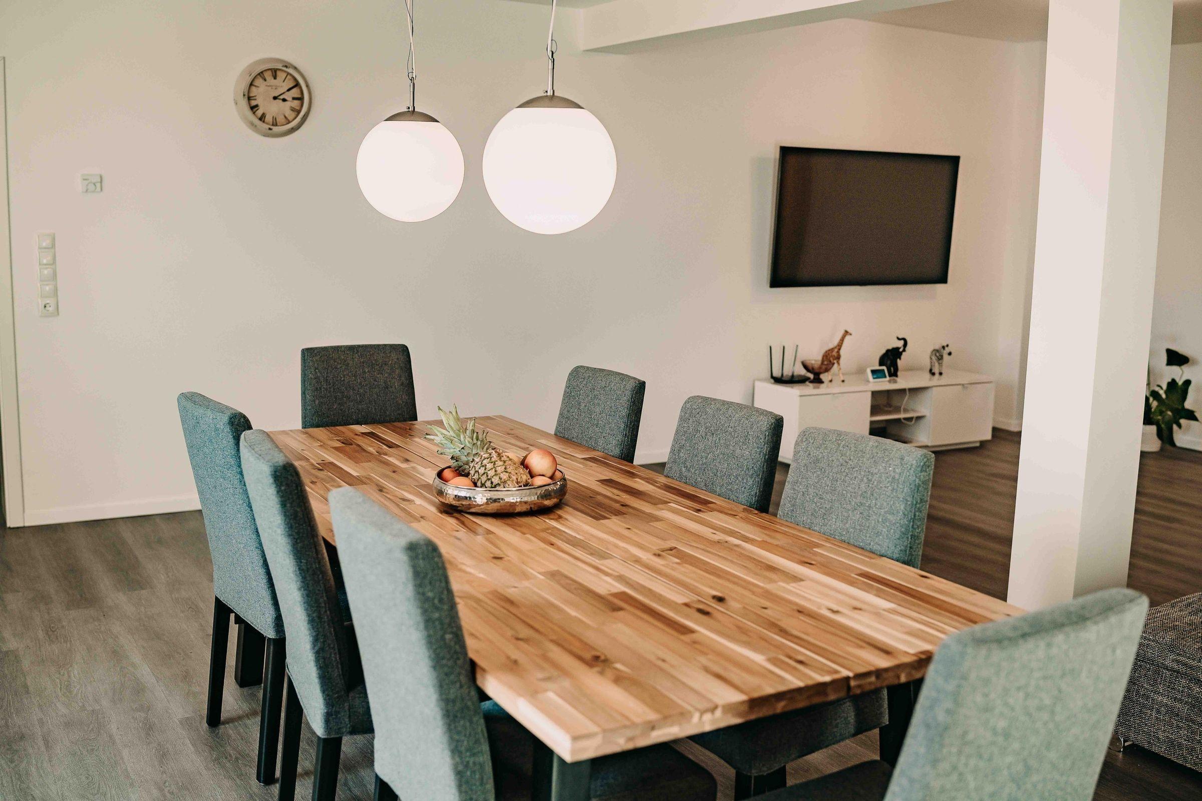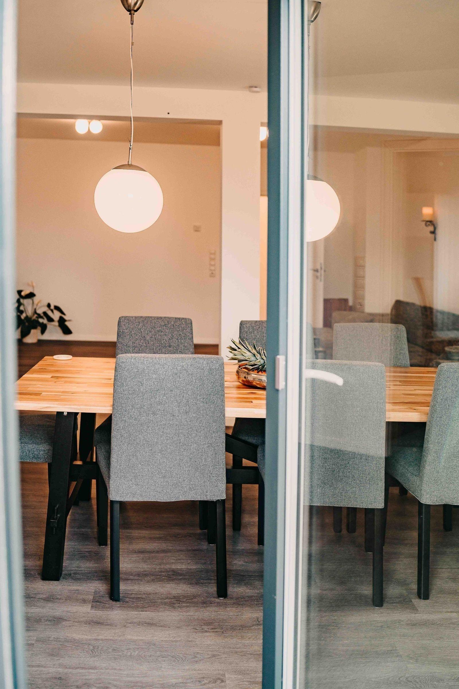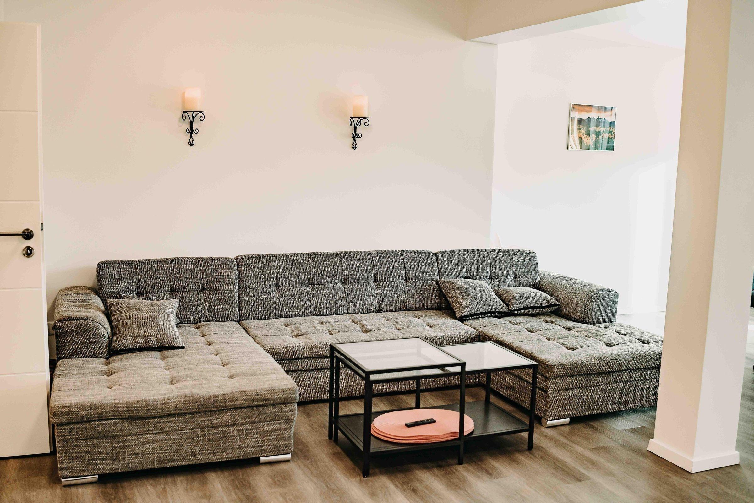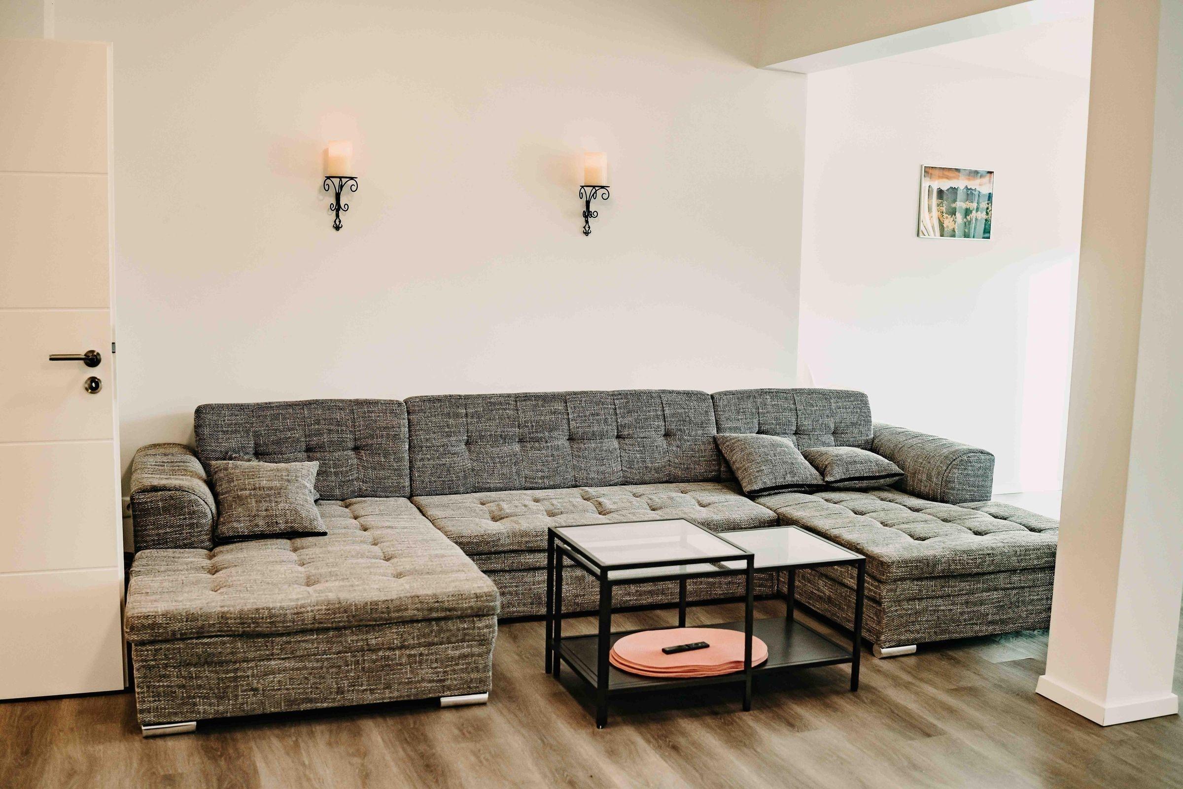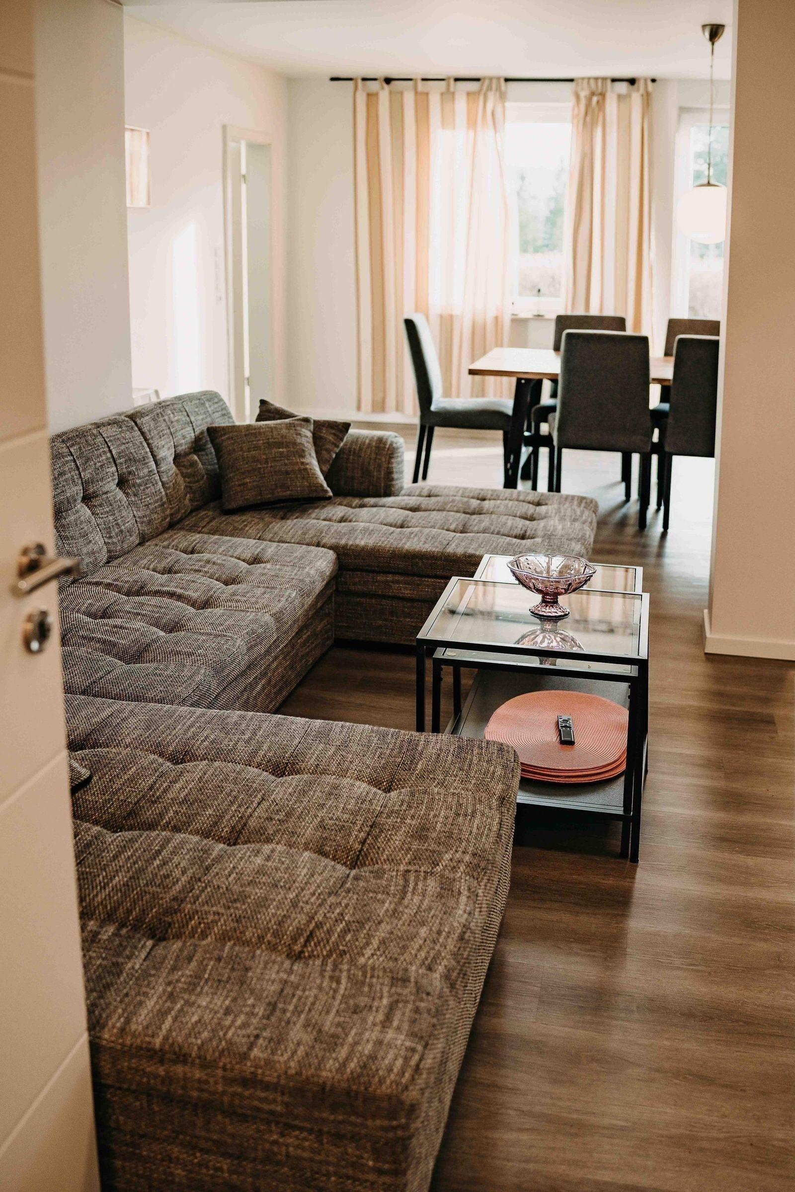 Die Ferienwohnung bietet einen großzügigen Wohnraum mit einem einladenden Wohnschlafzimmer, das mit einer Schlafcouch, einem Sofa und Sessel ausgestattet ist. Vier Schlafzimmer, darunter drei mit Doppelbetten und eines mit zwei Einzelbetten, gewährleisten einen komfortablen Aufenthalt für bis zu zehn Personen. Die separate Küche ist modern eingerichtet und verfügt über einen Elektro-/Gasherd, einen Backofen, eine Mikrowelle sowie einen Geschirrspüler und Kühlschrank. Eine Kaffeemaschine, Toaster und Gefriermöglichkeit runden die Ausstattung ab. Das Badezimmer ist mit einer bodengleichen Dusche und einer Badewanne ausgestattet, zusätzlich steht ein Gäste-WC zur Verfügung. Komfort wie Fußbodenheizung, TV und Waschmaschine sorgt für ein behagliches Ambiente. Ein Esstisch im Wohnbereich lädt zu gemeinsamen Mahlzeiten ein. Ein Parkplatz ist ebenfalls vorhanden. Geschirr, Besteck und Geschirrtücher sind selbstverständlich vorhanden.