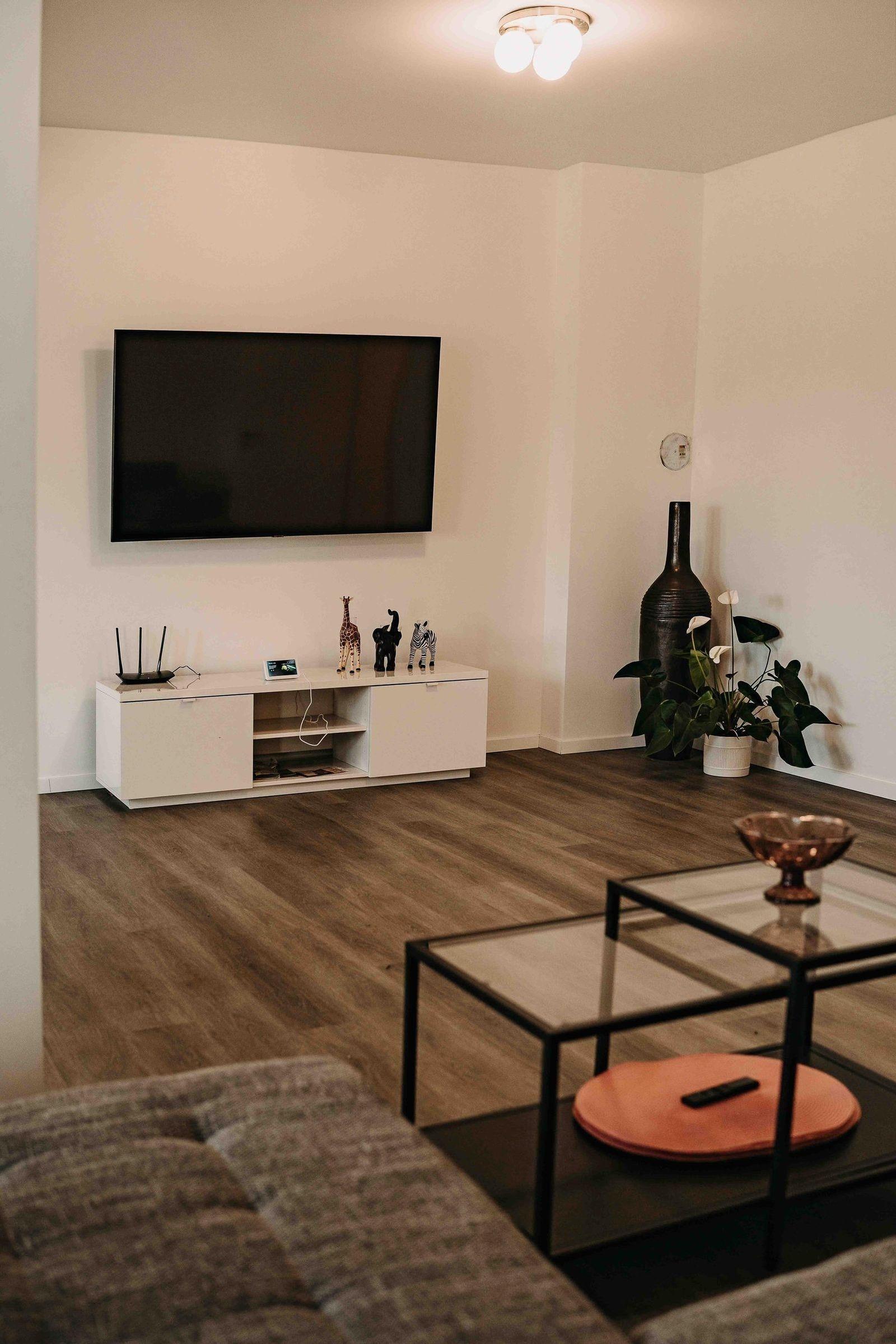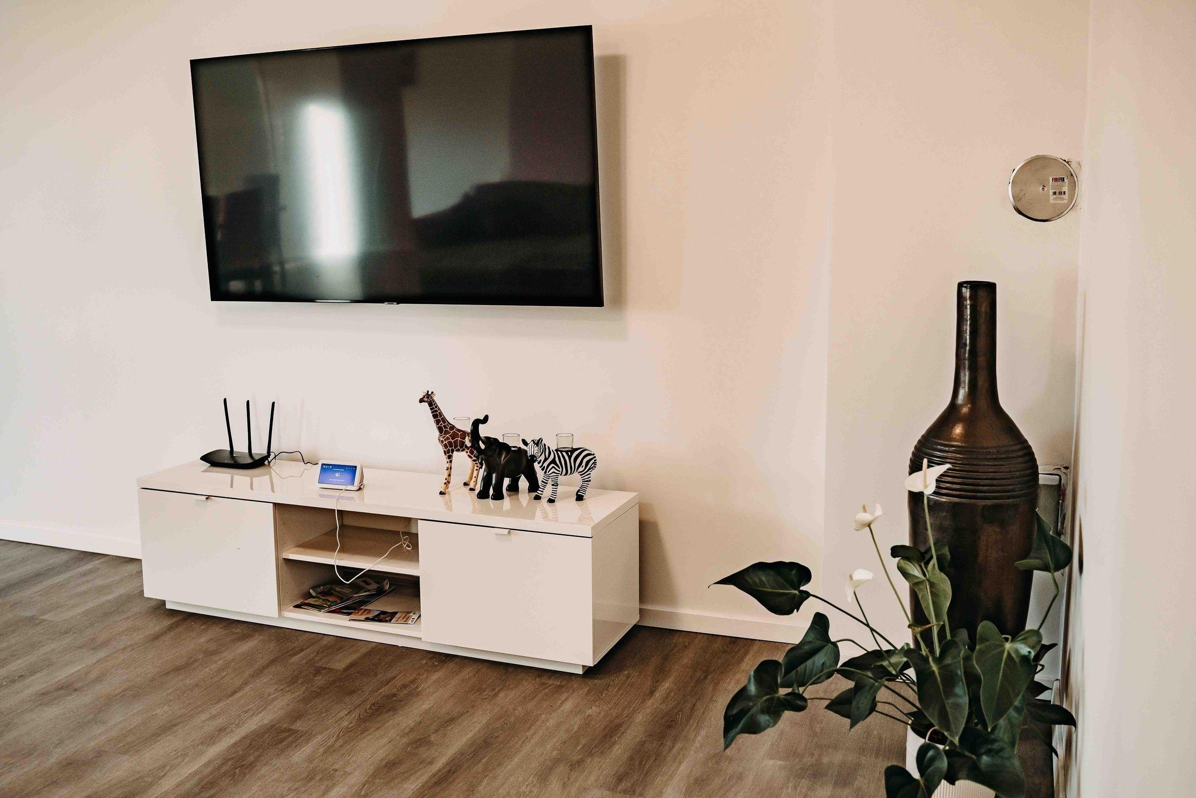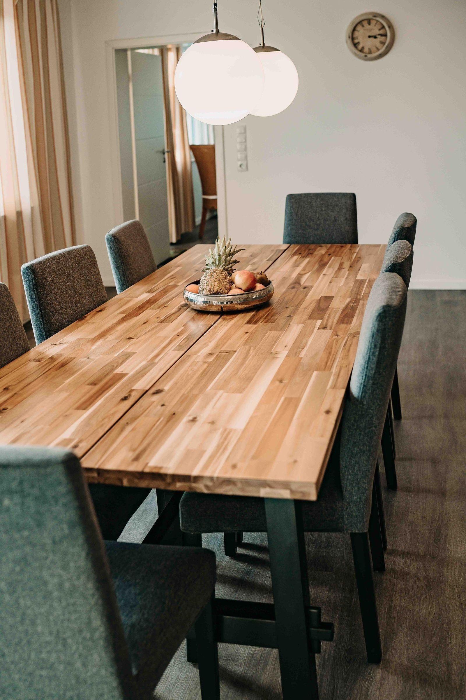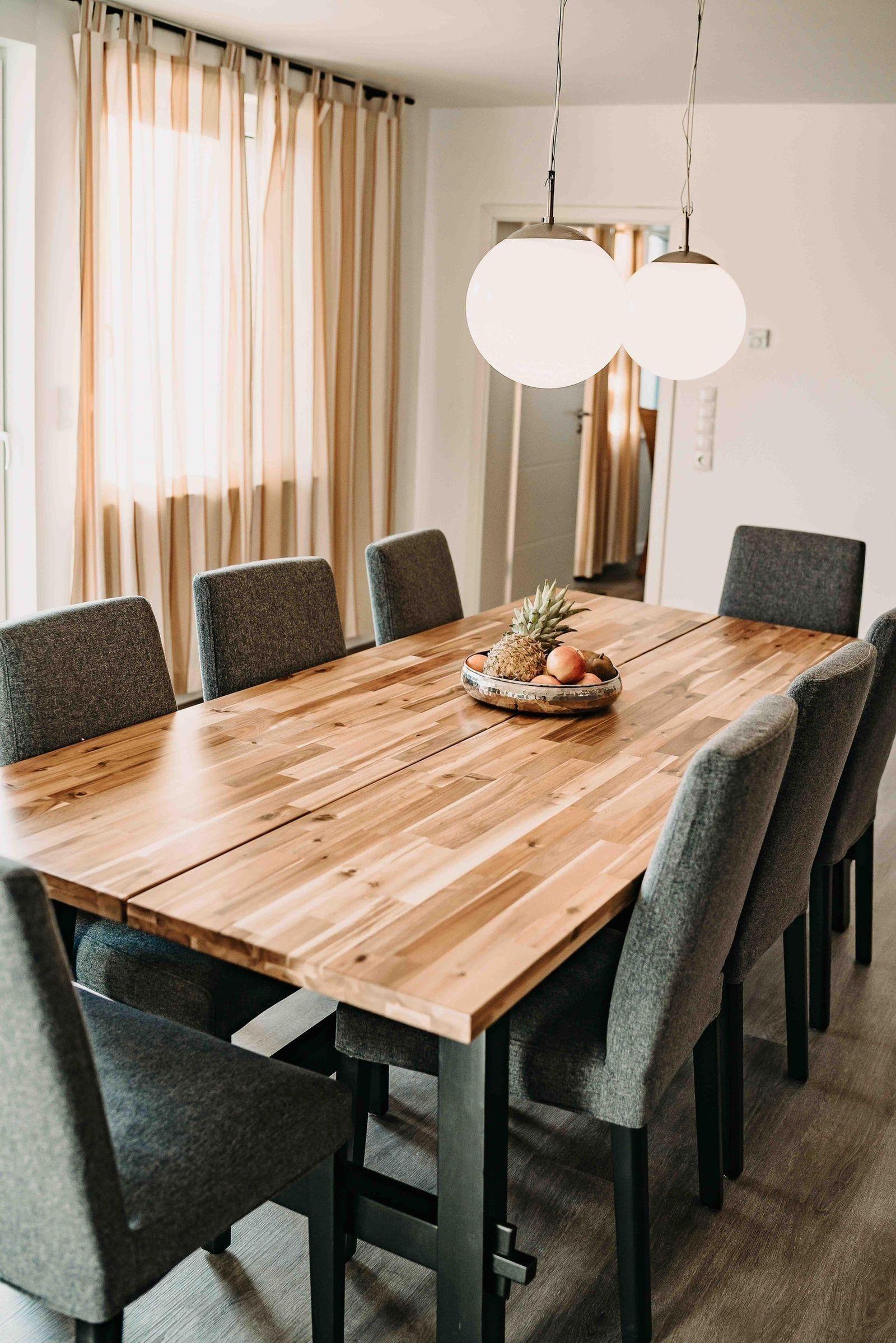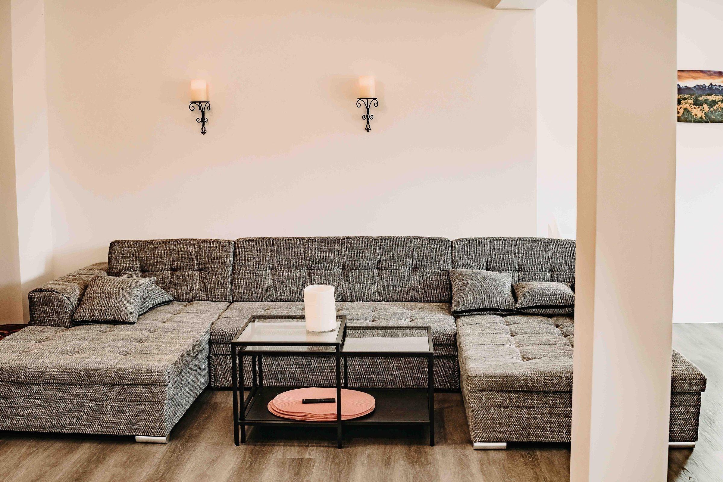 Die Ferienwohnung bietet einen großzügigen Wohnraum mit einem einladenden Wohnschlafzimmer, das mit einer Schlafcouch, einem Sofa und Sessel ausgestattet ist. Vier Schlafzimmer, darunter drei mit Doppelbetten und eines mit zwei Einzelbetten, gewährleisten einen komfortablen Aufenthalt für bis zu zehn Personen. Die separate Küche ist modern eingerichtet und verfügt über einen Elektro-/Gasherd, einen Backofen, eine Mikrowelle sowie einen Geschirrspüler und Kühlschrank. Eine Kaffeemaschine, Toaster und Gefriermöglichkeit runden die Ausstattung ab. Das Badezimmer ist mit einer bodengleichen Dusche und einer Badewanne ausgestattet, zusätzlich steht ein Gäste-WC zur Verfügung. Komfort wie Fußbodenheizung, TV und Waschmaschine sorgt für ein behagliches Ambiente. Ein Esstisch im Wohnbereich lädt zu gemeinsamen Mahlzeiten ein. Ein Parkplatz ist ebenfalls vorhanden. Geschirr, Besteck und Geschirrtücher sind selbstverständlich vorhanden.
