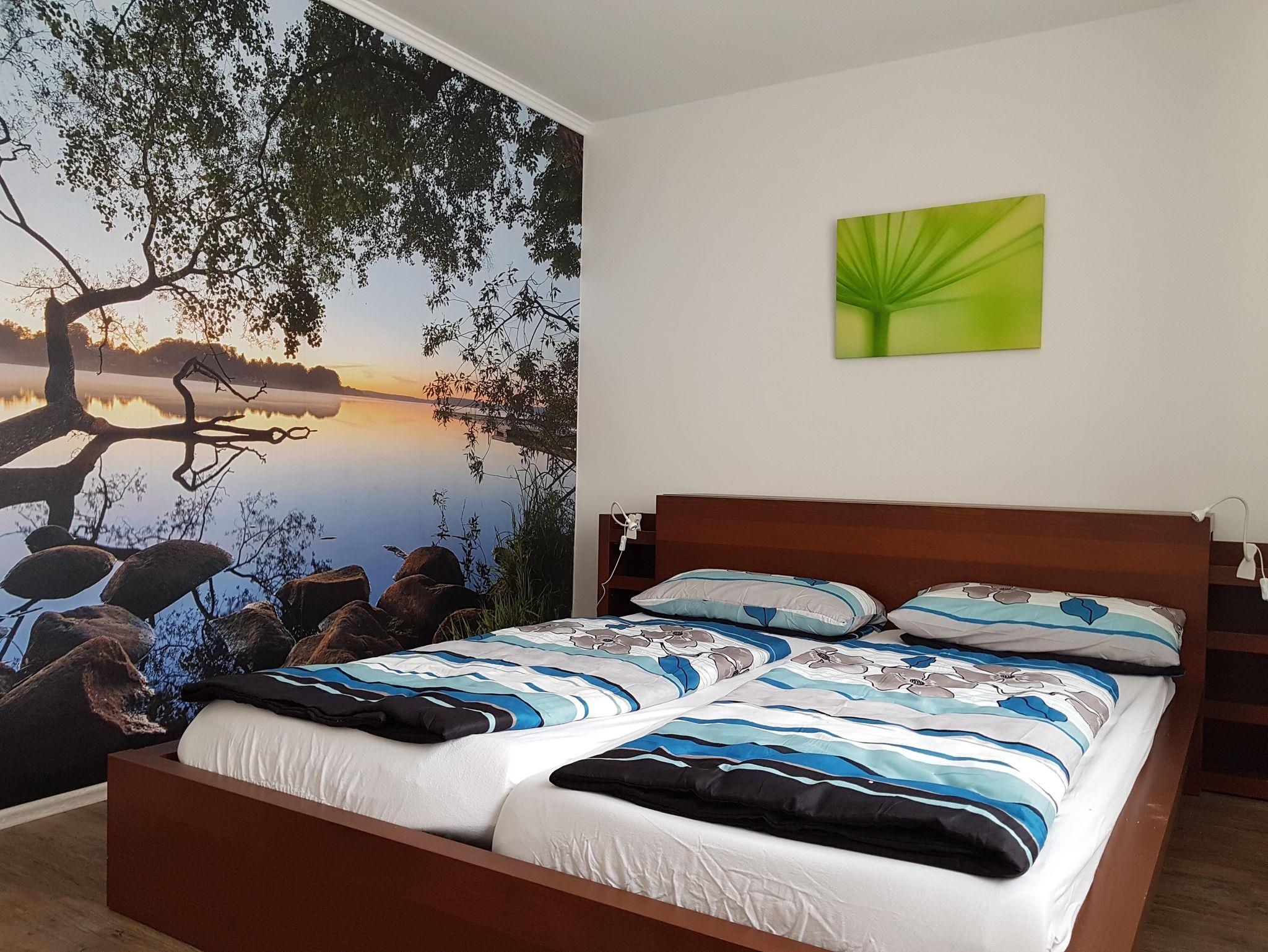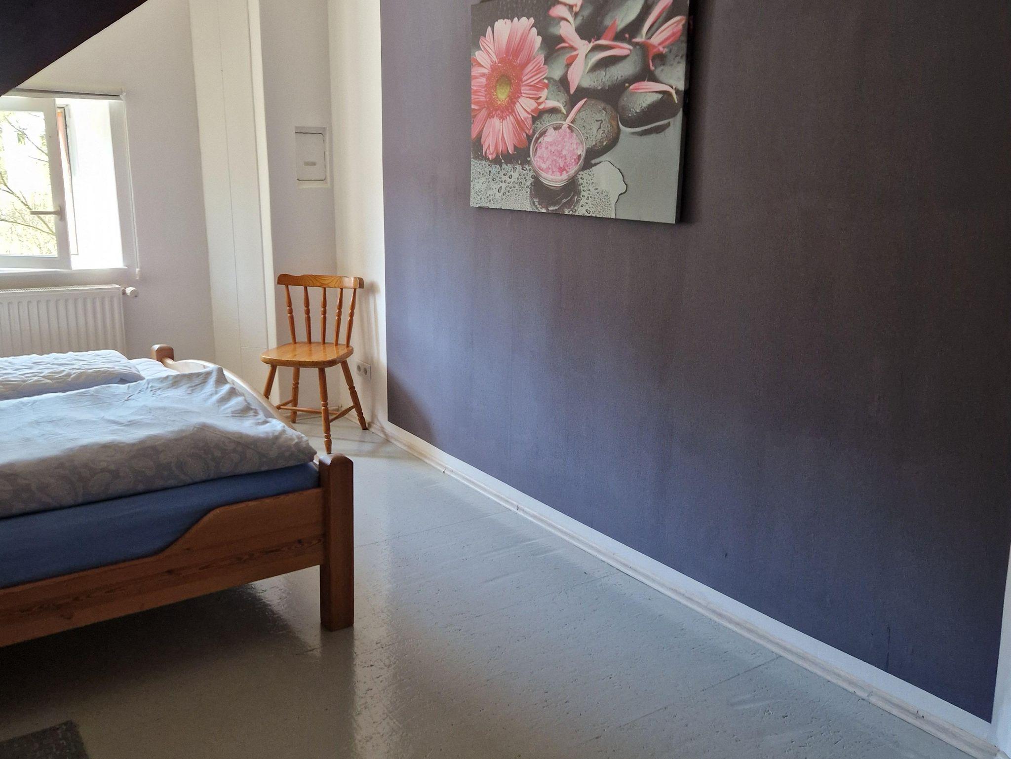 Diese Ferienwohnung verfügt über 2 Schlafzimmer, eins mit einem Doppelbett (1,60m) und eins mit 2 Einzelbetten, welches über einen außen liegenden Flur zu erreichen ist, sowie ein Kinderreisebett, eine Küche mit einem Geschirrspüler. Im Wohnbereich befindet sich ein Flachbild-TV, ein Sitzbereich und das Bad hat eine Dusche und Fussbodenheizung. Waschmachine ist auch vorhanden und kann kostenlos genutzt werden. Bei schönem Wetter kann man im Freien sitzen und grillen. WLAN ist kostenlos, jedoch in unserer ländlichen Region noch nicht wünschenswert ausgebaut. Maximal 2 Hunde sind erlaubt.