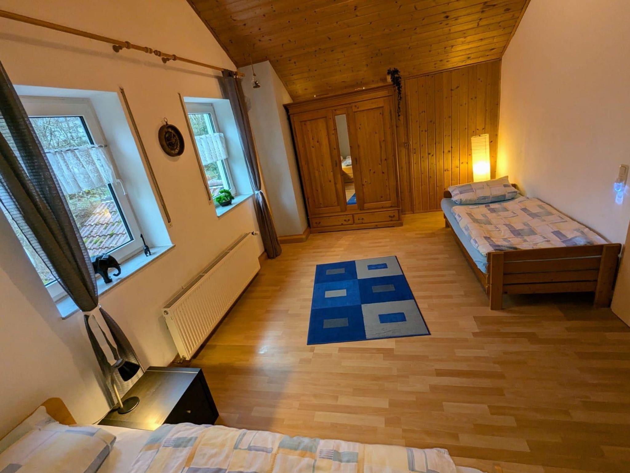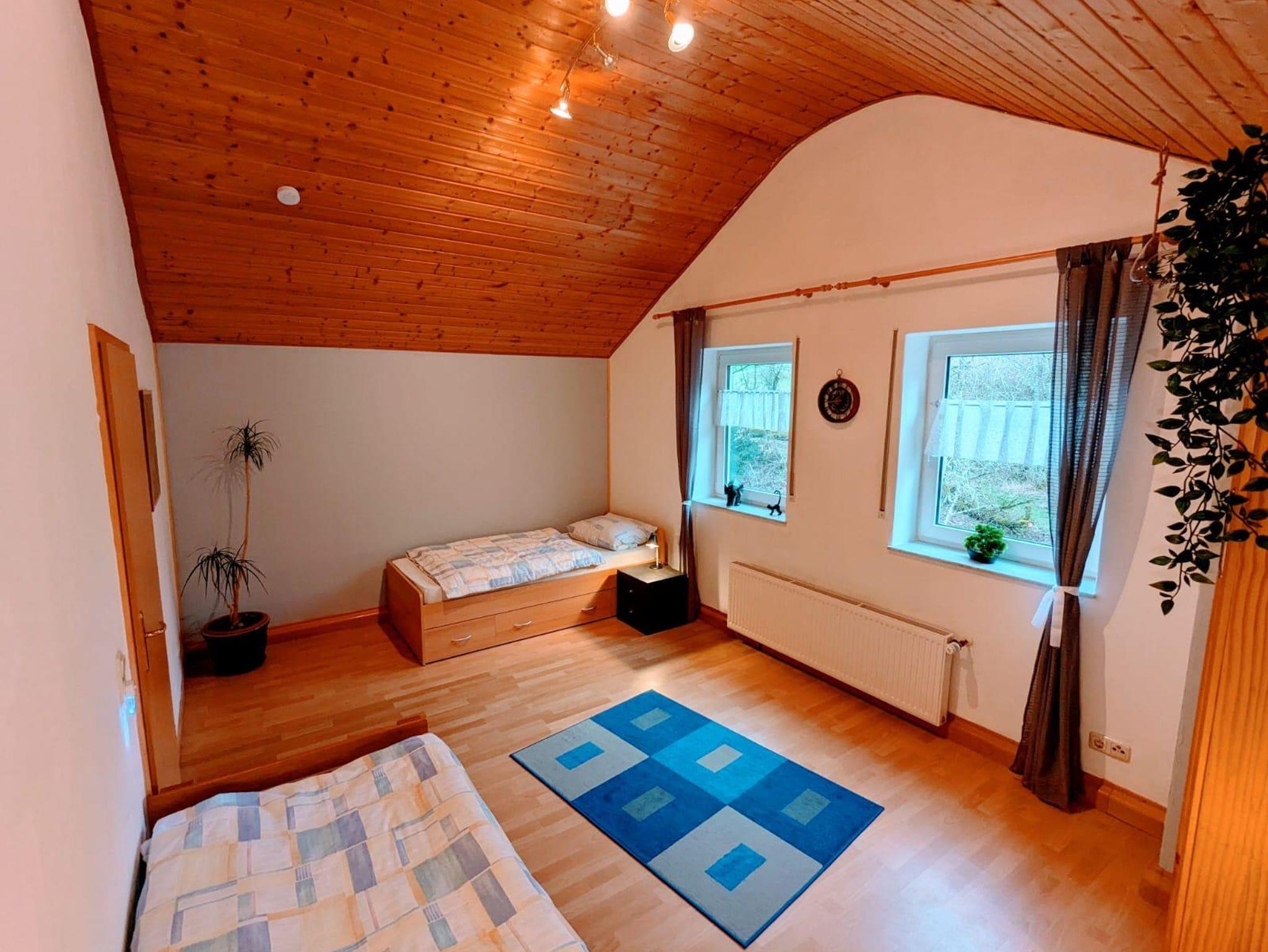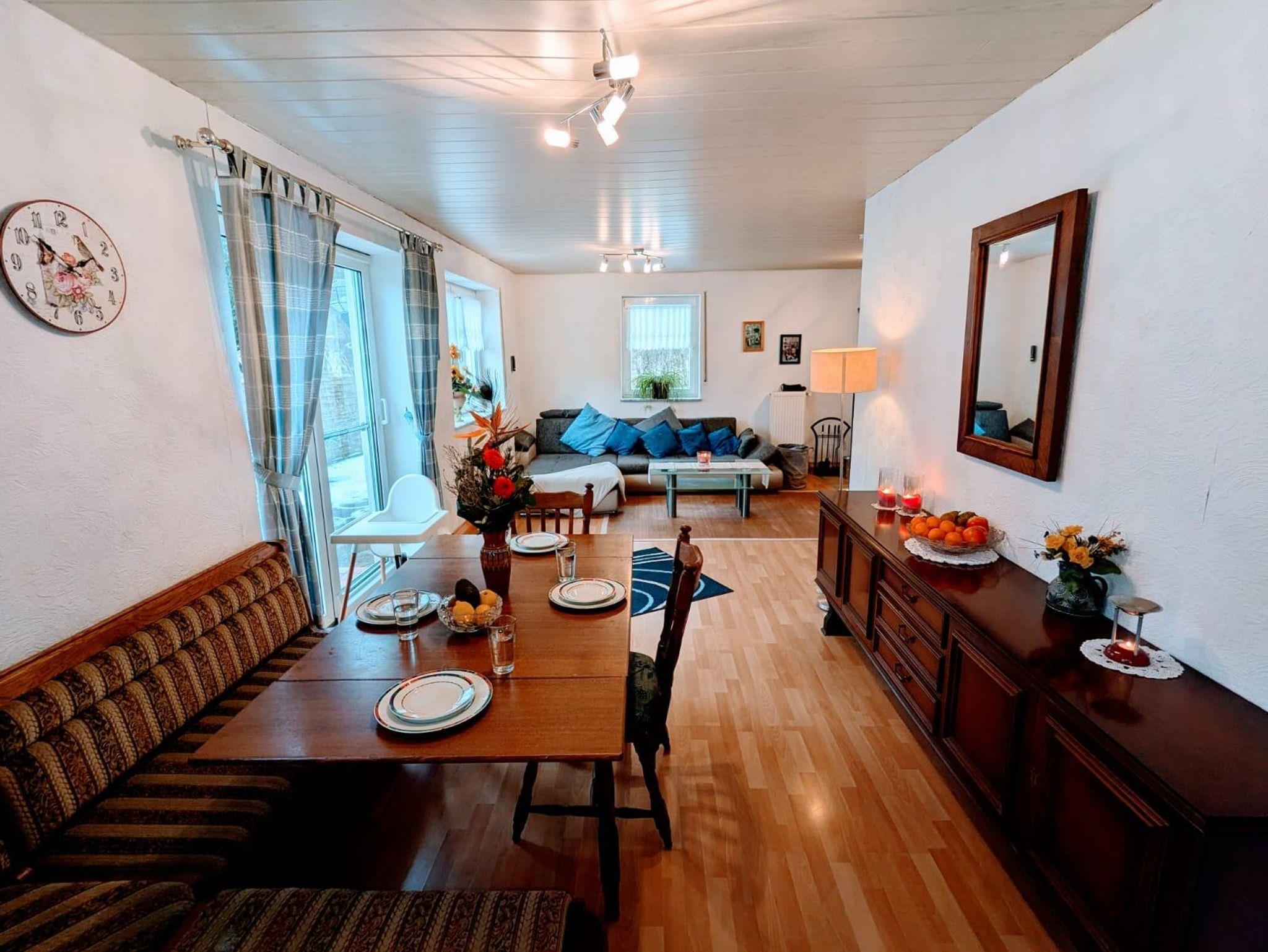 Liebe Gäste, unser Haus bietet, gerade für Familien, eine super Abwechslung zu dem Stress der Städte. Ein geräumiger und offener Küche-Ess-Wohnbereich, mit Blick in den Garten lässt Sie alles überblicken. Das Elternschlafzimmer im Erdgeschoss ist geräumig und bietet Platz für ein Kinderbettchen. Unten gibt es eine Toilette und ein separates Bad mit Badewanne, die zum genießen nach einer Waldwanderung einlädt. Im Obergeschoss finden Sie zwei weitere Schlafzimmer vor. Eines mit Doppelbett und das andere mit zwei separaten Betten. Ebenso ein weiteres Bad mit Dusche und WC.