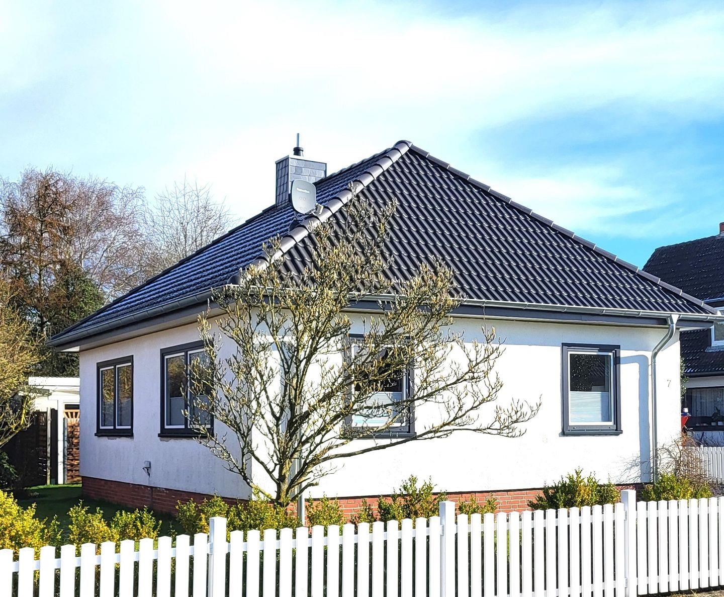 Das ebenerdige Domizil verfügt über 1 Wohn-/Esszimmer, 1 Küche, 2 Schlafräume, 1 Duschbad sowie einen 1.300 m² komplett eingezäunten Garten mit Terrasse.
