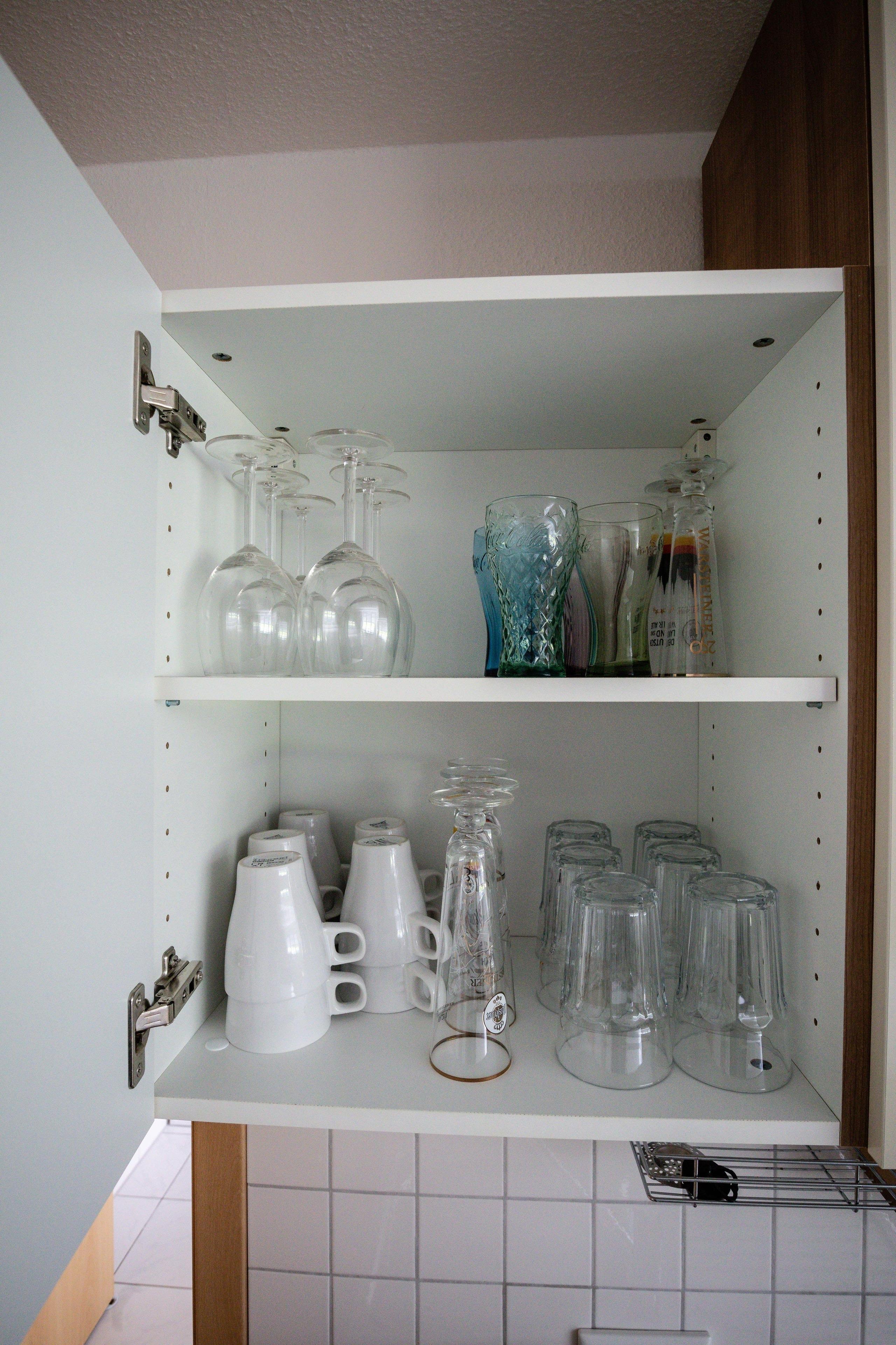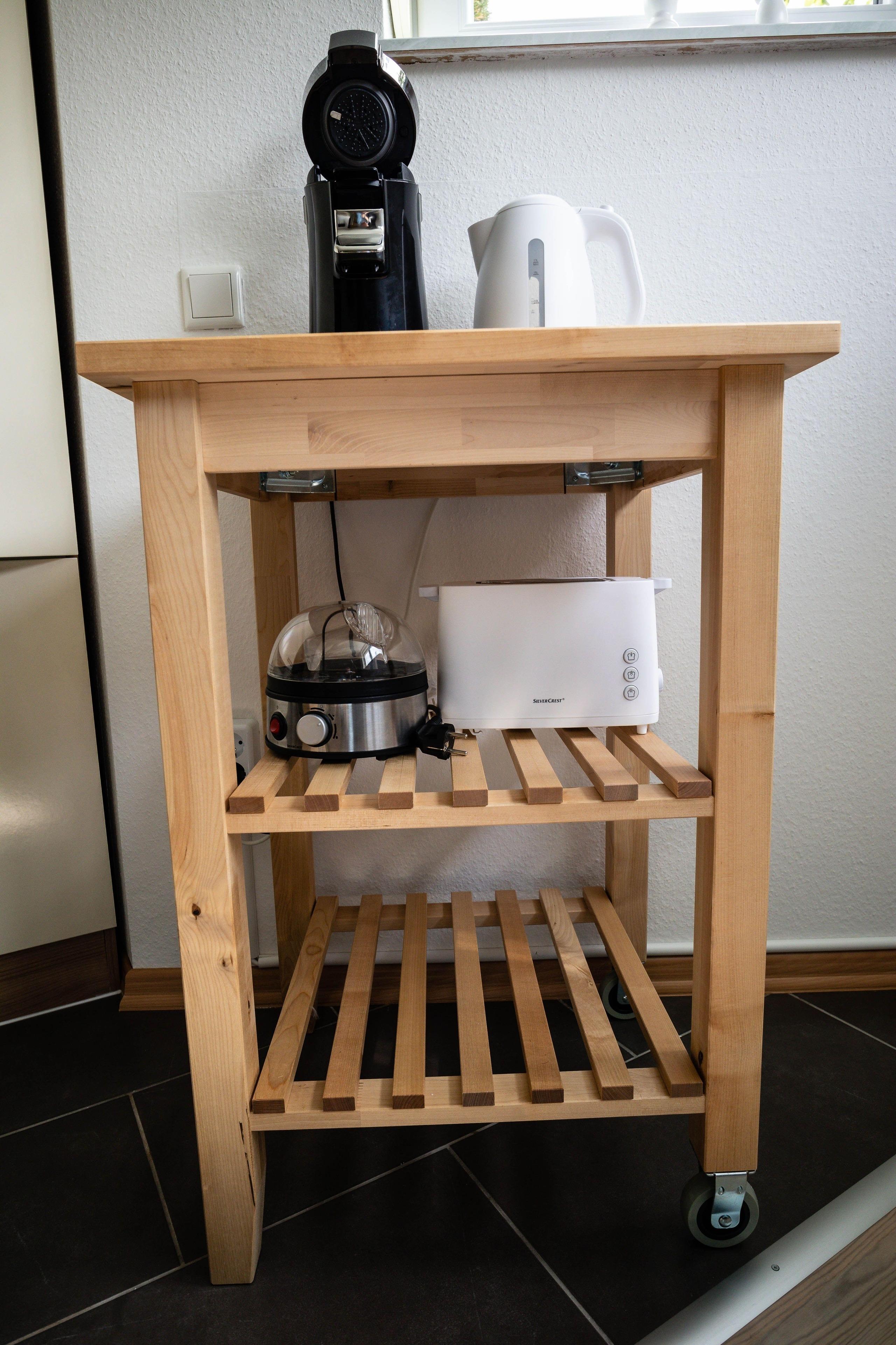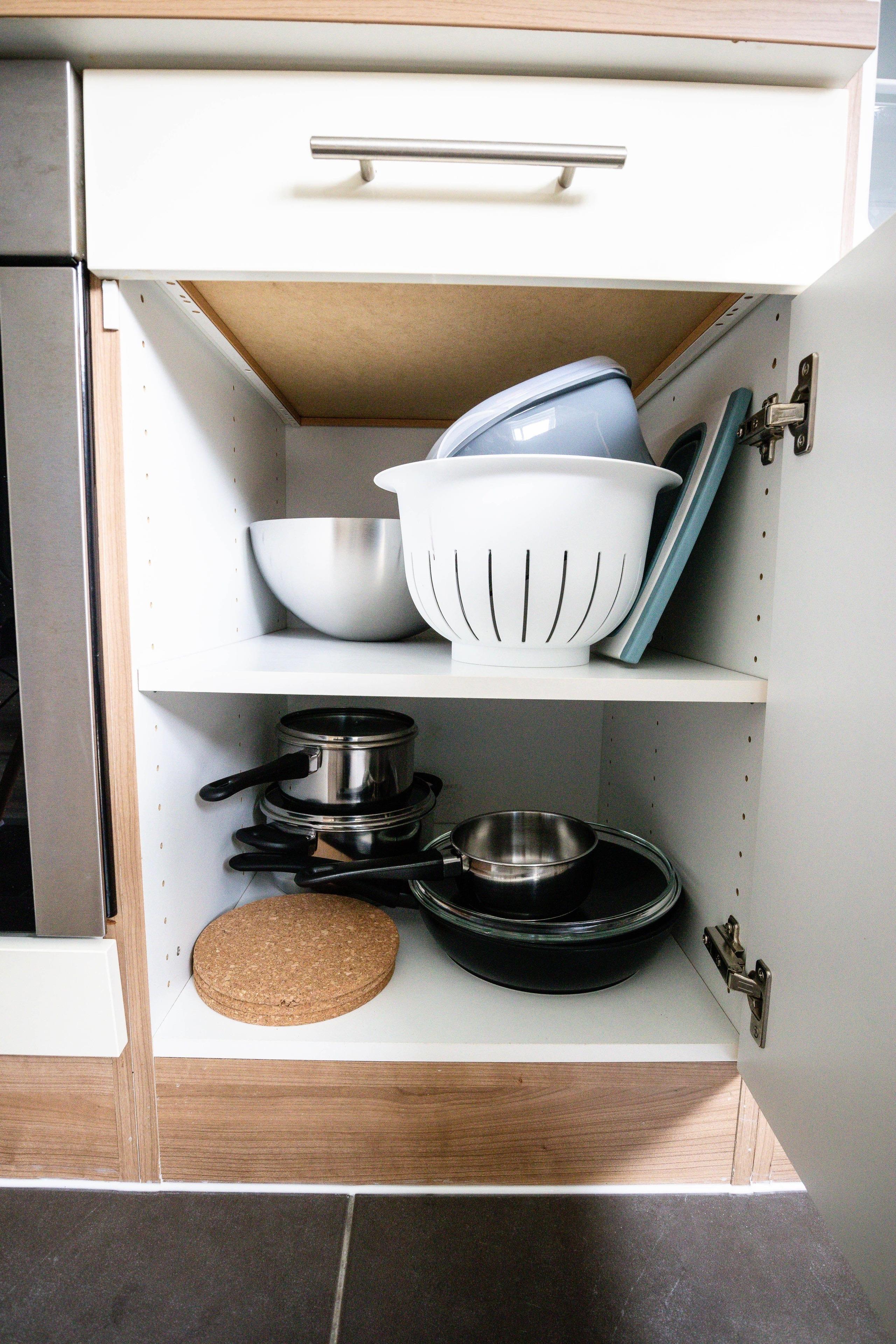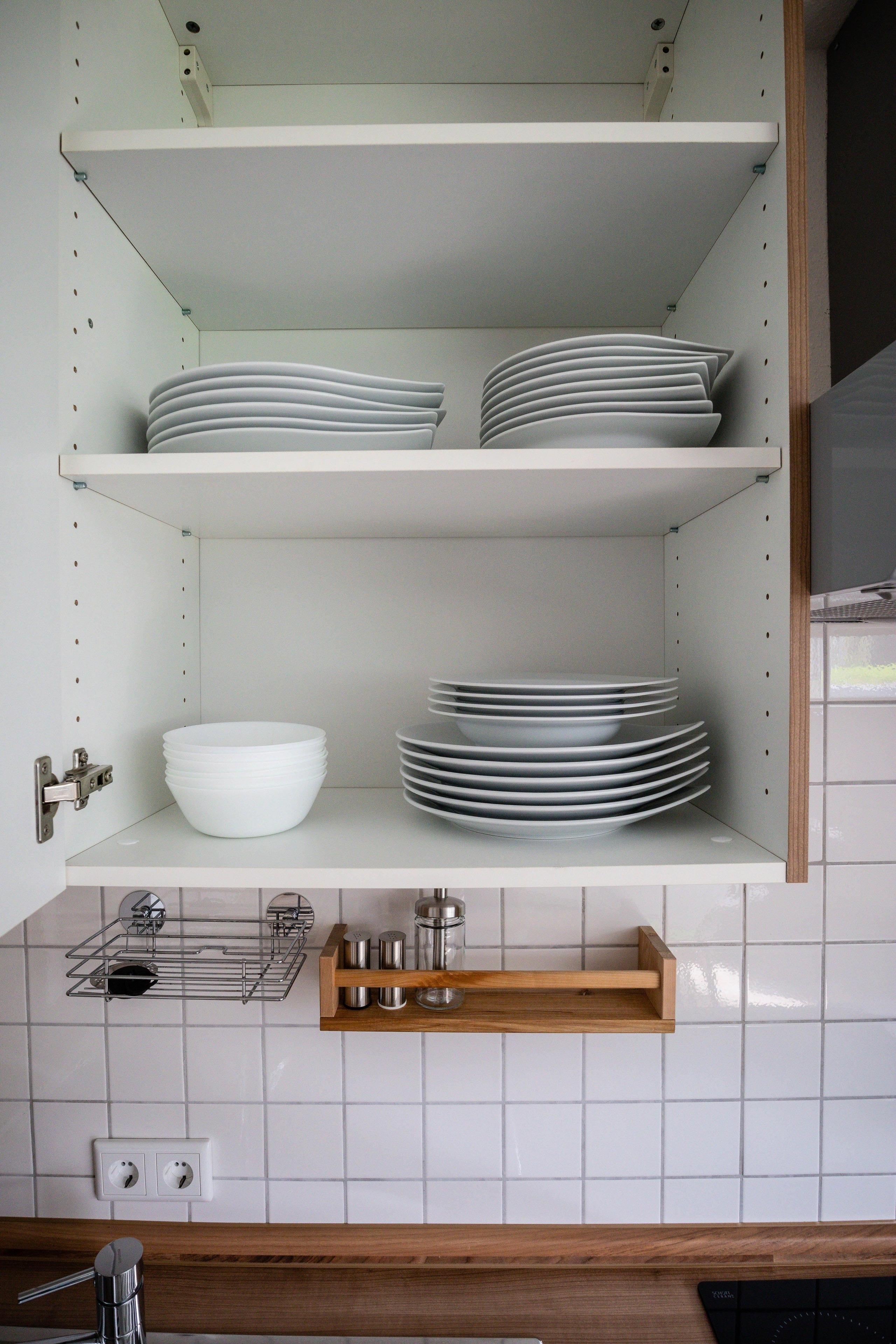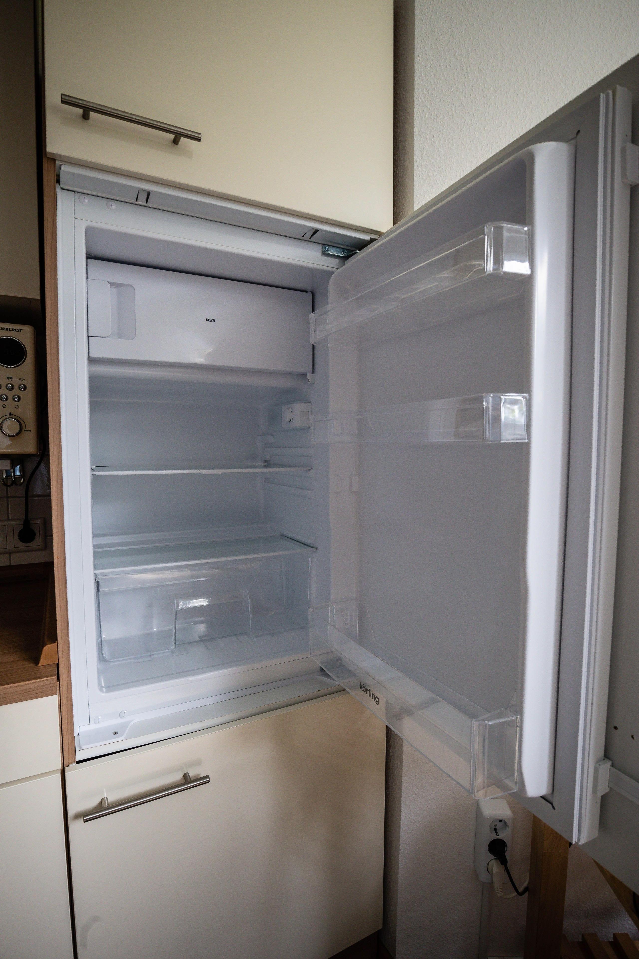 Küche: Einbauküche mit Kochfeld, Backofen, Kühlschrank mit Gefrierfach, Geschirrspüler, Geschirr, Senseo-Kaffeemaschine, Wasserkocher, Toaster, Mikrowelle