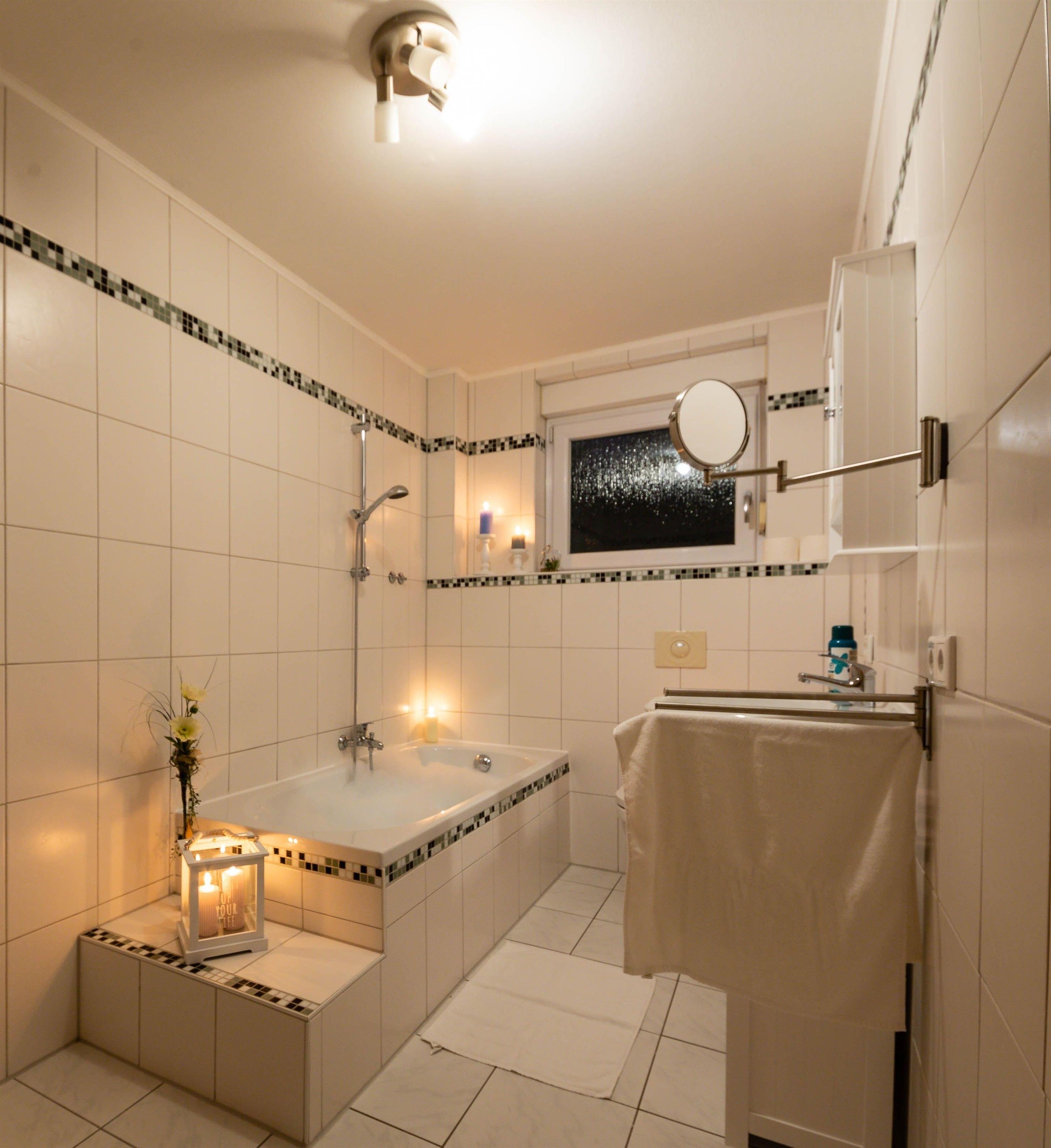 Bad: Waschbecken, Spiegel, Fön, Hänge-WC, Badewanne, Handtücher.