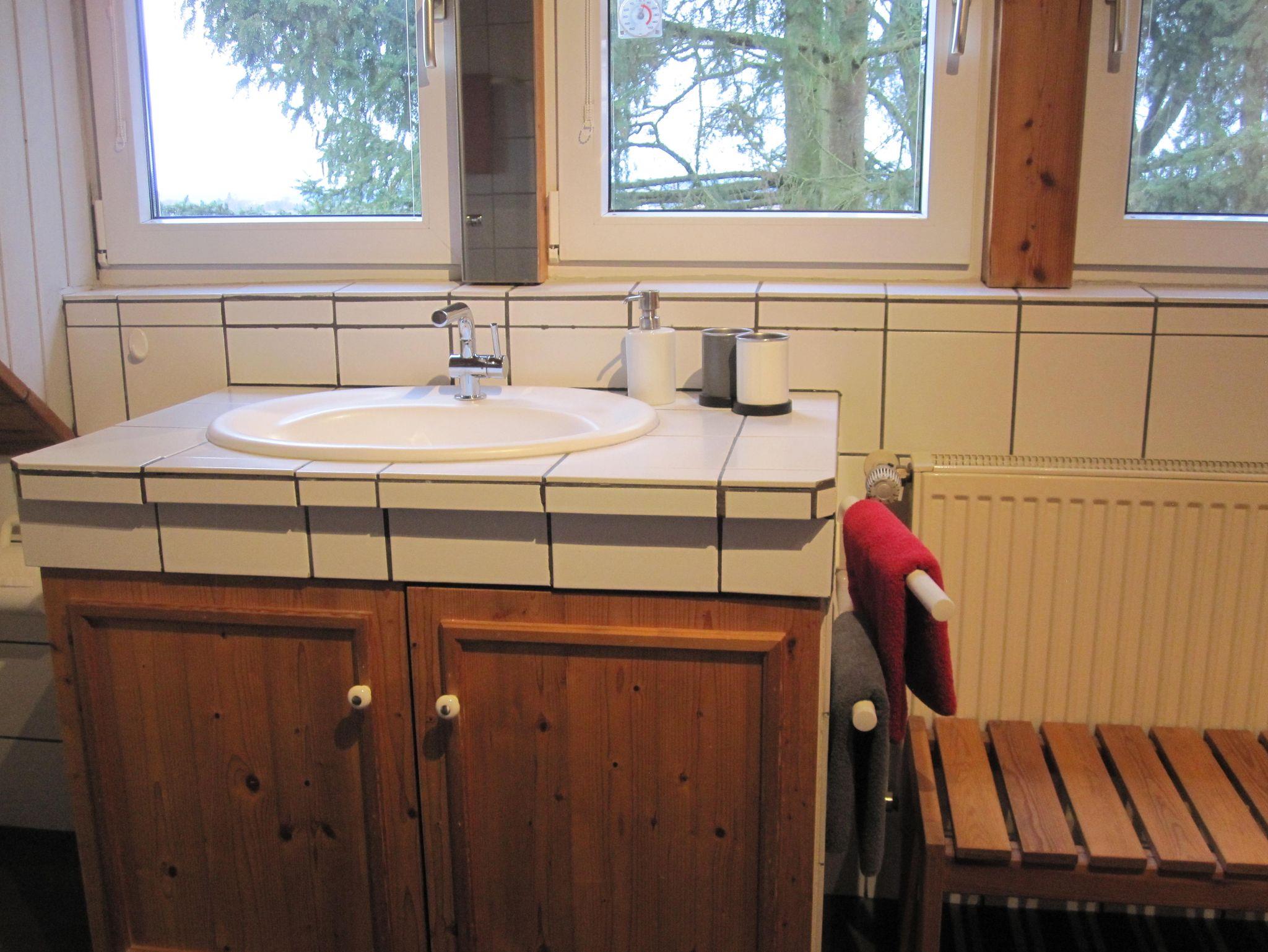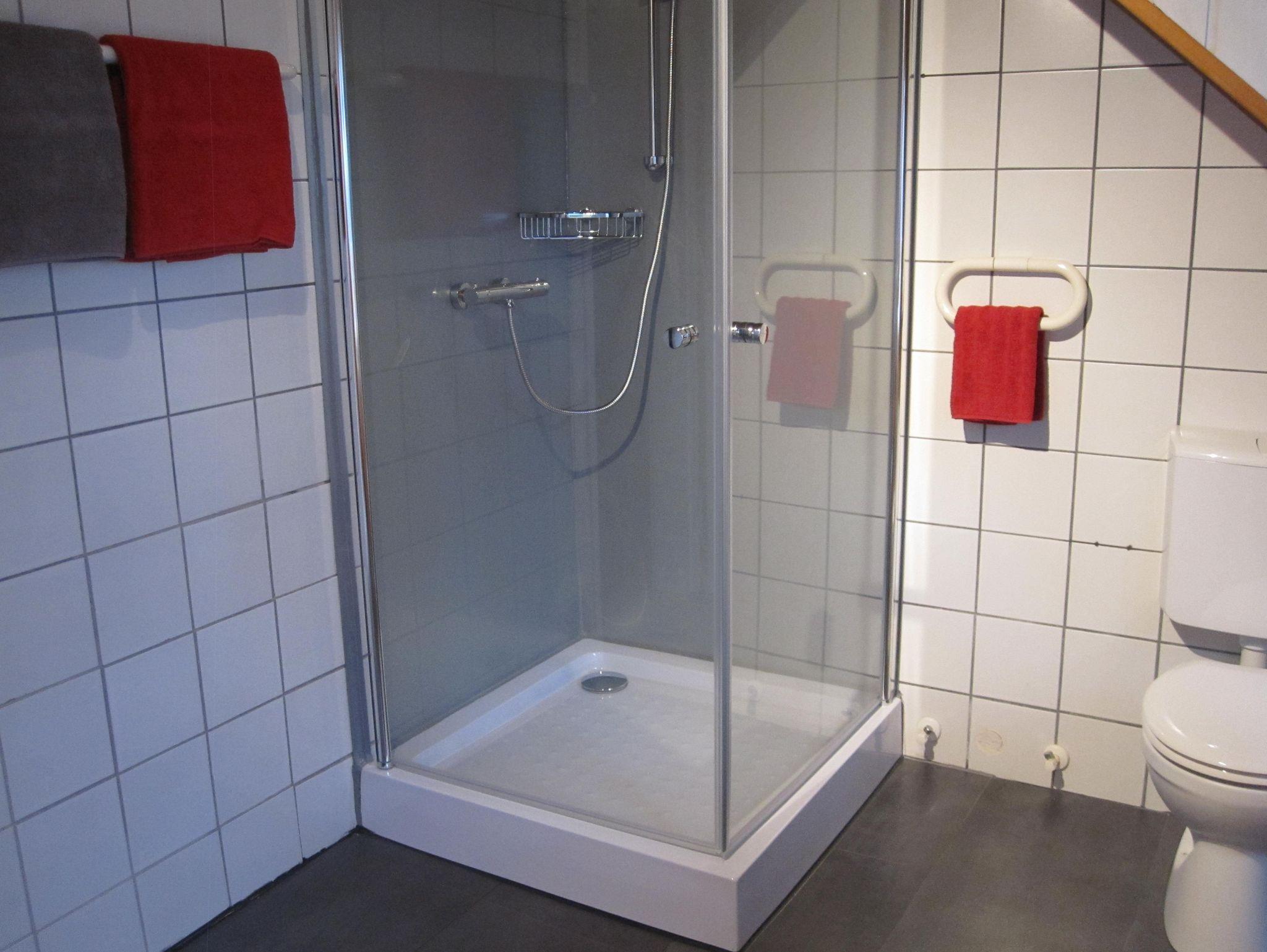 Das Badezimmer ist mit einer Badewanne ausgestattet, die mit einer Glastrennwand als Dusche genutzt werden kann. Handtücher und Föhn sind vorhanden .