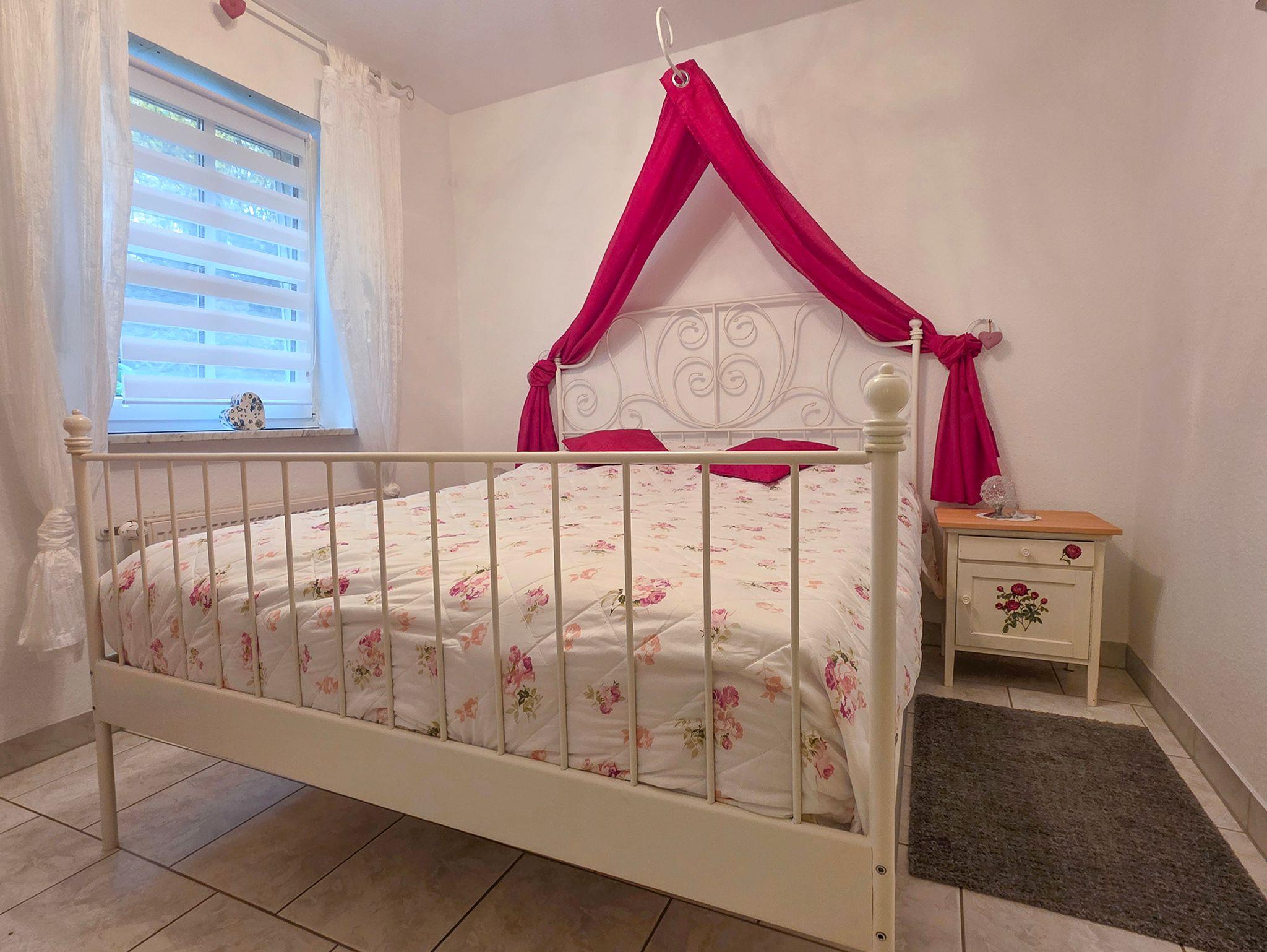 Im romantischen Schlafzimmer mit Doppelbett können sie ruhige Nächte verbringen. Das Bett ist bei ihrer Ankunft fertig bezogen, Bettwäsche ist inklusive. 2 Nachtkonsolen und 1 Sideboard befinden sich dort. Ein Babybett kann zugestellt werden.