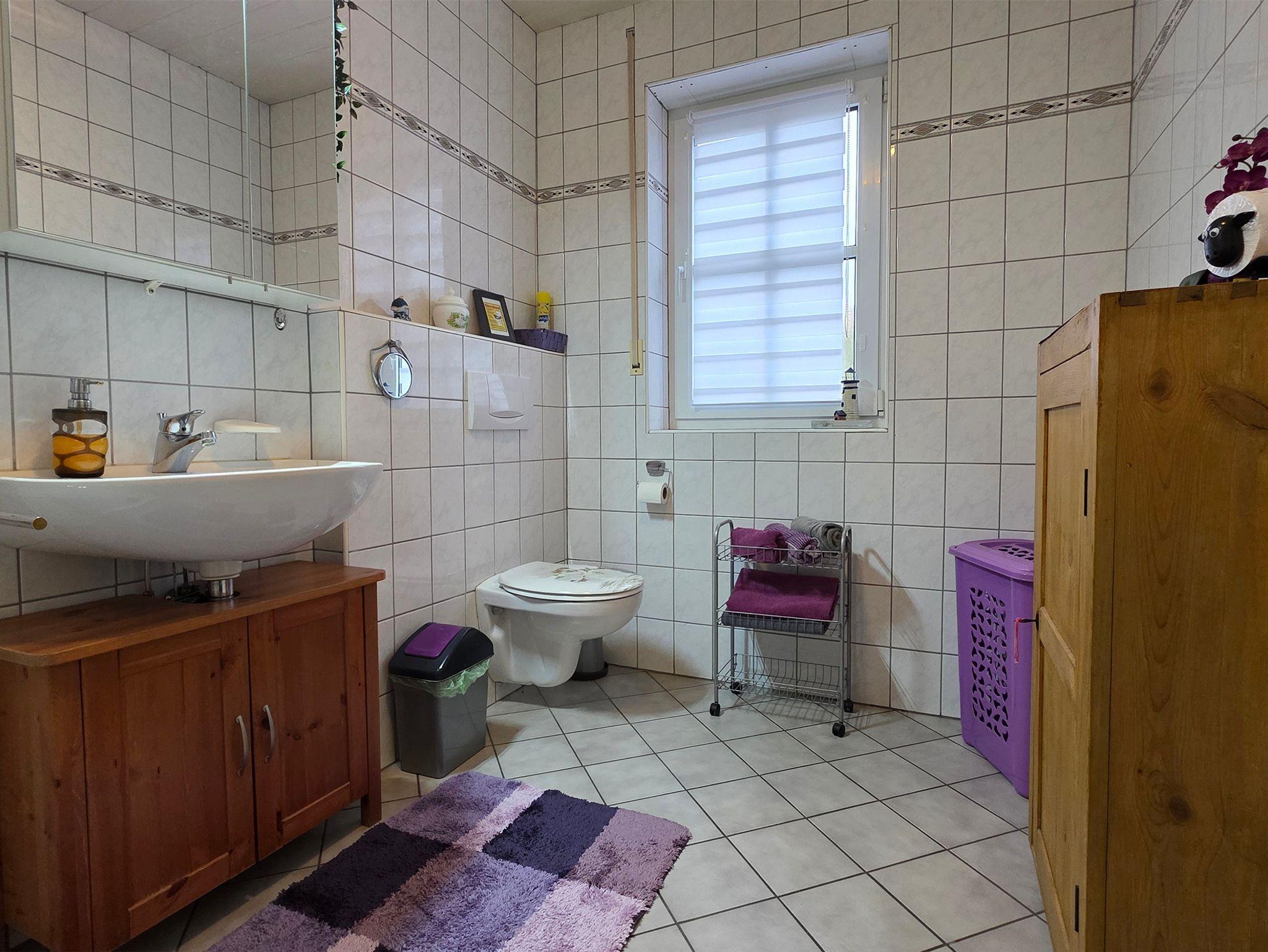 Das schöne Bad mit DU und WC sorgt mit einem großem Fenster für Helligkeit. Fön und Kosmetikspiegel sind vorhanden. Erstausstattung Dusch- und Badetücher, werden gestellt.