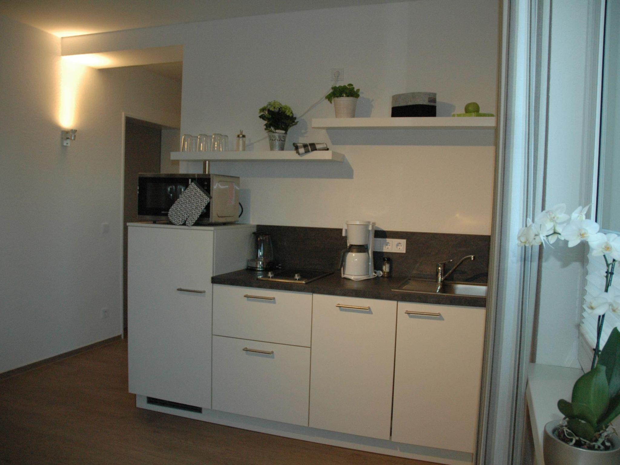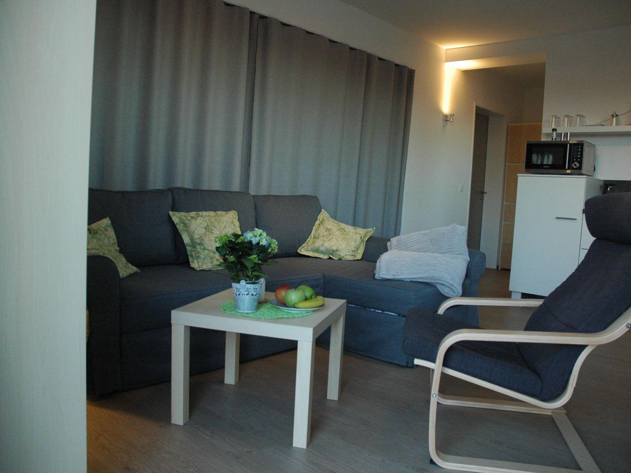Gemütlich eingerichtete Einzimmerwohnung. Das bequeme Sofa lädt zum Entspannen vor dem Fernseher ein und kann abends mit ein paar Handgriffen zum Schlafplatz umgebaut werden.