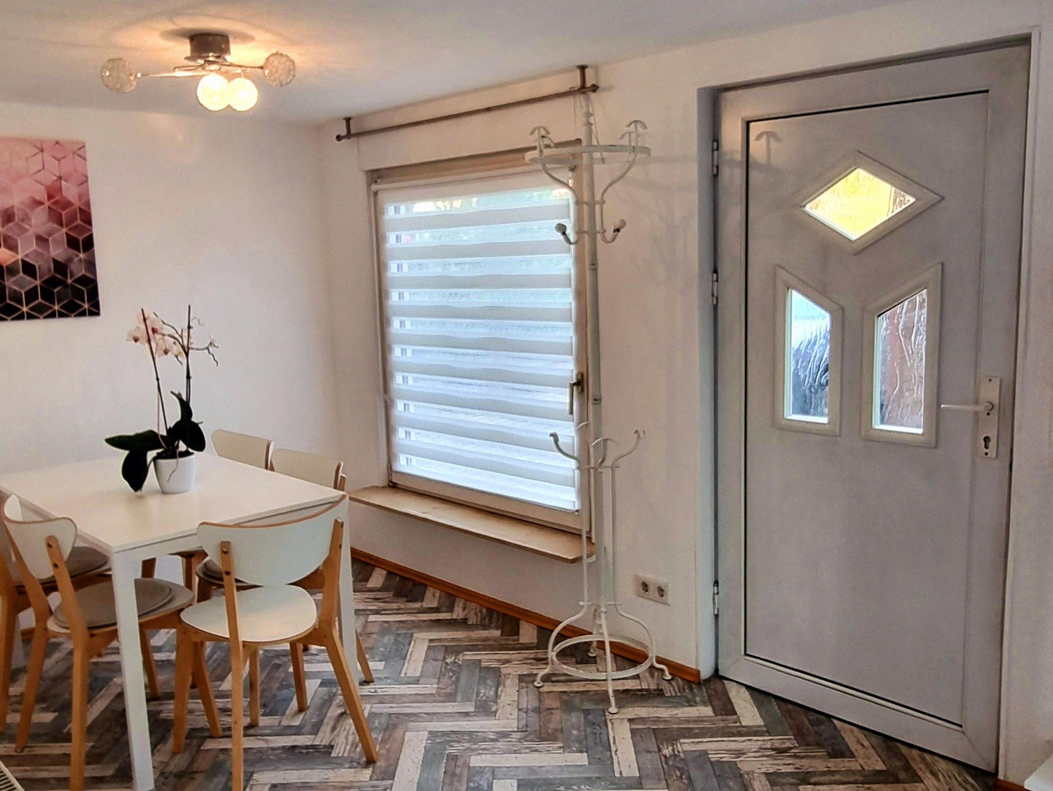 In unserem sogenannten „Wintergarten“ befindet sich der Eingangsbereich mit Garderobe und angrenzender Essecke. Durch die großen Fenster genießt Ihr den Blick nach draußen ins Grüne.