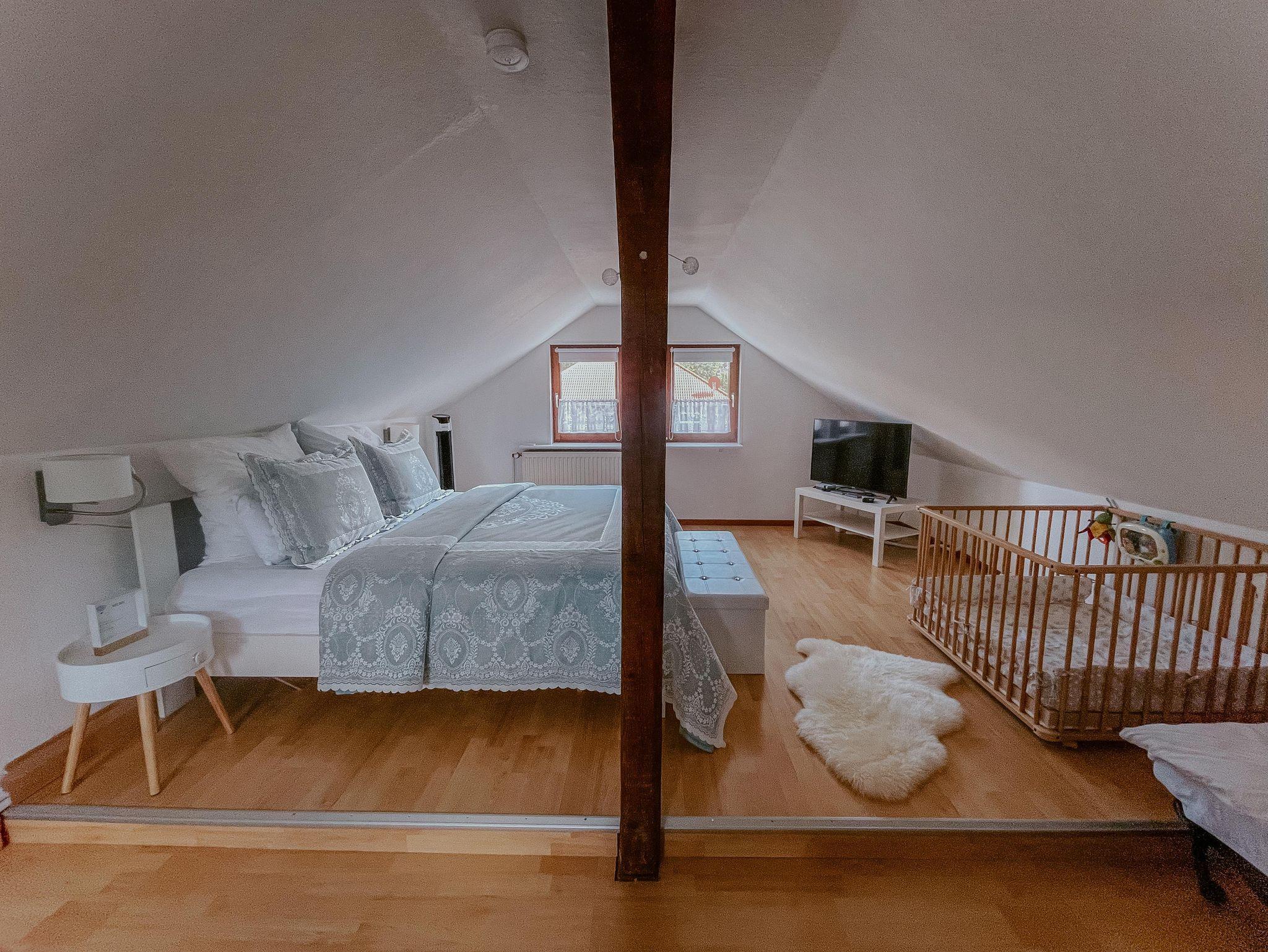 Durch die Treppe gelangt Ihr ins Obergeschoss, welches ebenfalls mit TV ausgestattet ist. Das gemütliche King Size Bett bringt Euch in das Land der Träume. Des Weiteren findet Ihr hier ein