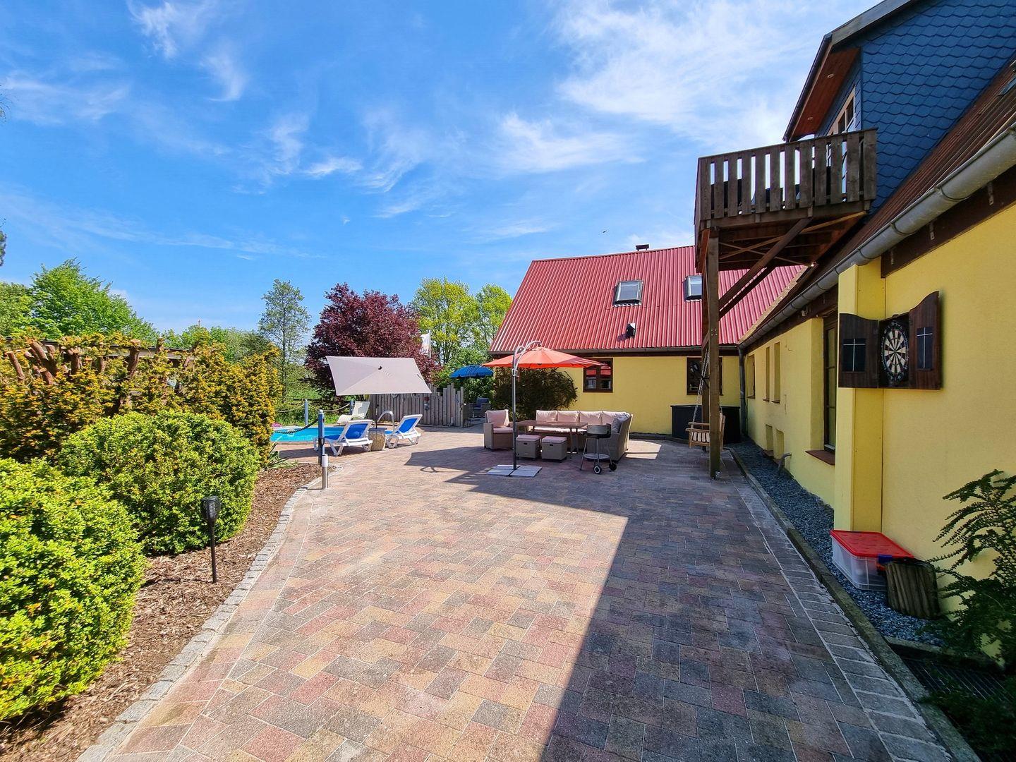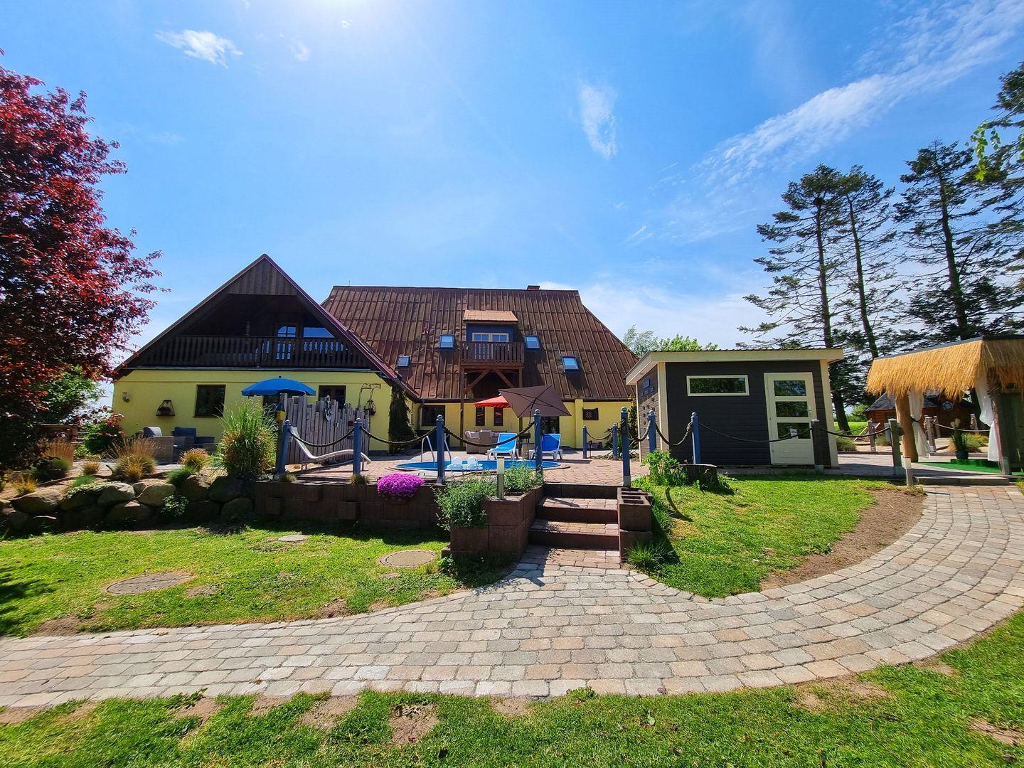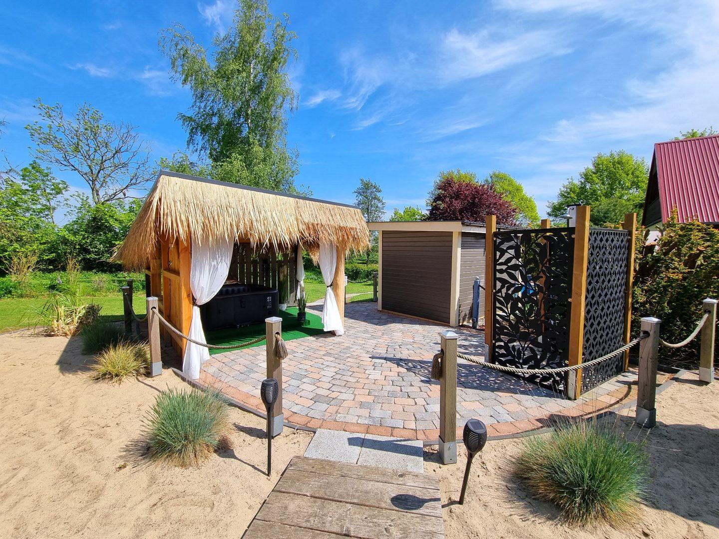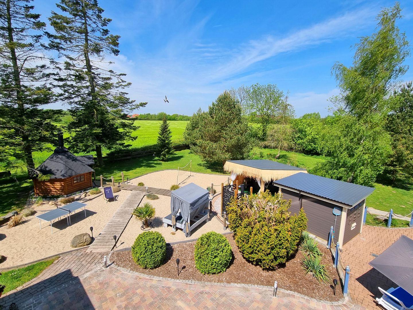 Der große Garten ist mit über 1000qm ein grünes Paradies. Für Erfrischung sorgt der Rundpool, für Wärme und Entspannung die Sauna mit zugehöriger Außendusche. Sollte es einmal regnerisch sein, oder wenn ihr es einfach nur gemütlich mögt, steht eine Grillkota als Mittelpunkt zwischen eigens angelegten Sandgärten bereit. Für Aktive Gäste gibt es einen Sandplatz mit Netz zum Volleyball und Badminton spielen, eine Tischtennisplatte und eine Outdoor-Dartscheibe. Über das gesamte Areal sind mehrere Sitzecken mit und ohne Sonnenschirme verteilt. Auch abends sorgt die Ausrichtung nach Westen für die schönsten Sonnenuntergänge über die Weiten der Felder. Dazu lässt sich stimmungsvolle Beleuchtung einschalten und die Ruhe genießen.