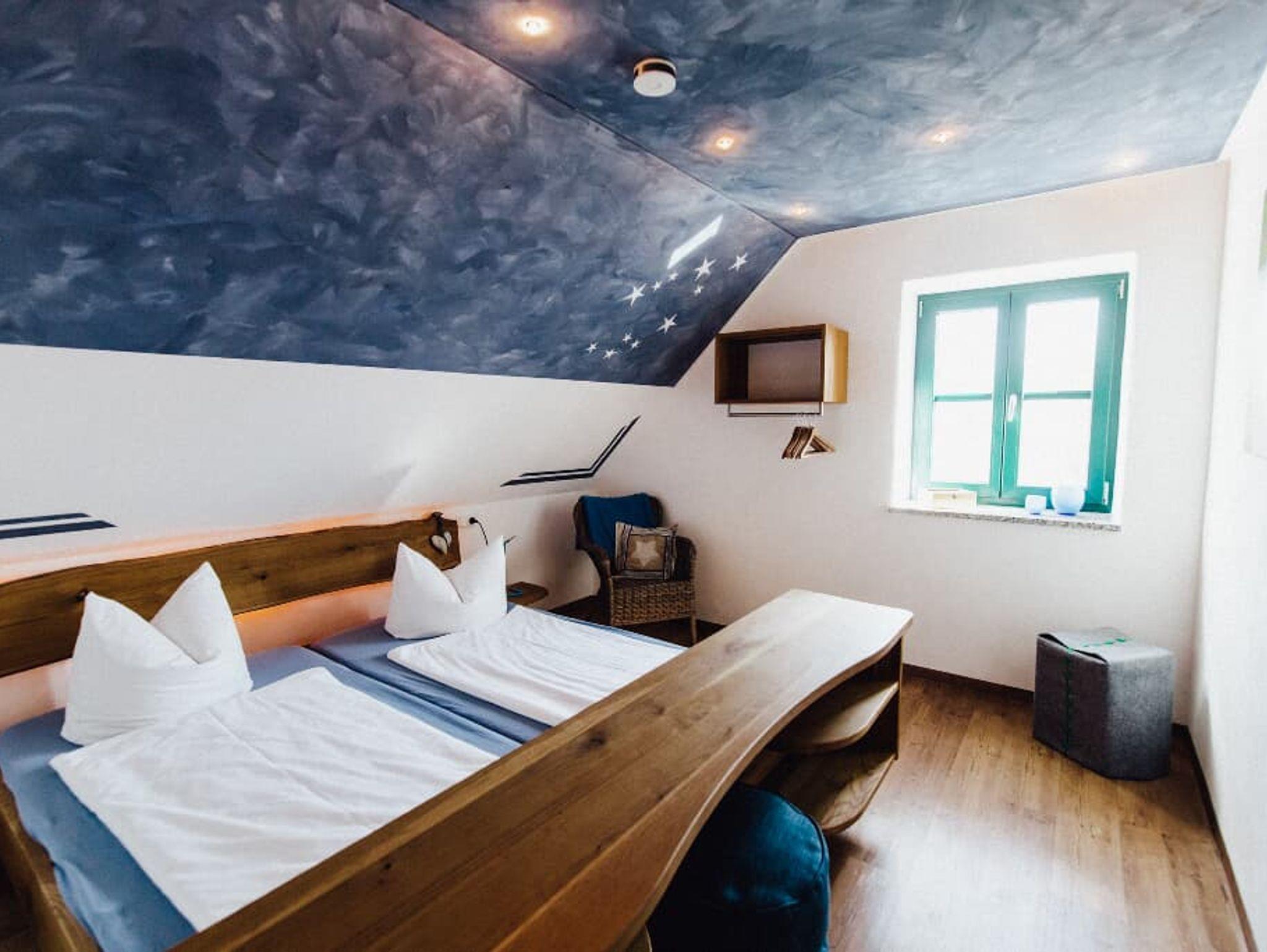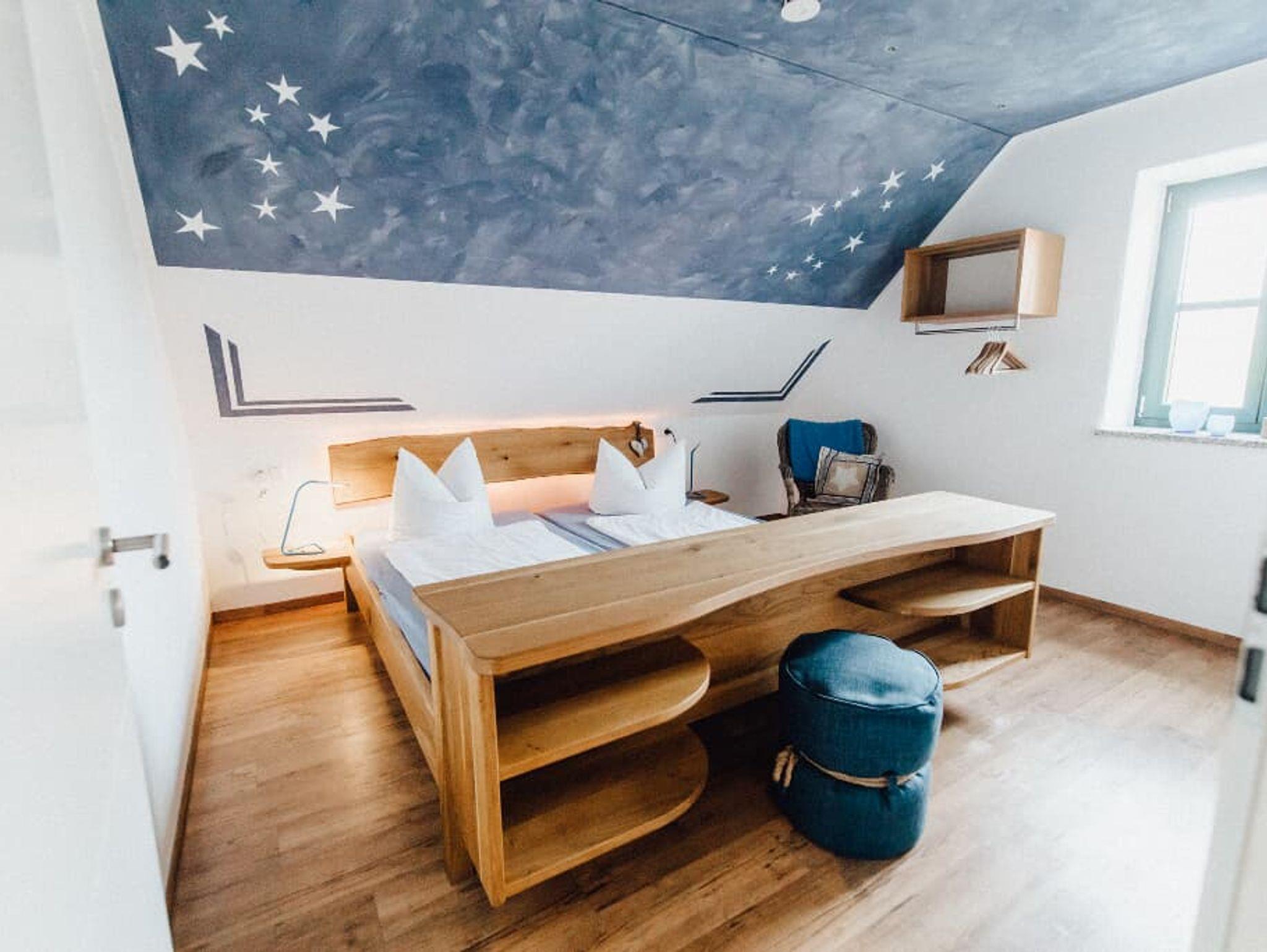 Die Ferienwohnung Sternenhimmel mit 105 qm Wohnfläche bietet Platz für 9 Personen. Das gemütliche Wohnzimmer mit Schlafsofa und Flachbild-TV lädt zum Verweilen ein. Die komplett ausgestattete Küche mit Geschirrspüler, Kühlschrank, Gefrierschrank, Herd, Backofen, Mikrowelle, Wasserkocher, Eierkocher, Toaster, und Senseo-Pad-Maschine lässt keine Wünsche offen. Durch den direkten Zugang zum Balkon, können Sie das Frühstück und das Abendessen direkt dort geniessen. Die Ferienwohnung verfügt über 2 Schlafzimmer mit einem großen Doppelbett (200 x 200 cm). Die 2 geräumigen Bäder mit ebenerdiger Dusche, großem Spiegel und großzügigem Regal für Ihre Utensilien, runden das Gesamtbild ab. Zusätzlich 40 qm Lebensraum auf der Galerie mit weiteren 5 Betten. Zum Reinigen Ihrer Kleidung stehen eine Waschmaschine und Trockner im Haus zur Verfügung. Die Sauna mit Ruheraum im Untergeschoß dürfen Sie gerne nutzen. Vor allem im Sommer können Sie entspannte Grillabende in unserem Garten verbringen.