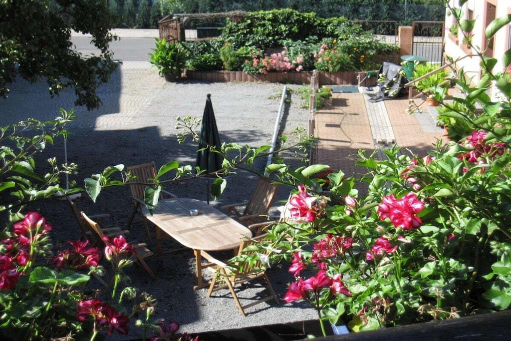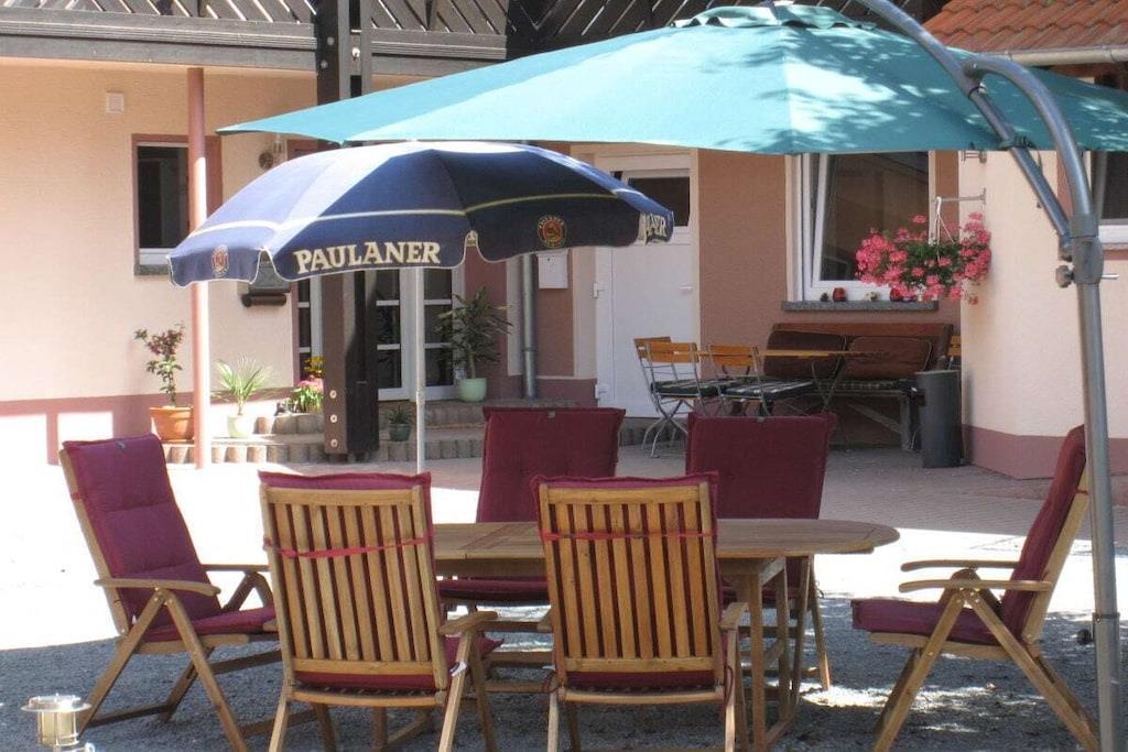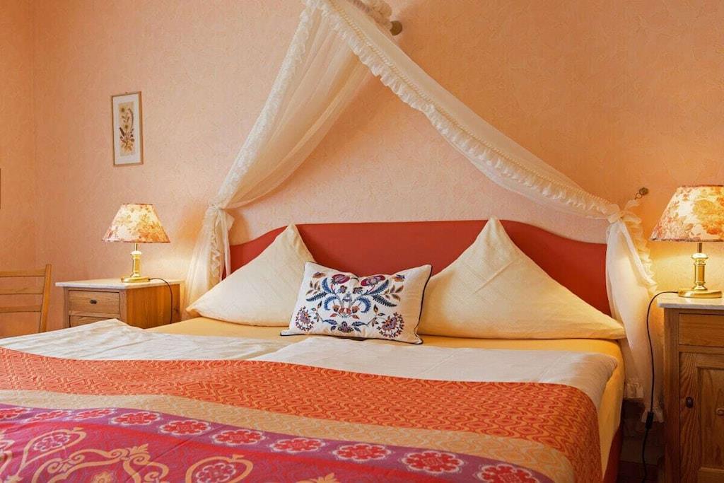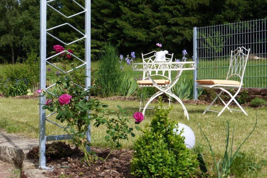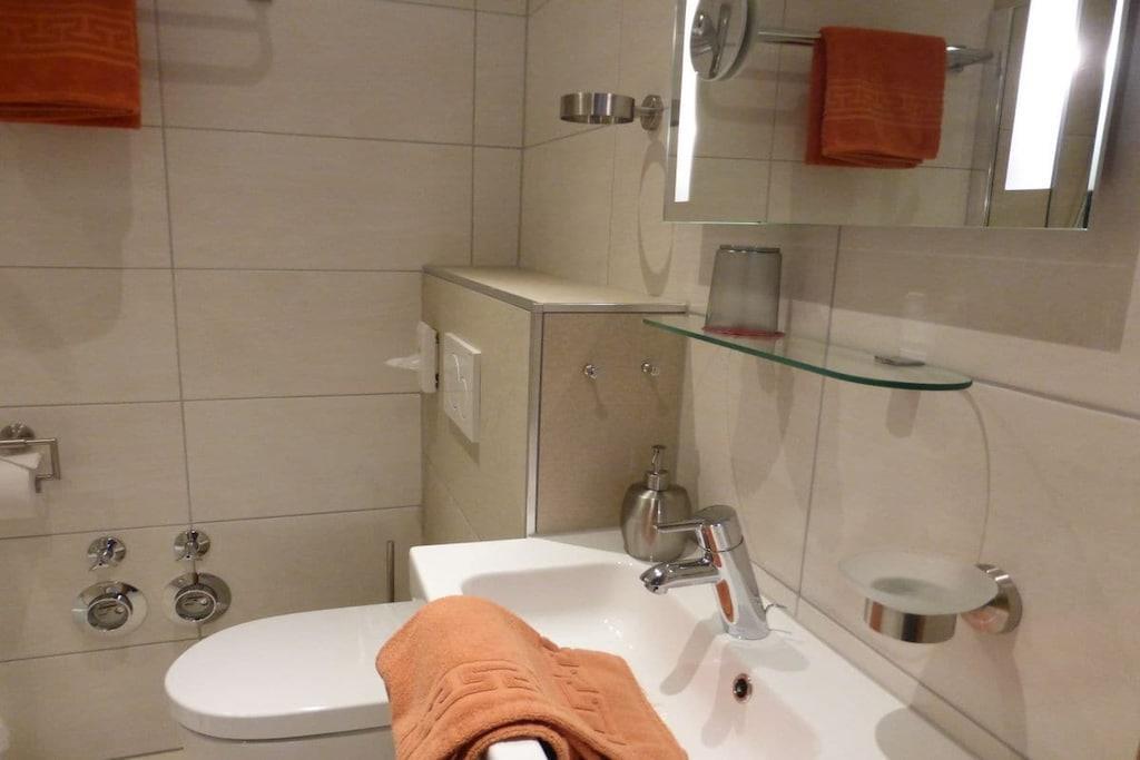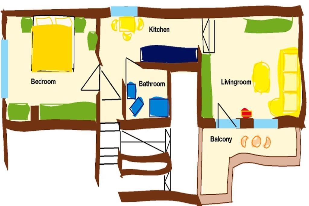 På 1. etage: (Stue(, , Fjernsyn, DVD-afspiller, radio), Køkken(, , tekøkken, spisebord, kakkelovn, kogeplade, elkedel, brødrister, komfur, kaffemaskine, ovn, mikrobølgeovn, opvaskemaskine , køleskab, fryser, insektnet), soveværelse(, , , dobbeltseng), badeværelse(, toilet, bruser, håndvask, føntørrer)) , , , Internetadgang, Førstehjælp, varme, have(, Græsplæne, havemøbler, solstole), parkering, strygebræt, strygejern, telefon