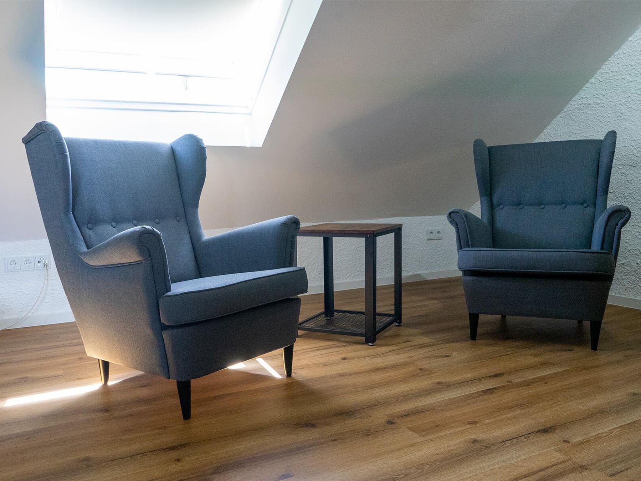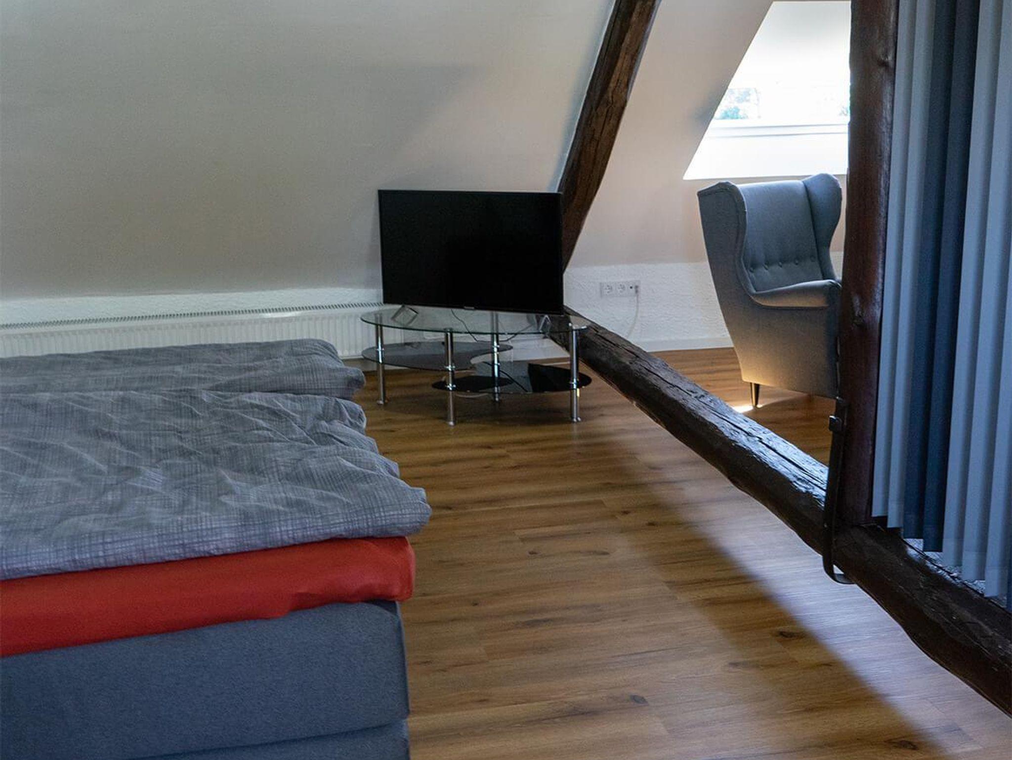 Das größte Schlafzimmer befindet sich im Dachgeschoss und ist mit einem Doppelbett 1,80m x 2,00m ausgestattet. Eine Sitzecke mit zwei Sesseln, ein Flachbildfernseher und eine Toilette mit Waschbecken befinden sich ebenfalls im Zimmer.