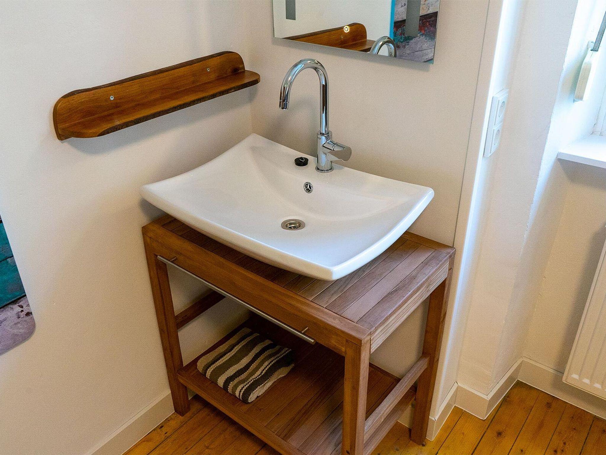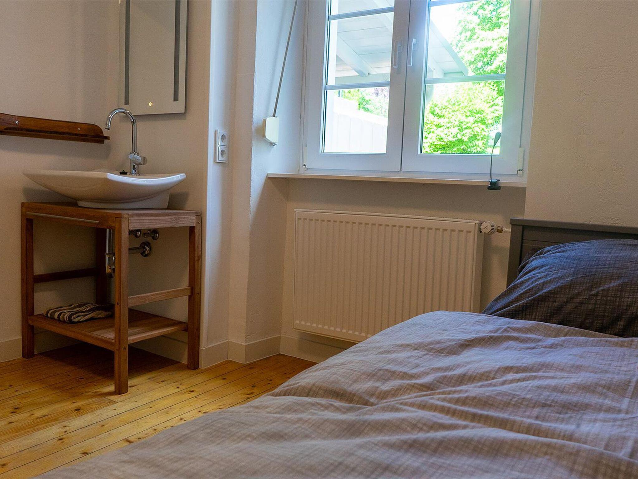 Dieses Schlafzimmer liegt ebenfalls im Erdgeschoss und enthält ein Ausziehbett 2x 0,80m x 2,00m, sowie ein Waschbecken und eine Kommode.