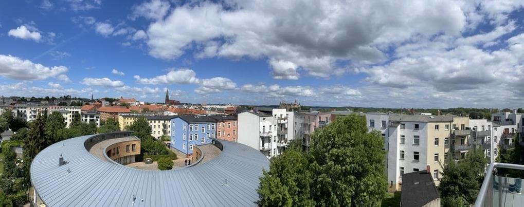 Unsere exklusive helle Ferienwohnung für 2 - 4 Personen liegt mitten in der Altstadt von Schwerin, im 4. Stock eines Mehrfamilienhauses, in einer ruhigen Seitenstraße der Schweriner Feldstadt. Das obige Bild zeigt den phantastischen Blick von Dachterrasse und Wohnküche. Die Wohnung ist hochwertig ausgestattet und verfügt über alle Annehmlichkeiten, die man für einen längeren Aufenthalt benötigt.