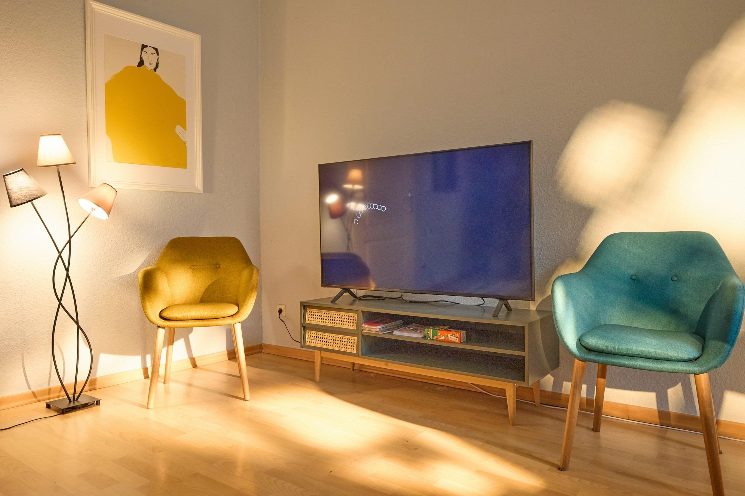- Wohnzimmer mit Couch (ausziehbar zur Schlafcouch), Wohnzimmertisch, Flat-TV
