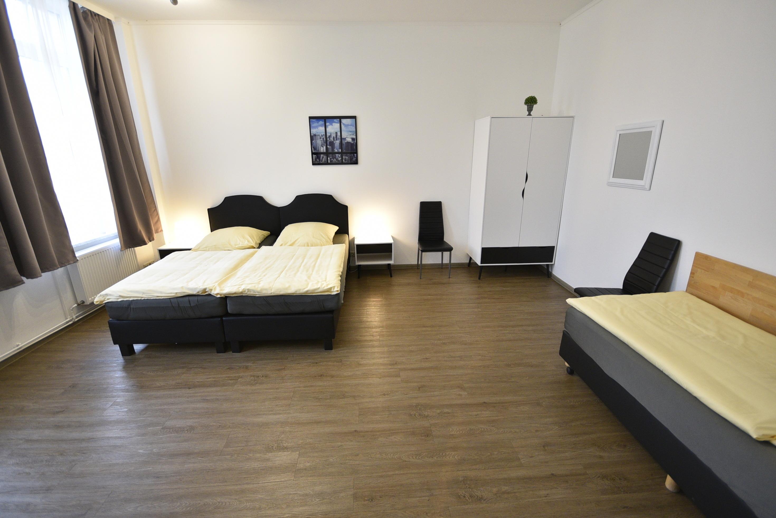 Im Schlafzimmer finden Sie: Bettwäsche, Kleiderschrank, Schreibtisch, TV Sat/Kabel und drei hochwertige Boxspringbetten.