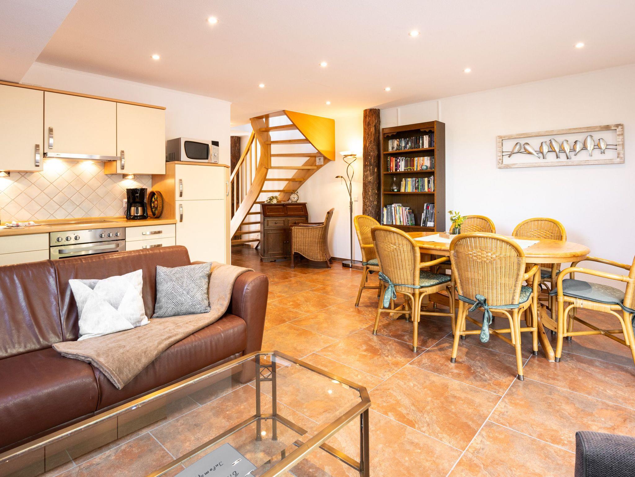 Erdgeschoss: Eine komplett ausgestattete Küche inkl. E-Herd mit Backofen, Spülmaschine, Kühlschrank mit Gefrierfach, Kaffeemaschine, Mikrowelle und ein Toaster. Dazu noch eine Küchenmaschine und diverse Backformen und Utensilien. Ein Essbereich mit großem Tisch und 6 Stühlen. Der Wohnbereich mit einem 3-Sitzer und zwei Sessel und einem Flach-Bild-Fernseher mit SAT-Anschluss bietet Ihnen Platz zum Entspannen oder einen Abend in familiärer Runde für Gesellschaftsspiele.
