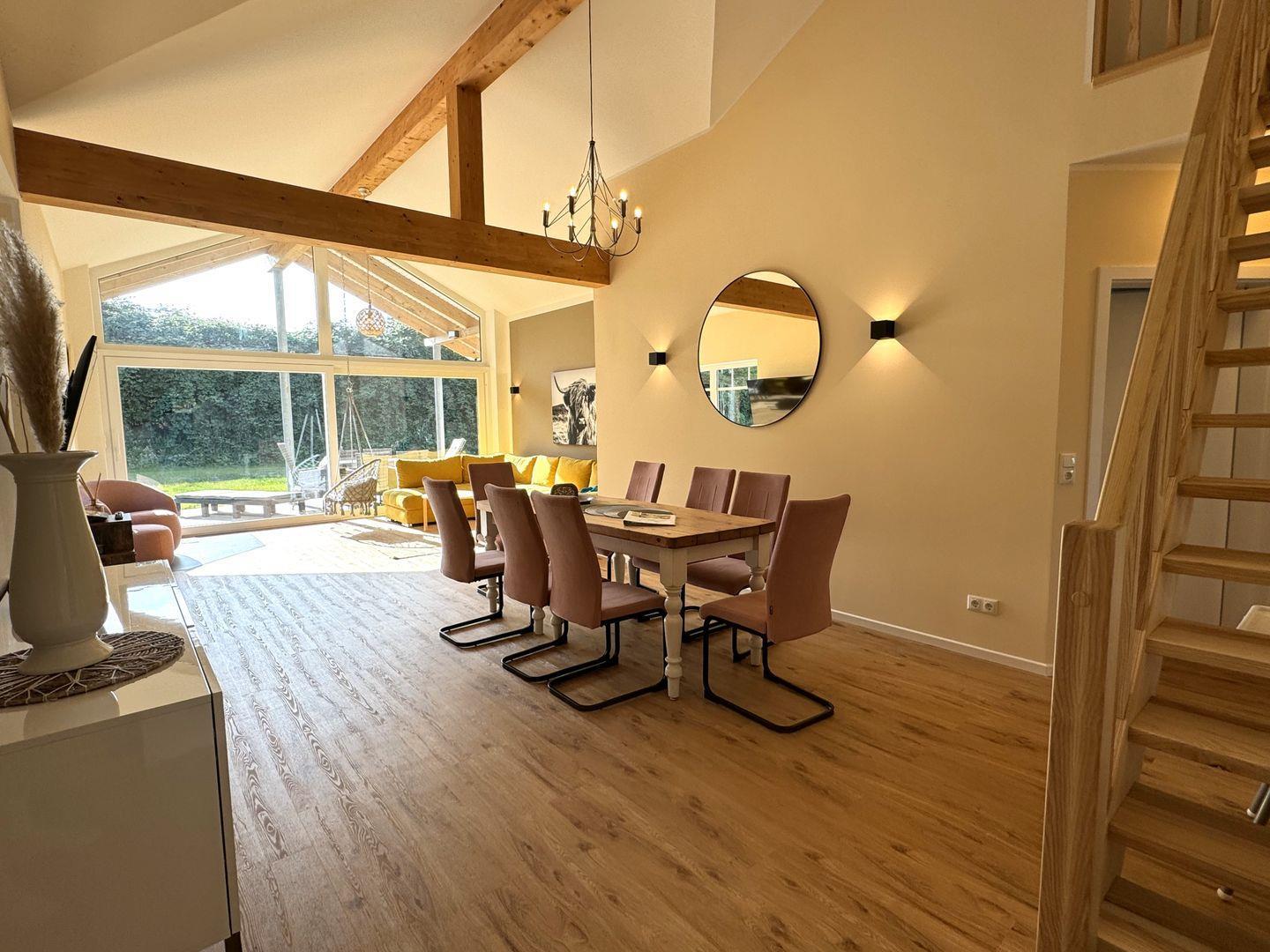 Freuen Sie sich auf einen großzügigen, lichtdurchfluteten Wohn- und Essbereich mit modernem Flachbildfernseher – ideal für entspannte Abende mit der Familie. Die hochwertig ausgestattete Küche lässt keine Wünsche offen. An kühleren Tagen sorgt eine Fußbodenheizung im gesamten Haus für behagliche Wärme.