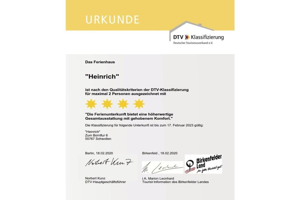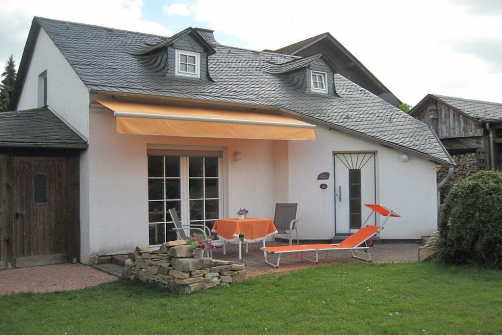 Ankom og føl dig godt tilpas... Charmerende feriehus på 85 m², udstyret med terrasse, til to feriegæster – 4-stjernet vurdering ifølge DTV, direkte ved siden af "Hunsrück-Hochwald Nationalpark". Eksklusivt fritliggende sommerhus i grønne omgivelser med carport. Stor eng med have og frugttræer. Stue med fedtstensovn, siddegruppe, TV, hi-fi, internet, terrasse med rummelig elektrisk markise og havemøbler. Udstyret køkken med opvaskemaskine, mikrobølgeovn, ovn med keramisk kogeplade, køleskab, brødrister, kaffe- og espressomaskine samt service til fire personer. Spiseplads i karnap til fire personer, badeværelse med bruser og hjørnebadekar, ekstra toilet i stueetagen, dobbeltværelse, separat værelse med en seng til "snorkere" eller kan bruges som et lille børneværelse. Opbevaringsrum, entré med knagerække.