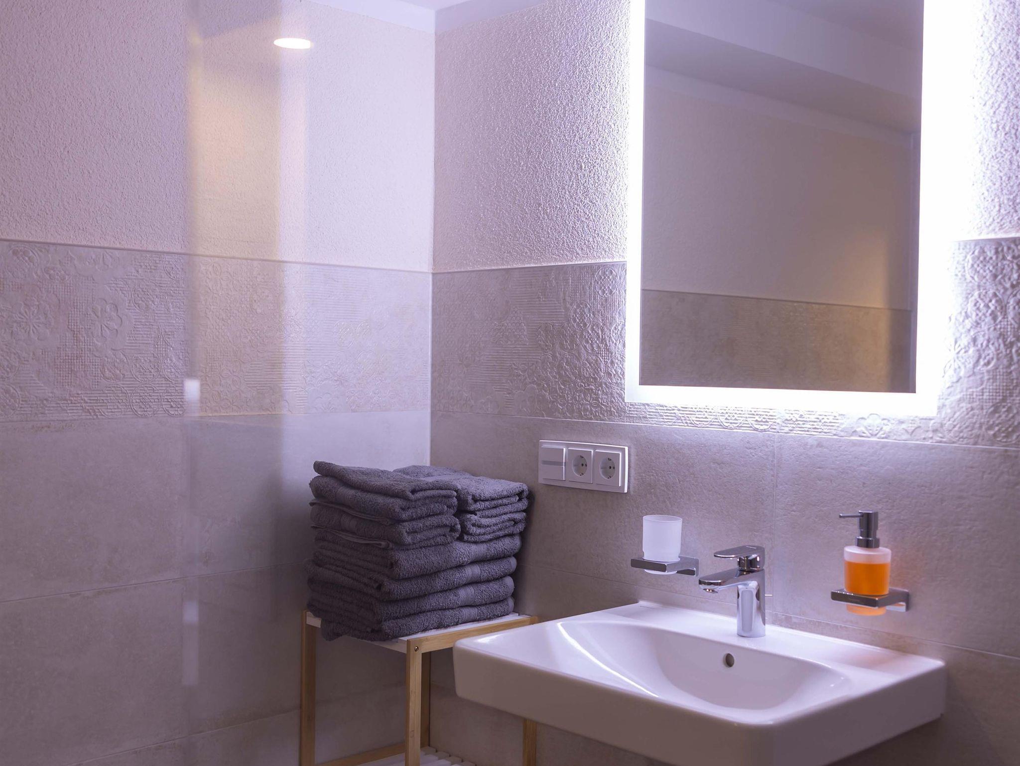 Das Apartment bietet zwei separate Schlafzimmer: eines mit einem Doppelbett und ein weiteres mit zwei Einzelbetten. Ein Kleiderschrank bietet ausreichend Stauraum für Ihre Sachen. Das Badezimmer ist mit einer Wandtrockner, Fön, Dusche, WC und Waschbecken ausgestattet.