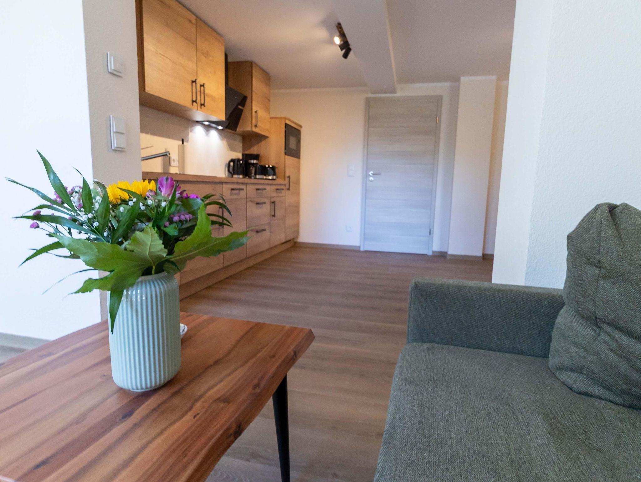 Diese helle und freundliche Ferienwohnung bietet Platz für bis zu 4 Personen und ist damit perfekt für Familien. Sie verfügt über eine komplett ausgestattete Wohnküche mit Geschirrspüler, 4-Zellen-Herd, Mikrowelle, Kaffeemaschine, Wasserkocher, Kühlschrank (ohne Gefrierzelle) und Toaster, ergänzt durch das nötige Kücheninventar. Am Esstisch mit vier Stühlen können Sie gemeinsam speisen oder Spieleabende verbringen. Der Wohnbereich lädt mit einem gemütlichen Sofa, Couchtisch und TV-Gerät zum Entspannen ein.