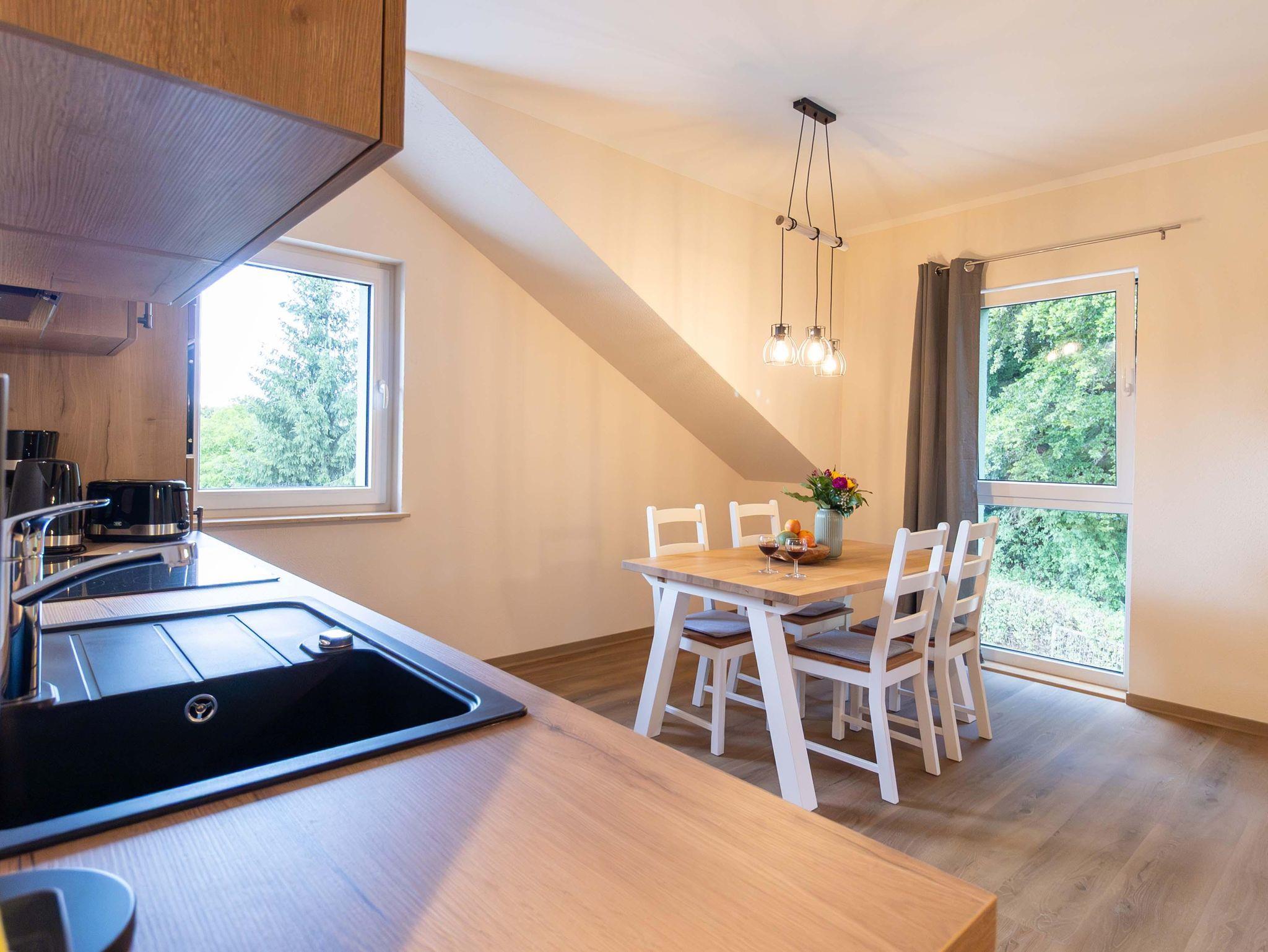 Diese gemütliche Ferienwohnung bietet Platz für bis zu 4 Personen und ist somit perfekt für einen Familienurlaub oder einen Ausflug mit Freunden. Im Herzen der Wohnung befindet sich eine gut ausgestattete Wohnküche mit Geschirrspüler, 4-Zellen-Herd, Mikrowelle, Kaffeemaschine, Kühleschrank (ohne Gefrierzelle), Wasserkocher und Toaster – alles, was Sie für Ihre Mahlzeiten benötigen. Am Esstisch mit vier Stühlen können Sie gemeinsam essen oder entspannte Abende verbringen. Für zusätzliche Gemütlichkeit sorgen ein Sofa, ein Couchtisch und ein TV-Gerät im Wohnbereich.