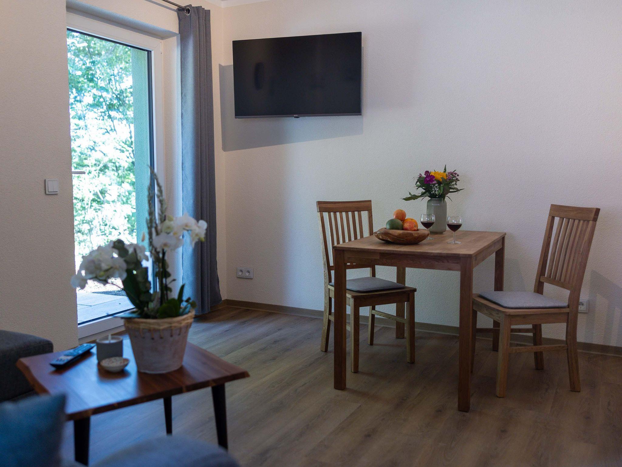 Diese gemütliche Ferienwohnung ist perfekt für bis zu 2 Personen und bietet alles, was Sie für einen entspannten Aufenthalt benötigen. Die voll ausgestattete Wohnküche lässt keine Wünsche offen: Hier finden Sie einen Geschirrspüler, 2-Zellen-Herd, Mikrowelle, Kaffeemaschine, Wasserkocher, Toaster, Kühlschrank (ohne Gefrierzelle) sowie umfassendes Kücheninventar (Ess- und Kochgeschirr). Am Esstisch mit zwei Stühlen können Sie Ihre Mahlzeiten genießen. Im selben Raum laden ein bequemes Sofa, ein Couchtisch und ein TV-Gerät zu gemütlichen Stunden ein.