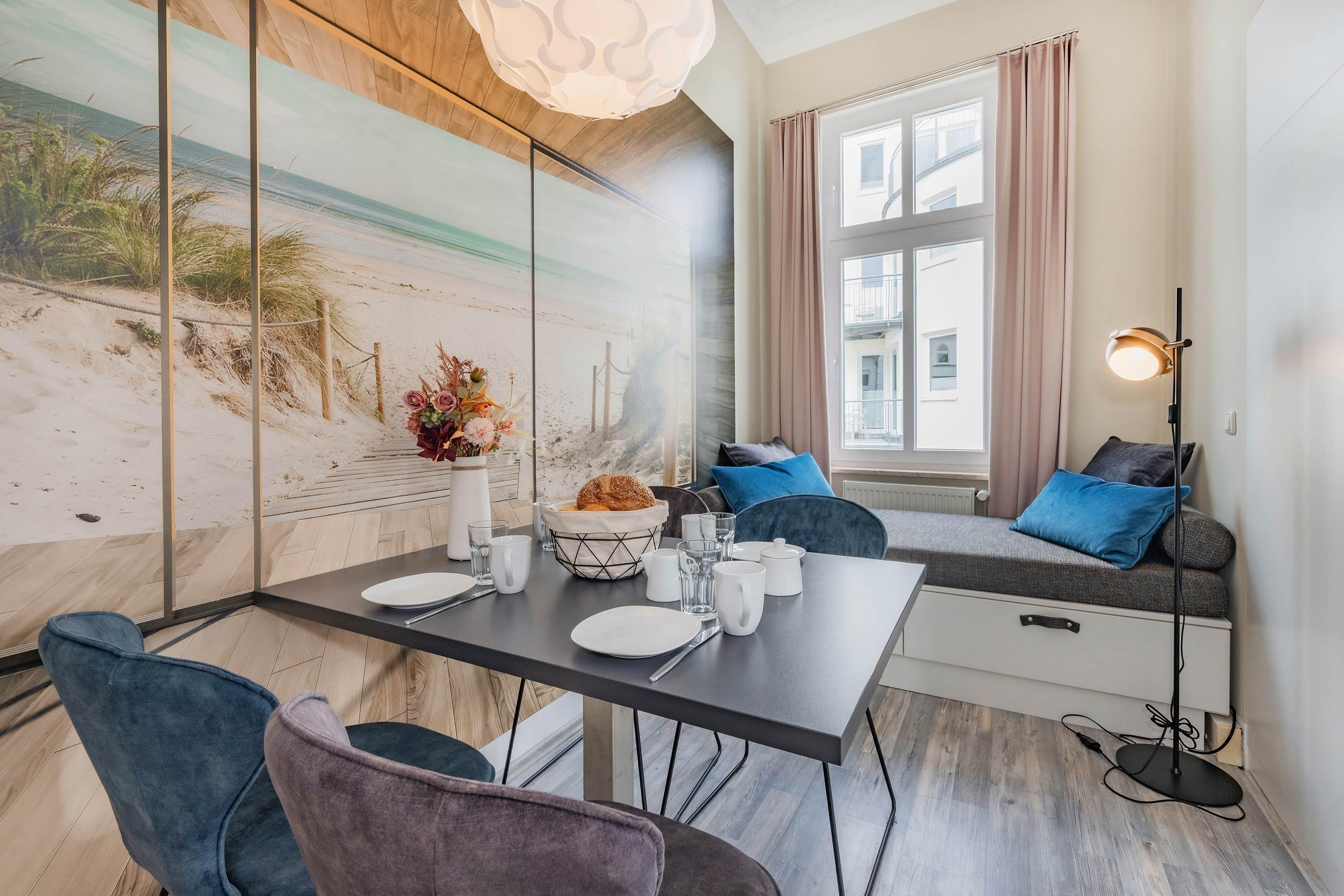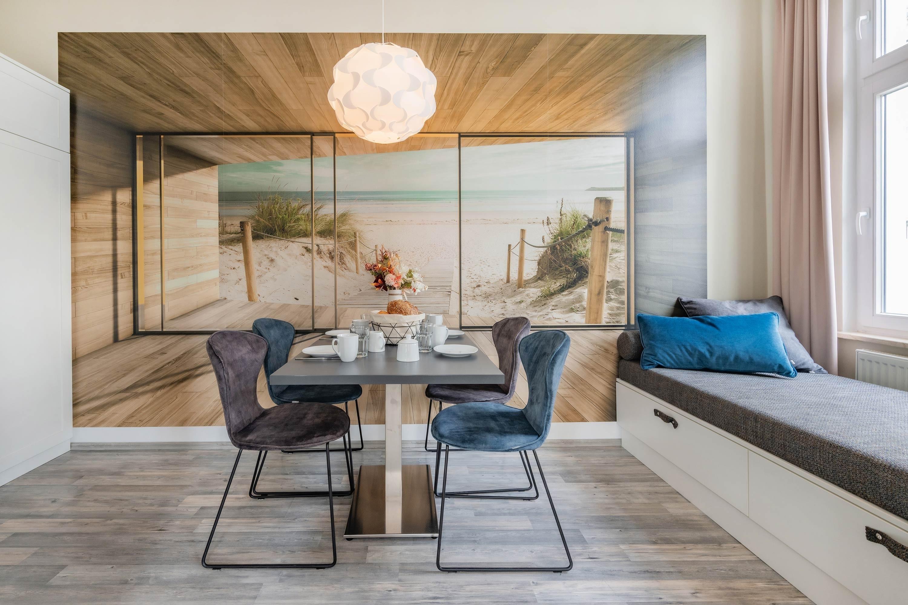 Die Innenarchitektur des "Sanddüne" ist eine Hommage an die zeitgemäße Eleganz. Die voll ausgestattete Küchenzeile mit ihren modernen Geräten wie Kühlschrank und Kaffeemaschine dient als Herzstück des Apartments, während der Essbereich ein stilvoller Raum für genussvolle Mahlzeiten und gesellige Momente ist. Inmitten dieses harmonischen Ambientes sorgen ein Flachbild-TV und kostenfreies WLAN für Unterhaltung und Konnektivität.