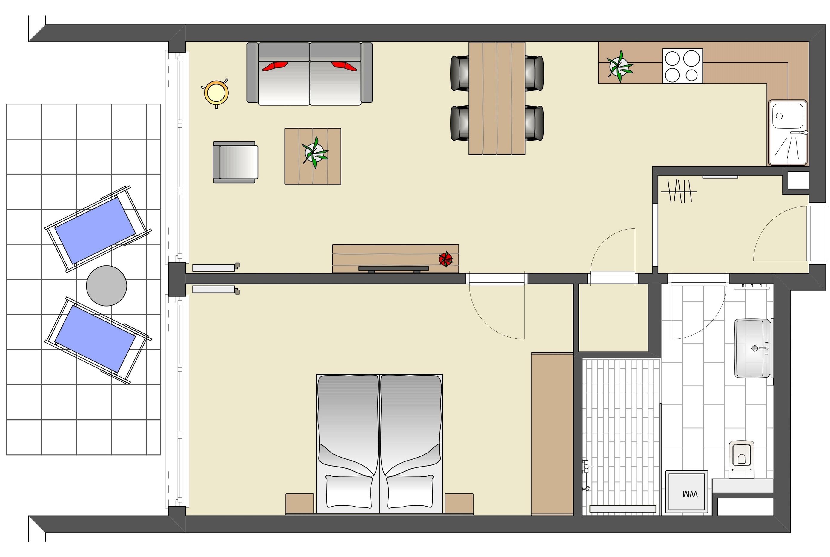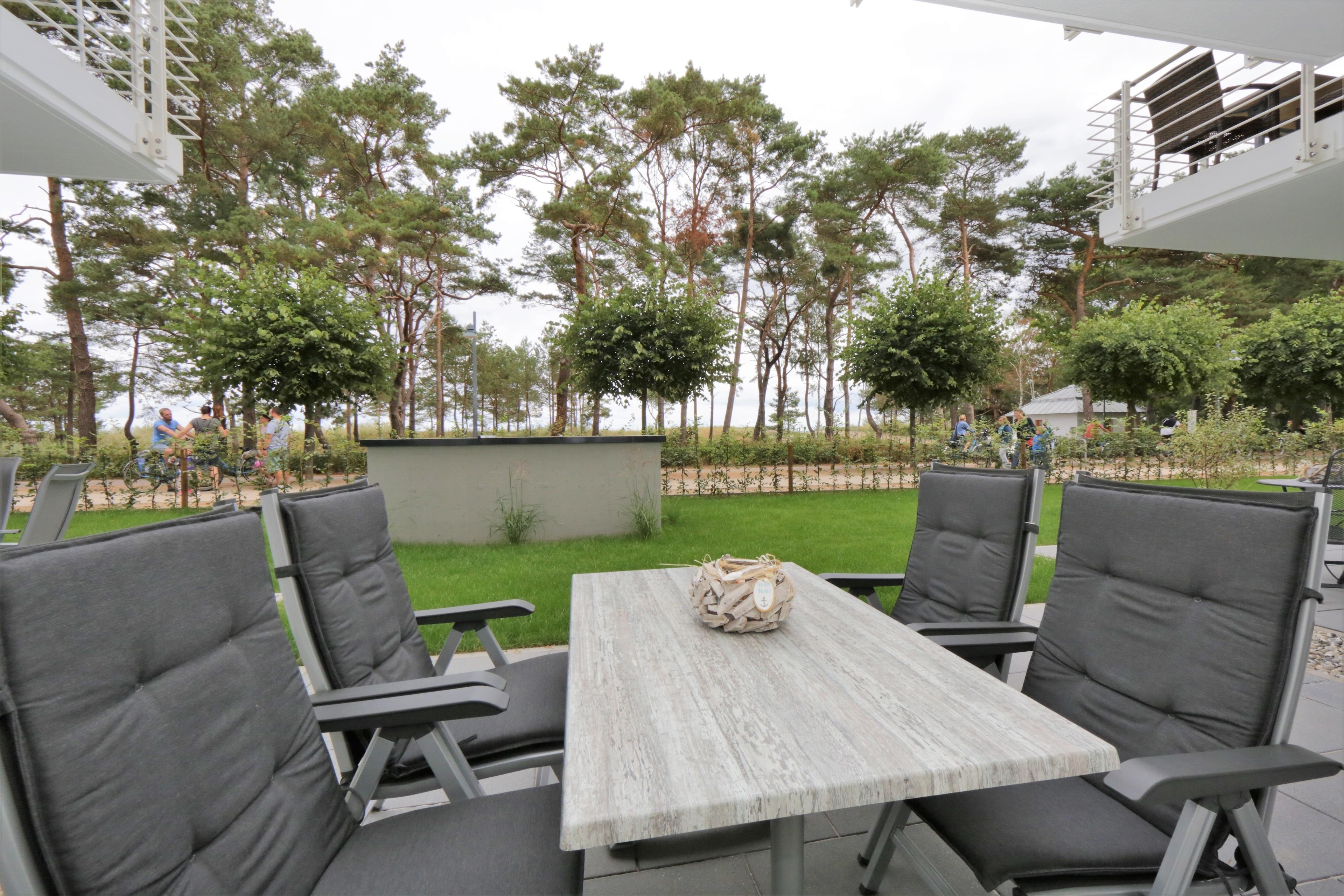 Diese hochwertige 2-Zimmer Wohnung ist 59 qm groß und liegt im Erdgeschoss. Sie bietet maximal 4 Personen Platz für einen erholsamen Ostseeaufenthalt direkt am Meer. Der liebevoll eingerichtete Wohnraum verfügt über ein gemütliches Sofa mit Schlaffunktion (Liegefläche 160 x 200), Couchtisch und Flat TV. Der Essplatz und die Küchenzeile incl. Geschirrspüler, Ceranfeld, Backofen, Mikrowelle, Kühlschrank etc. sind ebenfalls offen im Wohnraum integriert. Auf der überdachten Terrasse zur Seeseite genießen Sie ihr Frühstück schon im Freien und haben die Promenade im Blick. Die Düne versperrt Ihnen den Blick auf die Ostsee jedoch nicht das Rauschen. Das Schlafzimmer ist mit einem komfortablen Doppelbett mit getrennten Matratzen (90 x 200) und ausreichend Schrankraum eingerichtet. Das großzügige, moderne Bad ist mit einer ebenerdigen Dusche und Waschtisch/WC ausgestattet.
