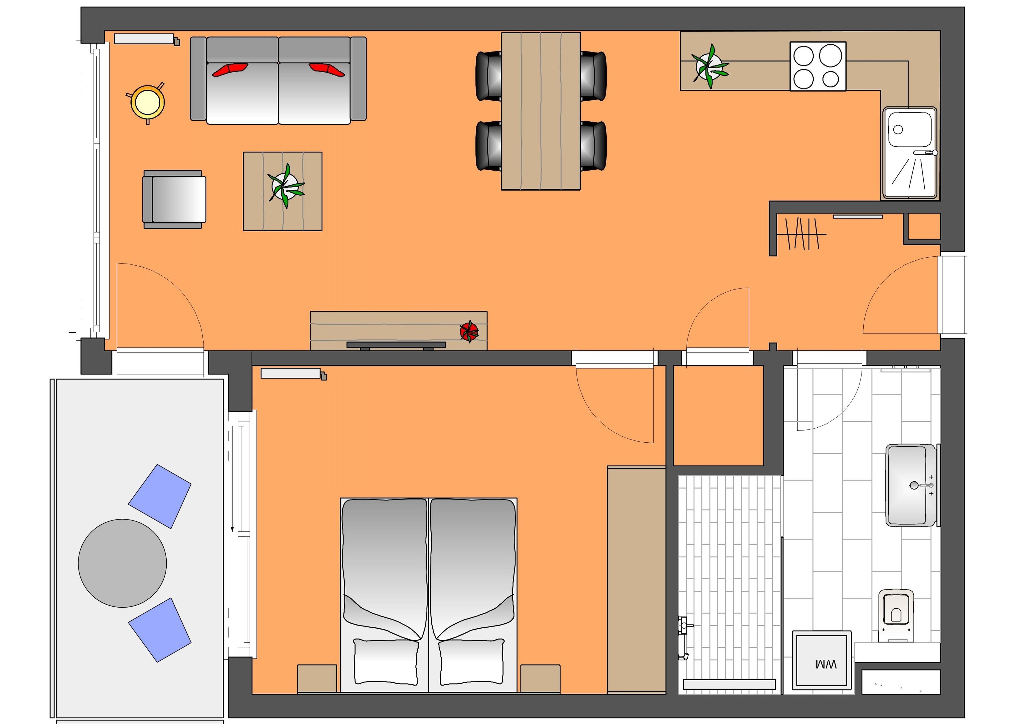 Diese moderne, liebevoll eingerichtete 2-Zimmer Wohnung mit 51 m² Wohnfläche befindet sich im 2. Obergeschoss der 2018 neu gebauten Strandresidenz. Der überdachte Balkon zur Promenade lockt Sie mit seinem traumhaftem Blick auf die Ostsee schon zum Frühstück ins Freie. Die Wohnung ist individuell und komfortabel eingerichtet und bietet 2-4 Personen Platz für einen erholsamen Urlaub direkt am Meer. Der offene Wohnraum bietet Ihnen eine gemütliche Sitzecke mit einem bequemen Sofa mit Schlaffunktion (Matratze 160 x 200), einen Sessel und Flat TV. Die Küchenzeile incl. Backofen, Ceranfeld, Kühlschrank, Geschirrspüler, Mikrowelle etc. sowie der Essplatz sind offen im Wohnraum integriert. Das geräumige Schlafzimmer ist mit einem Doppelbett mit getrennten Matratzen (90 x 200), einem großen Kleiderschrank und zusätzlichem Flat TV eingerichtet. Aus beiden Zimmern genießen Sie den Seeblick aus erster Hand. Der Balkon lässt sich sowohl vom Wohn- als auch vom Schlafzimmer betreten. Das großzügige, moderne Bad ist mit einer ebenerdigen Dusche und Waschtisch/WC ausgestattet.