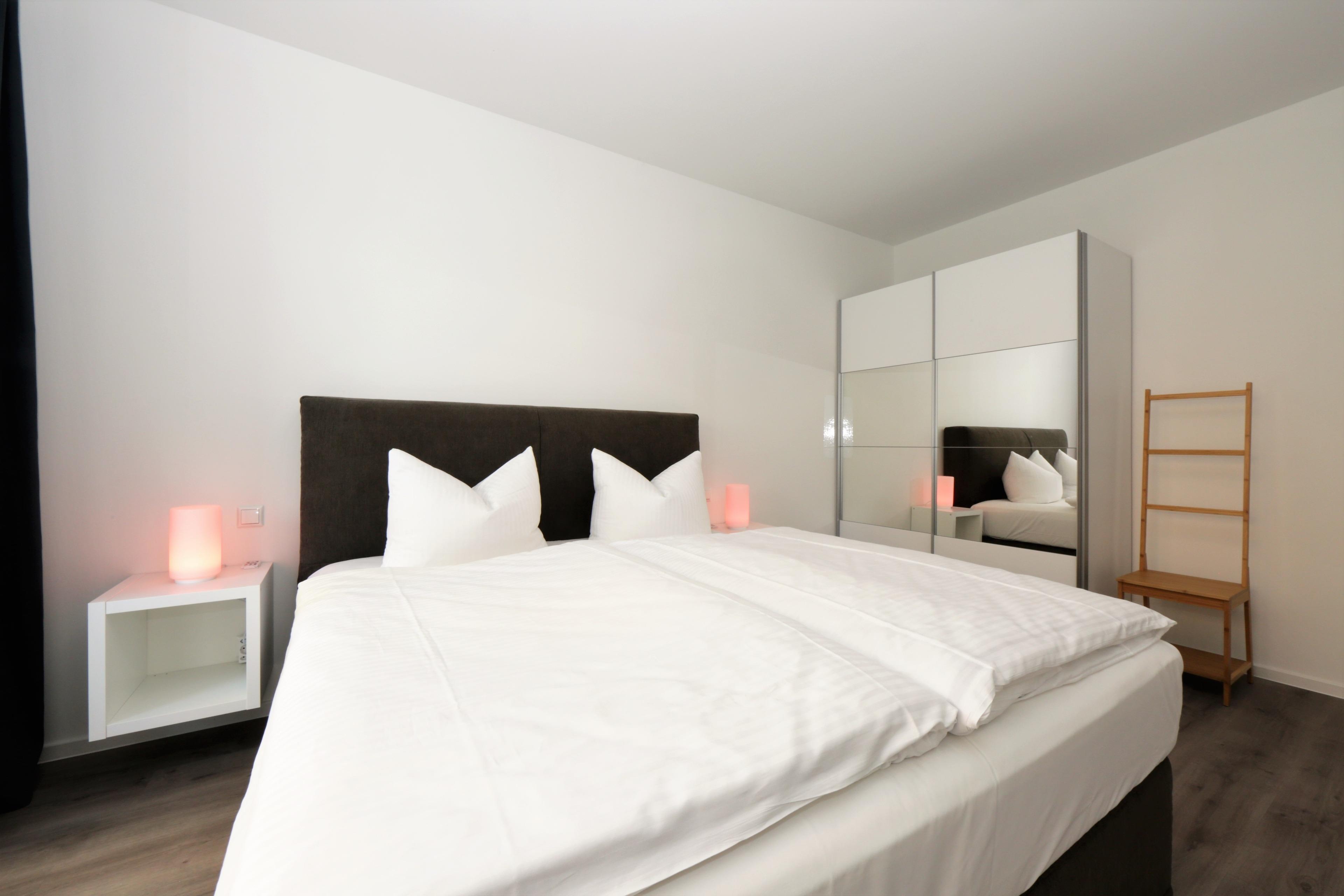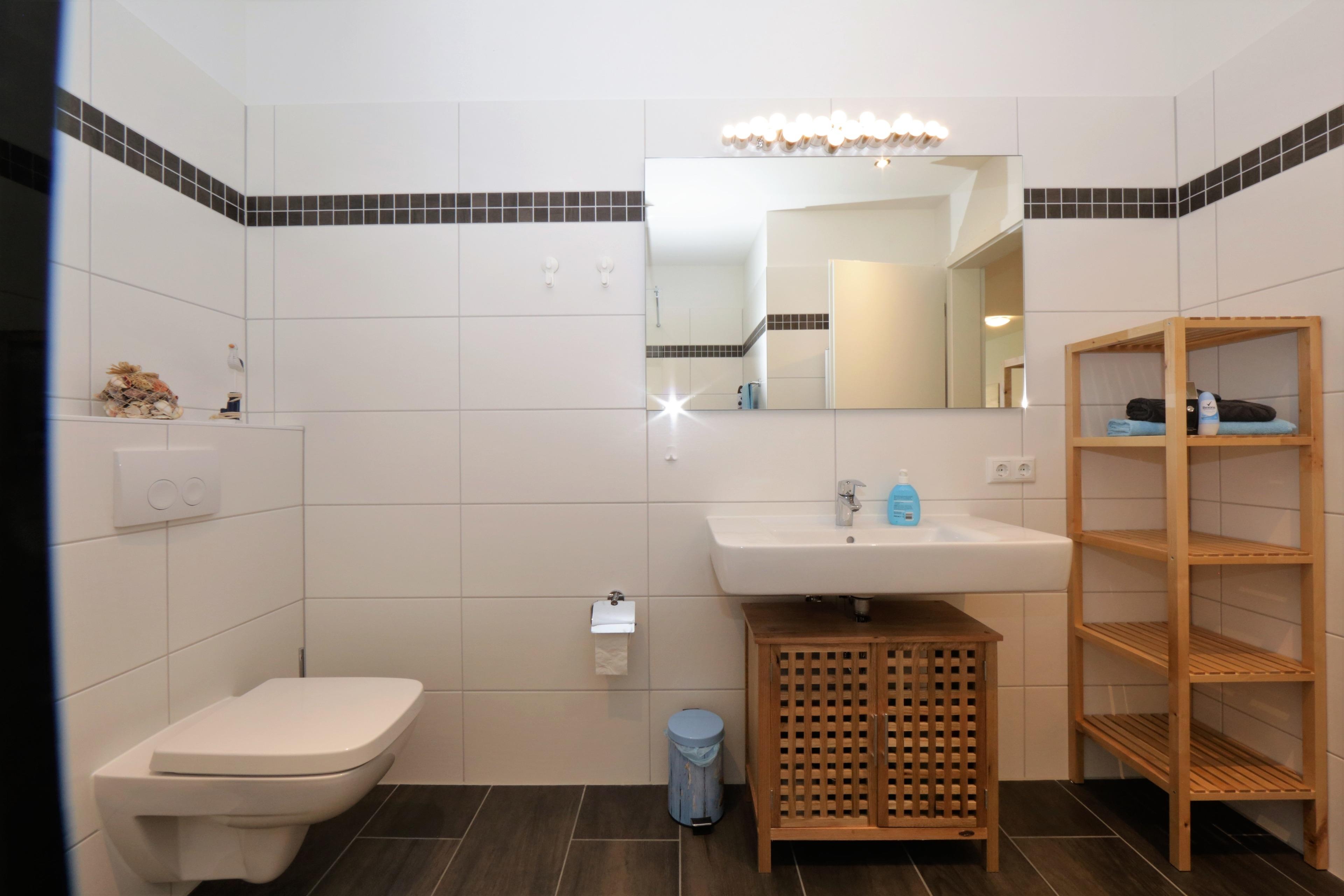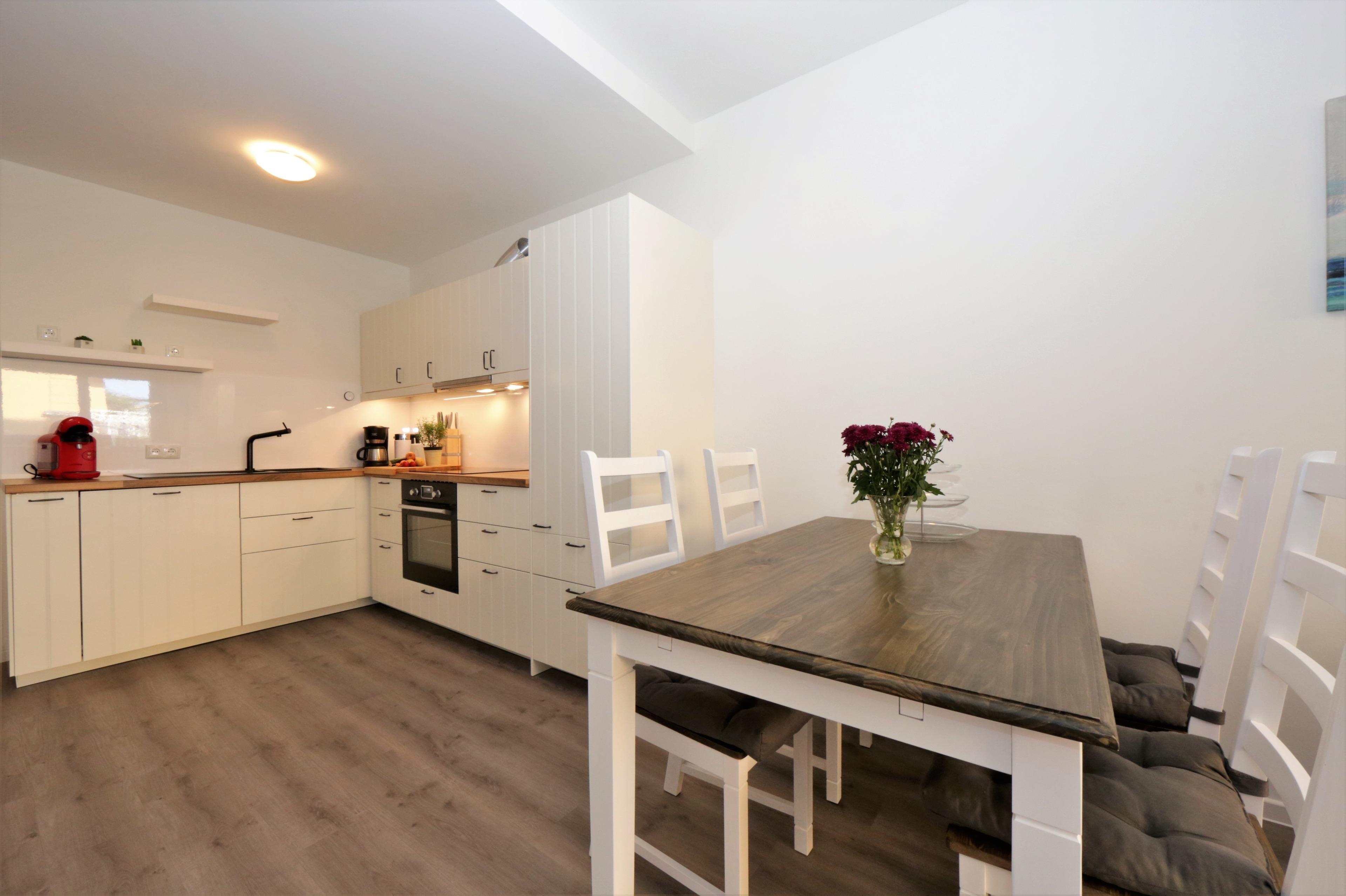 Dieses hochwertige, moderne 2-Zimmer Appartement ist 56 qm groß und befindet sich im Erdgeschoss der 2018 neu erbauten Strandresidenz. Die Wohnung ist für 2-4 Personen geeignet. Im Wohnbereich erwartet Sie eine bequeme Polstergarnitur mit Schlaffunktion (Matratze 160 x 200), ein kleiner Beistelltisch und Flat TV sowie ein Esstisch für gemeinsame Mahlzeiten. Die Küche mit Induktionskochfeld, Backofen, Geschirrspülmaschine, Kühlschrank etc. ist ebenfalls offen im Wohnraum integriert. Über den Wohnbereich sowie das Schlafzimmer erreichen Sie die zur Promenade und nach Westen ausgerichtete überdachte Terrasse von der aus Sie das Meer nicht sehen, aber hören können. Das Schlafzimmer verfügt über ein komfortables Boxspringbett mit durchgehender Matratze (180 x 200) und einen Kleiderschrank. Das großzügige moderne Badezimmer ist mit einer bodengleichen Dusche mit Echtglasabtrennung und Waschbecken/WC ausgestattet.