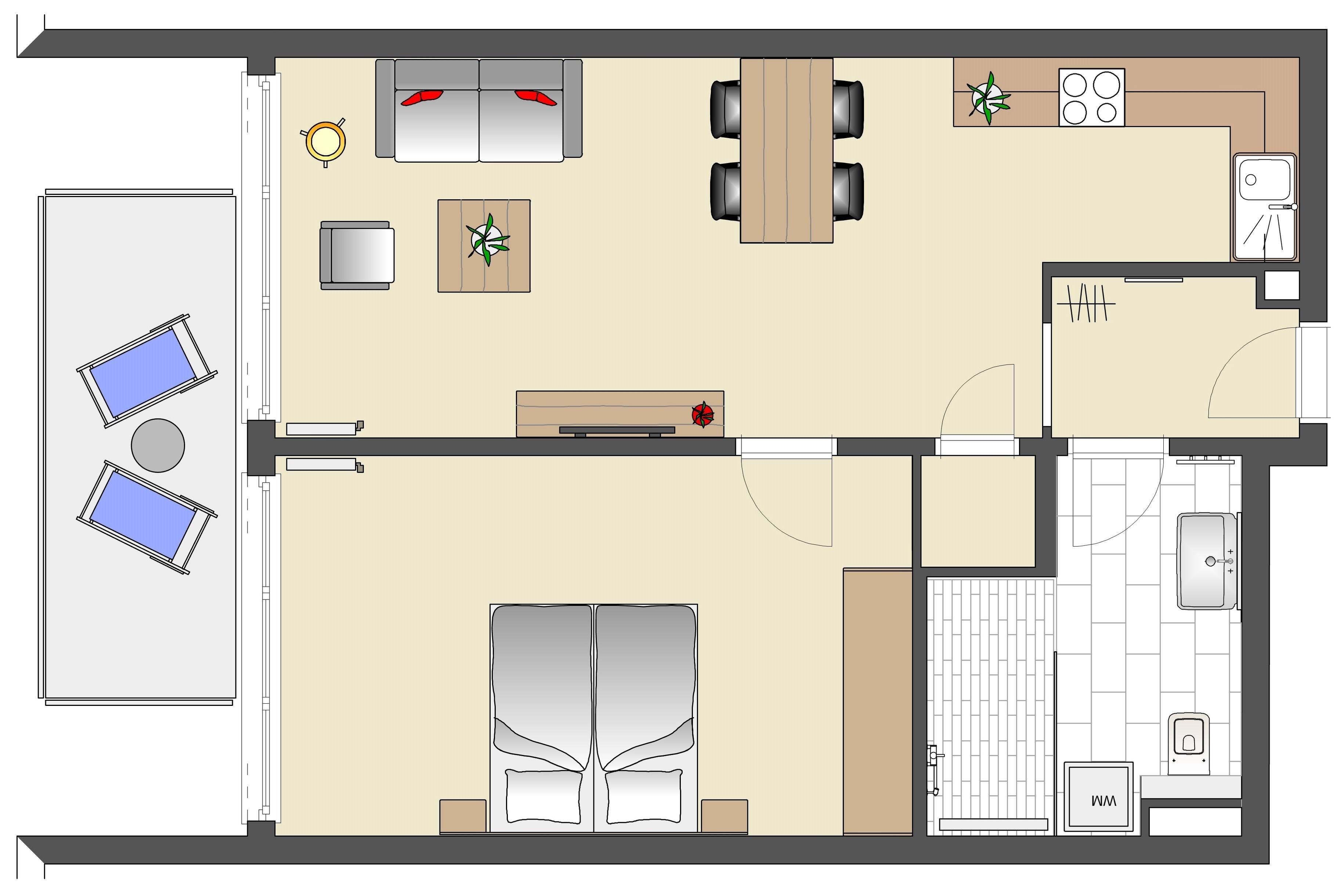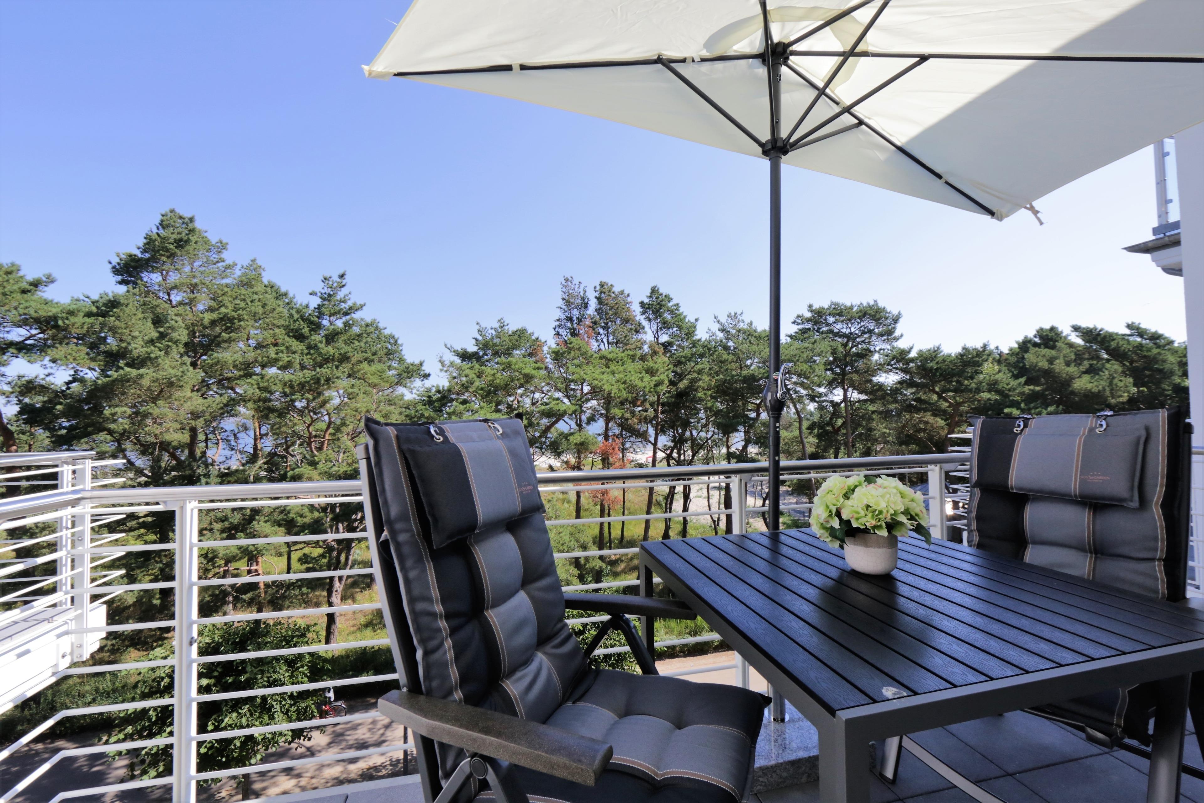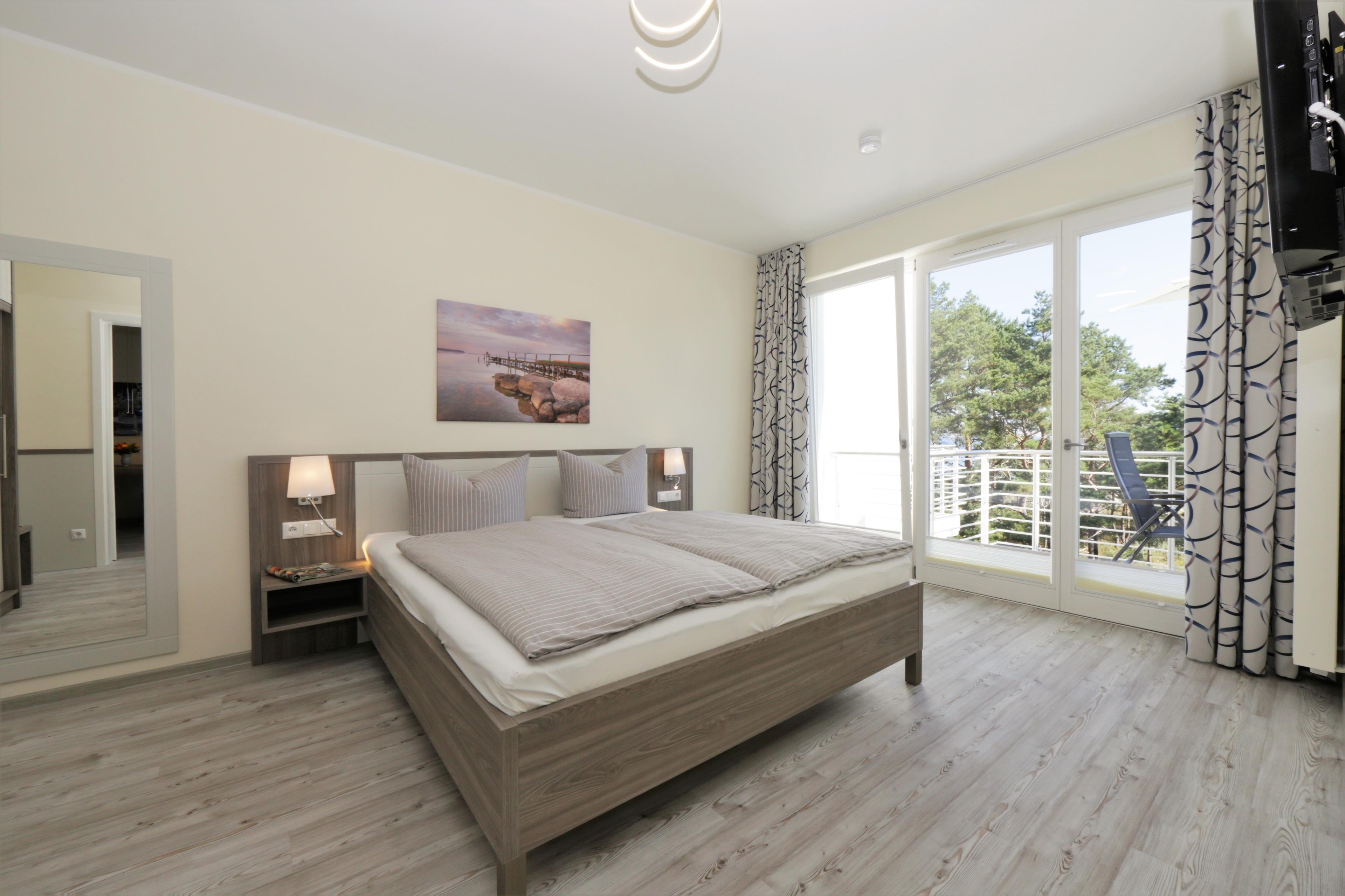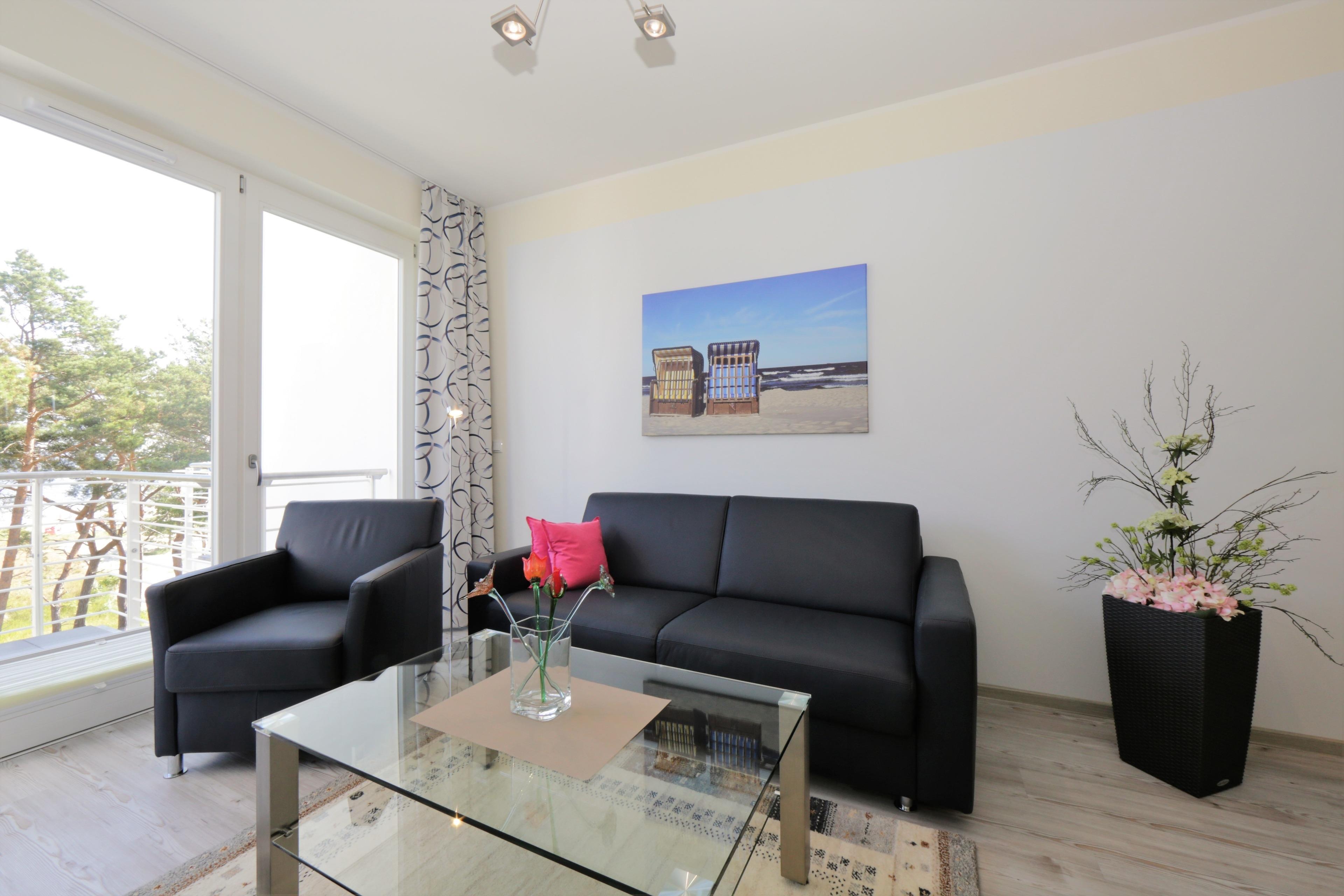 Das mit 58 qm großzügige 2-Zimmer-Appartement befindet sich im 3. OG des Hauses und bietet einen direkten Blick auf die Ostsee und den breiten von Kiefern umsäumten Strand und die Promenade. Dieses Appartement bietet 2 Personen viel Platz für einen entspannten Urlaub. Der helle Wohnraum mit großer Fensterfront ist geschmackvoll mit einer Ledergarnitur und Glastisch sowie Flat TV eingerichtet. Sowohl der gemütliche Essplatz als auch die Vollküche incl. Ceranfeld, Backofen, Mikrowelle, Kühlschrank, Geschirrspüler etc. sind im Wohnraum integriert. Das großzügig bemessene Schlafzimmer ist durch eine breite Schiebetür vom Wohnraum getrennt und mit einem Doppelbett mit getrennten Matratzen (90 x 200) , reichlich Schrankraum, Hotelsafe und einem weiteren TV eingerichtet. Der große, zur Promenade ausgerichtete möblierte Balkon ist sowohl vom Wohnzimmer als auch vom Schlafzimmer begehbar und bietet einen herrlichen Blick. Der Seeblick ist durch die Kiefern ein wenig eingeschränkt, deshalb jedoch nicht weniger interessant. Das Badezimmer verwöhnt die Gäste mit einer ebenerdigen Dusche und Waschtisch/WC.