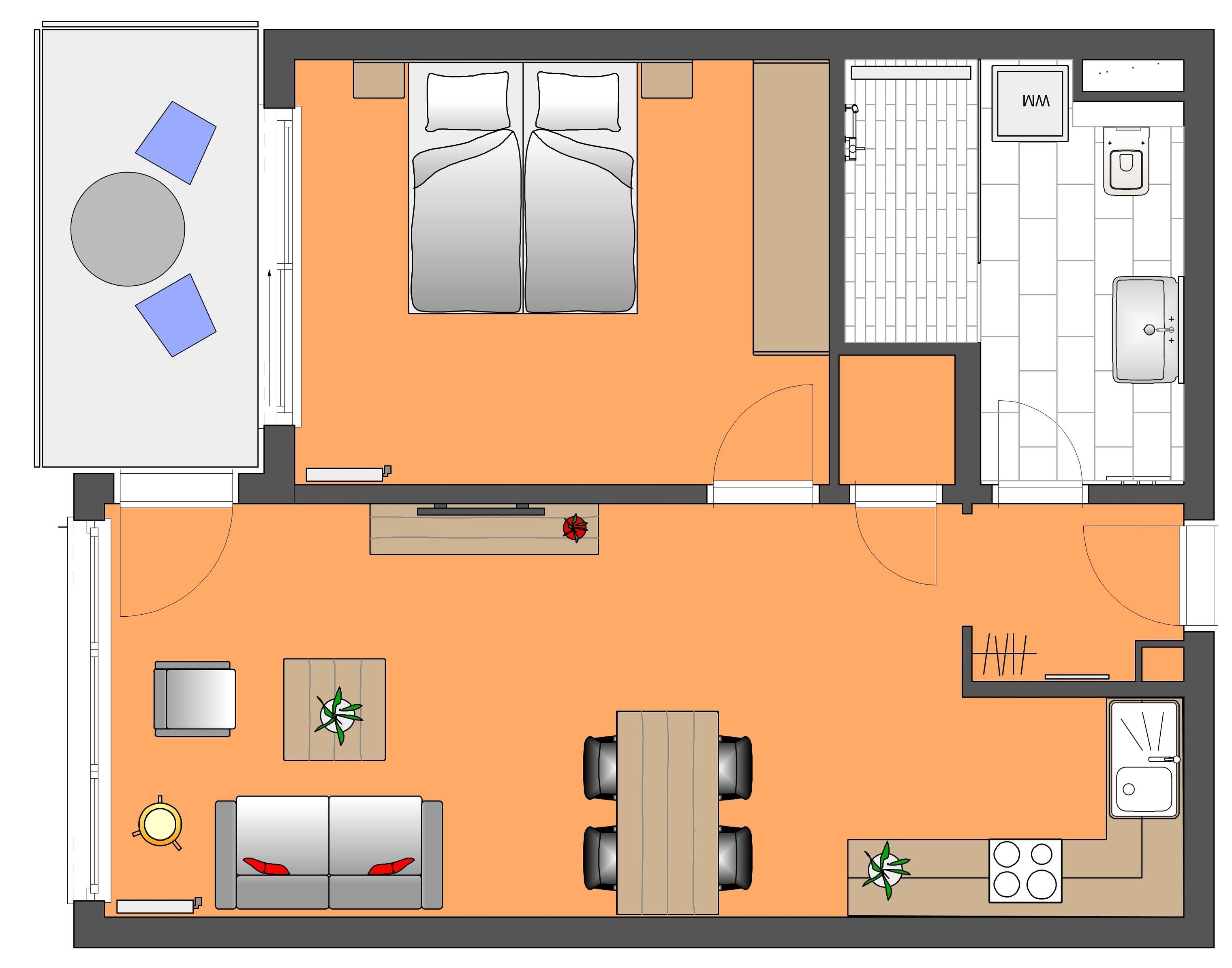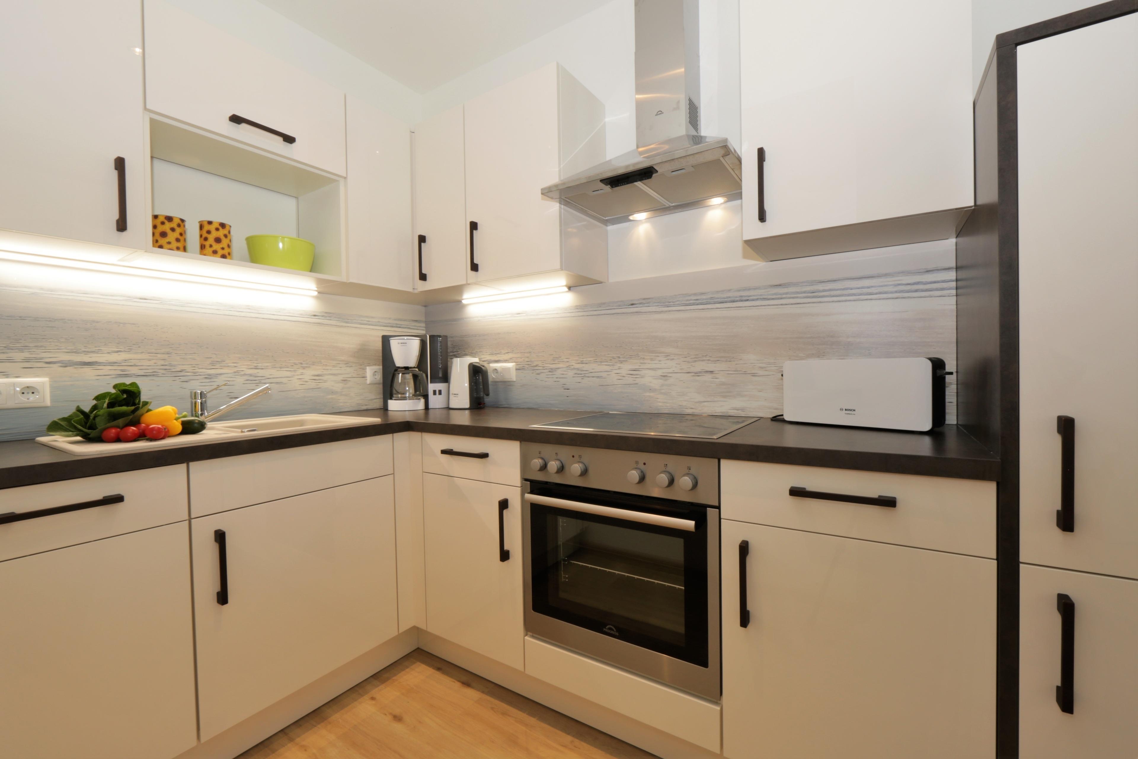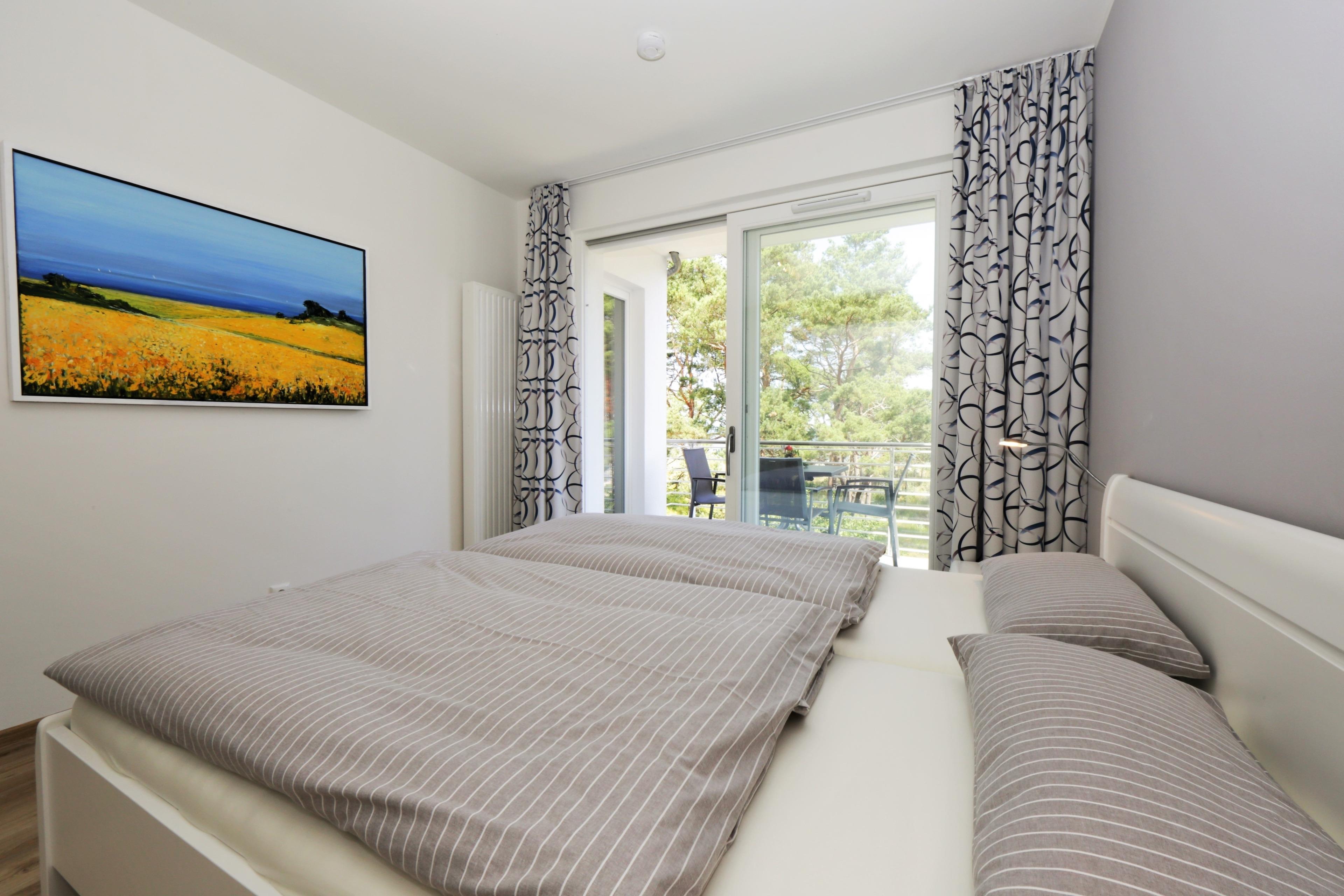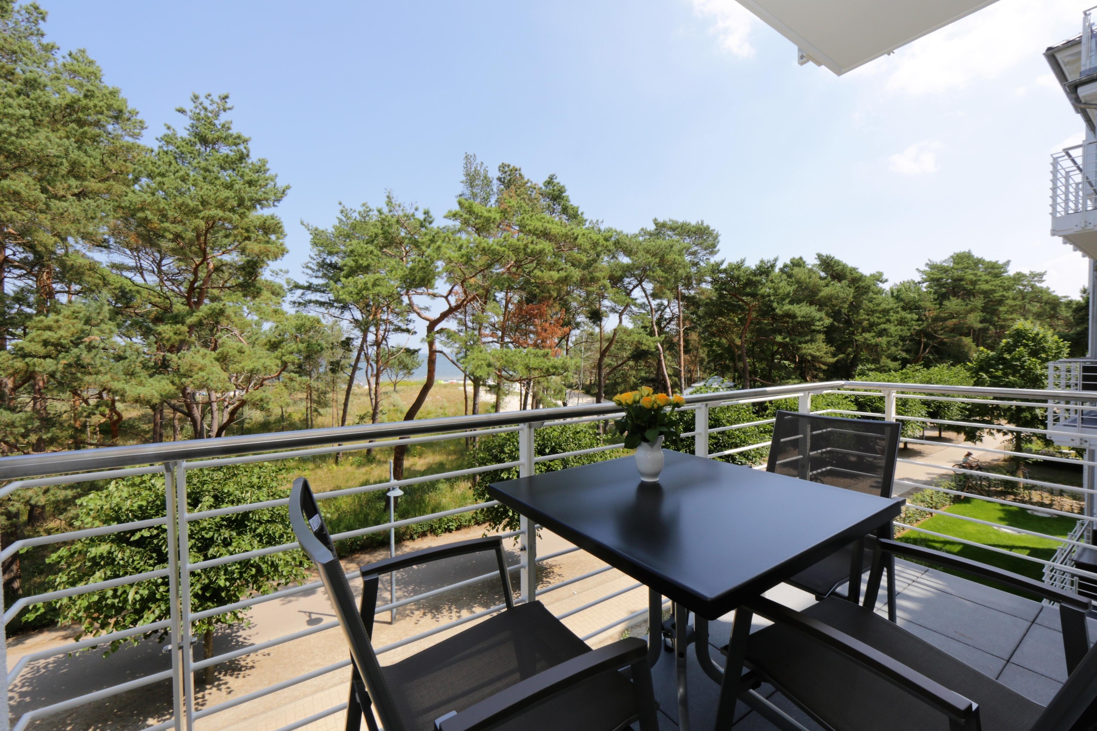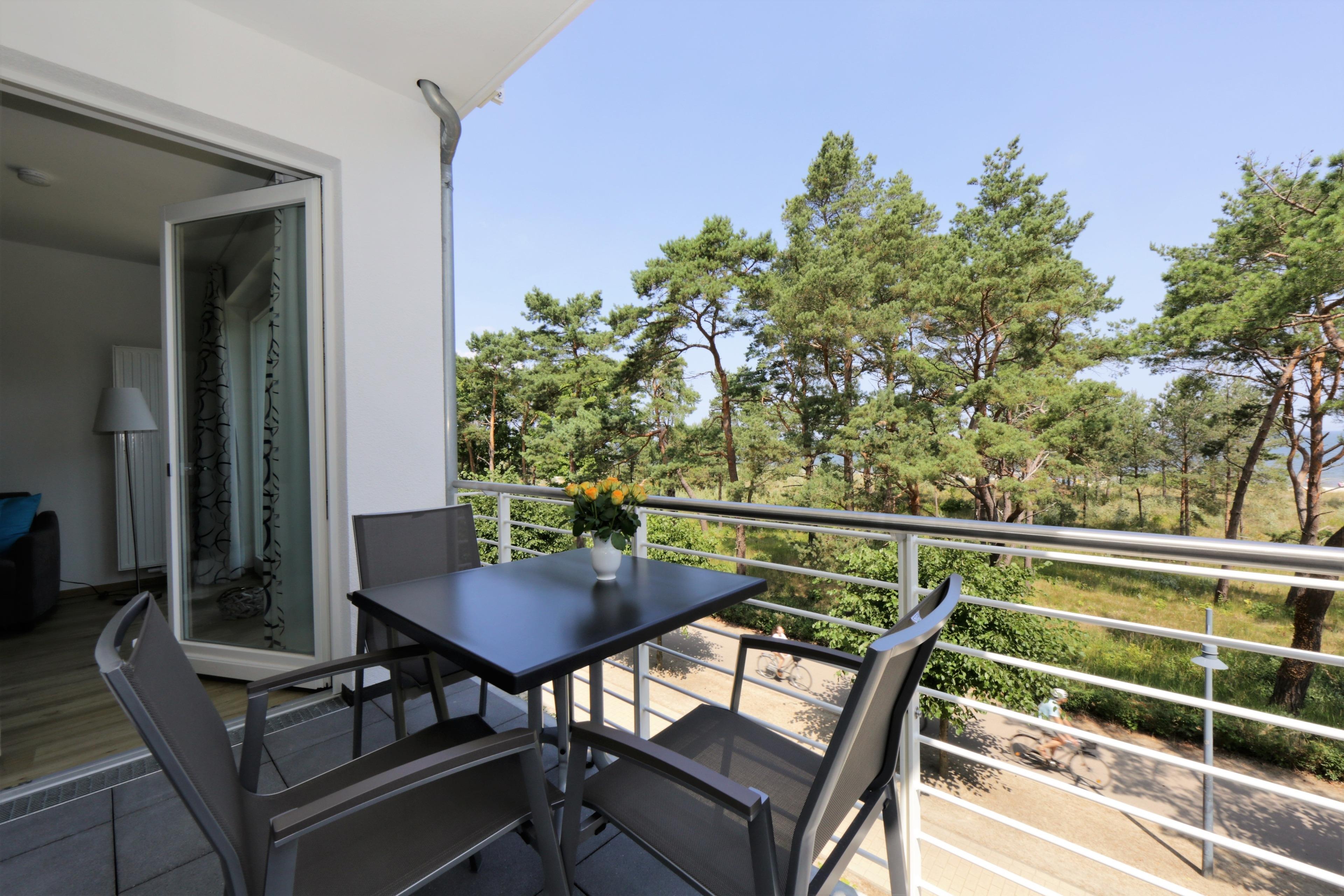 Die moderne, liebevoll eingerichtete 2-Zimmer Wohnung mit 52 m² Wohnfläche befindet sich im 2. Obergeschoss der Strandresidenz. Der überdachte Balkon lockt die Gäste schon zum Frühstück ins Freie. Von hier genießen Sie den Blick auf die Promenade und können einen Blick auf die Ostsee erhaschen. Die Wohnung ist individuell und komfortabel ausgestattet und bietet 2-3 Personen Platz für einen erholsamen Urlaub am Meer. Der offene Wohnraum bietet Ihnen eine gemütliche Sitzecke mit einem bequemen Sofa und Flat TV. Die Küchenzeile incl. Backofen, Ceranfeld, Kühlschrank, Geschirrspüler, Mikrowelle etc. sowie der Essplatz sind offen im Wohnraum integriert. Das geräumige Schlafzimmer ist mit einem Doppelbett mit getrennten Matratzen (90 x 200) und einem großen Kleiderschrank eingerichtet. Aus beiden Zimmern genießen Sie den Seeblick. Der Balkon lässt sich sowohl vom Wohn- als auch vom Schlafzimmer betreten. Das großzügige, moderne Bad ist mit einer ebenerdigen Dusche und Waschtisch/WC ausgestattet. Zusätzlich verfügt die Wohnung über einen 3 qm großen Abstellraum auf dem Flur, den die Gäste nutzen können.