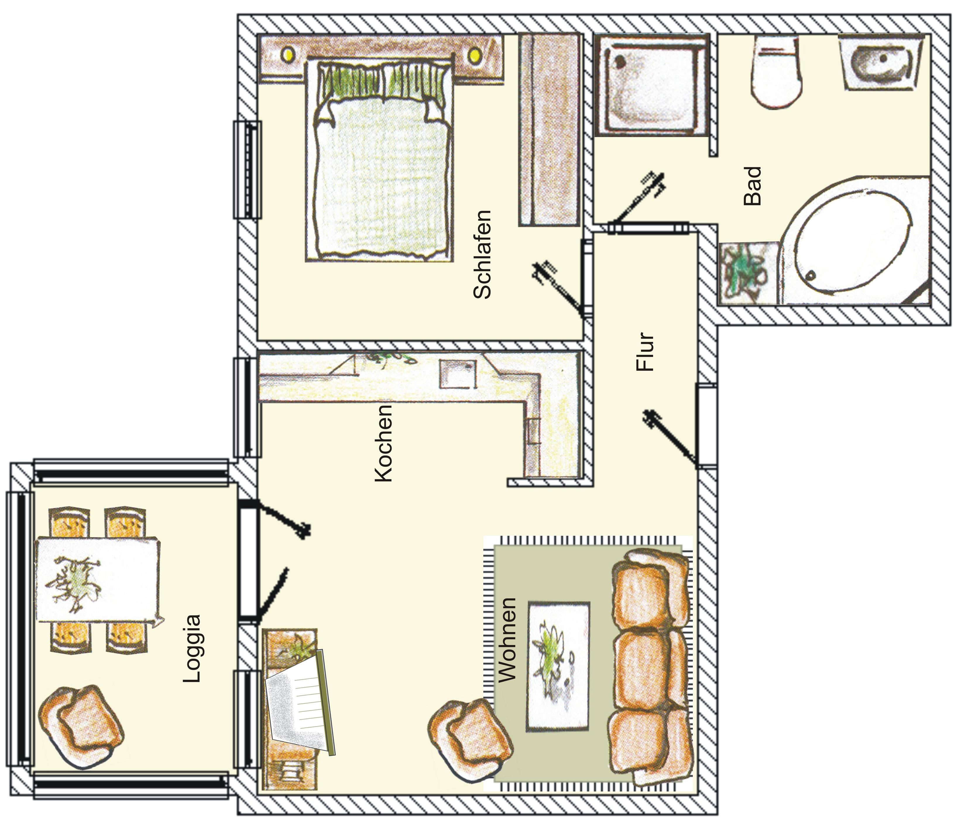 Das 54 qm große 2-Zimmer Appartement befindet sich im Erdgeschoss und bietet Ihnen einen gemütlichen Wohnraum mit Couchecke und Flat TV. Die helle, geschlossene Loggia (Fenster lassen sich öffnen) mit einem Essplatz für 4 Personen lädt zu gemeinsamen Mahlzeiten ein. Die an den Wohnbereich angrenzende offene Küche ist mit Cerankochfeld, Geschirrspüler, Kühlschrank und Mikrowelle etc. ausgestattet. Das Schlafzimmer ist mit einem Doppelbett mit durchgehender Matratze (160 x 200) und genügend Schrankraum eingerichtet. Im Bad befinden sich Dusche, Badewanne und Waschbecken/WC. Der Pkw-Stellplatz befindet sich auf dem Grundstück. Für Fahrräder befindet sich lediglich ein Fahrradständer am Haus.
