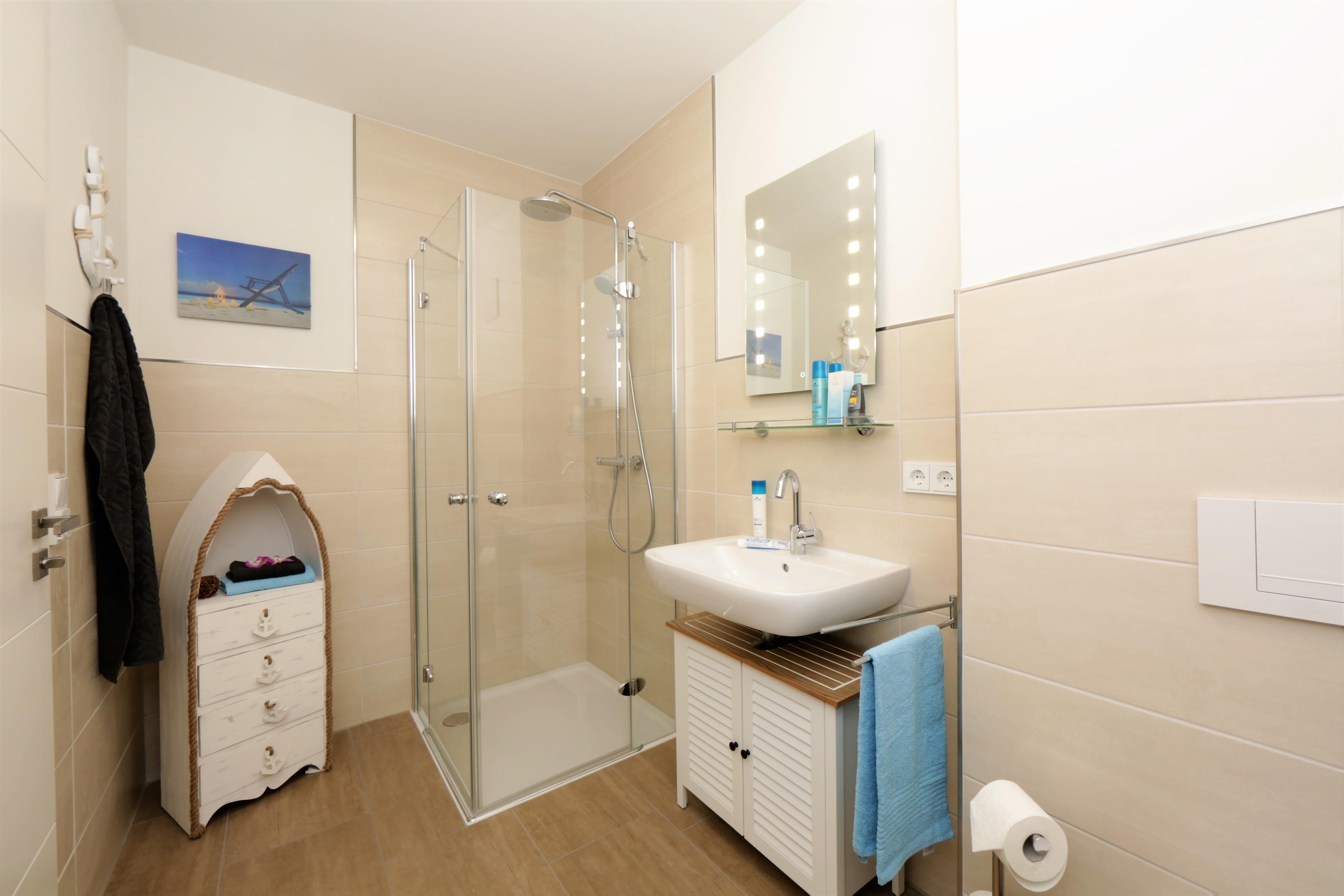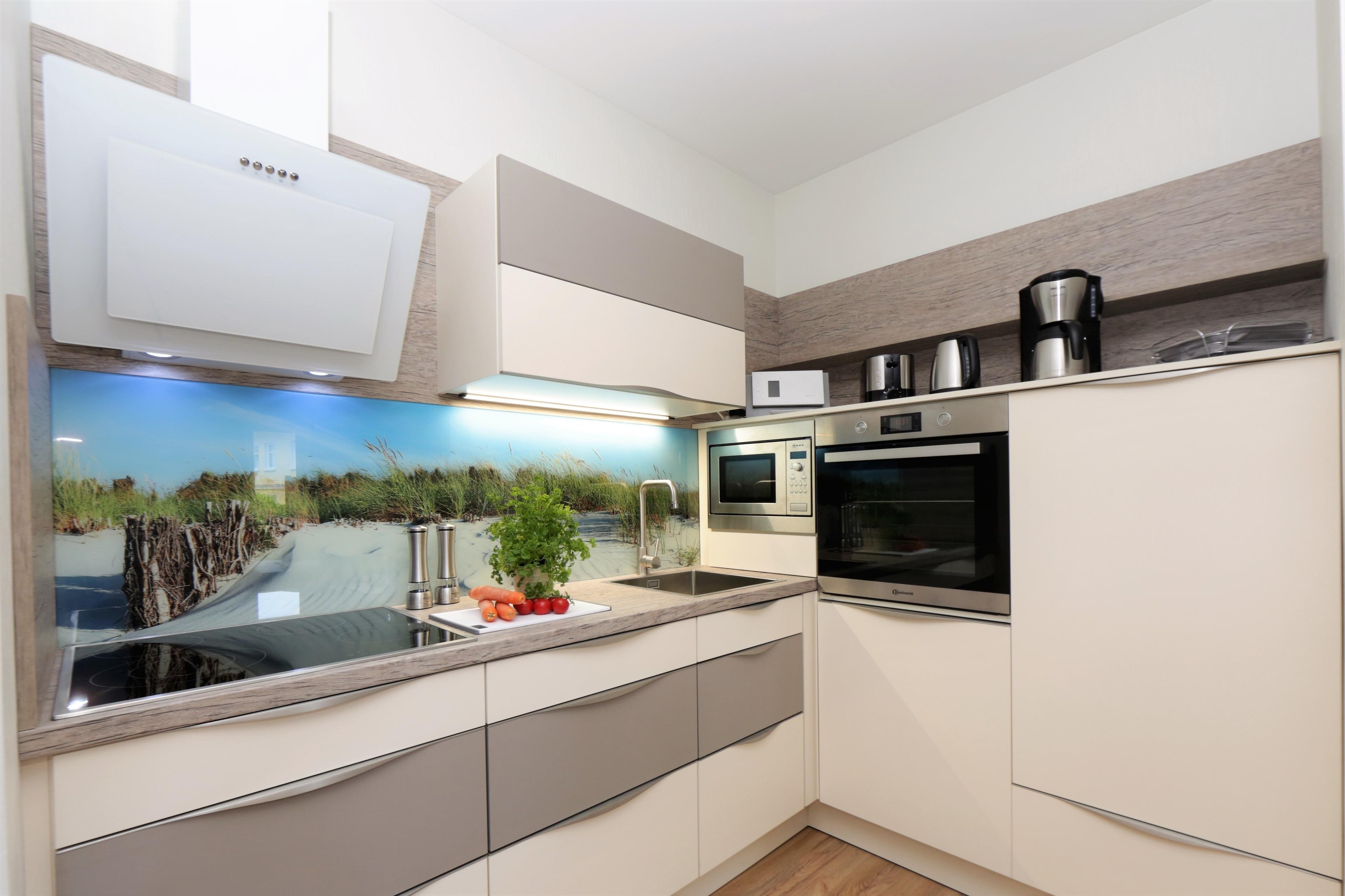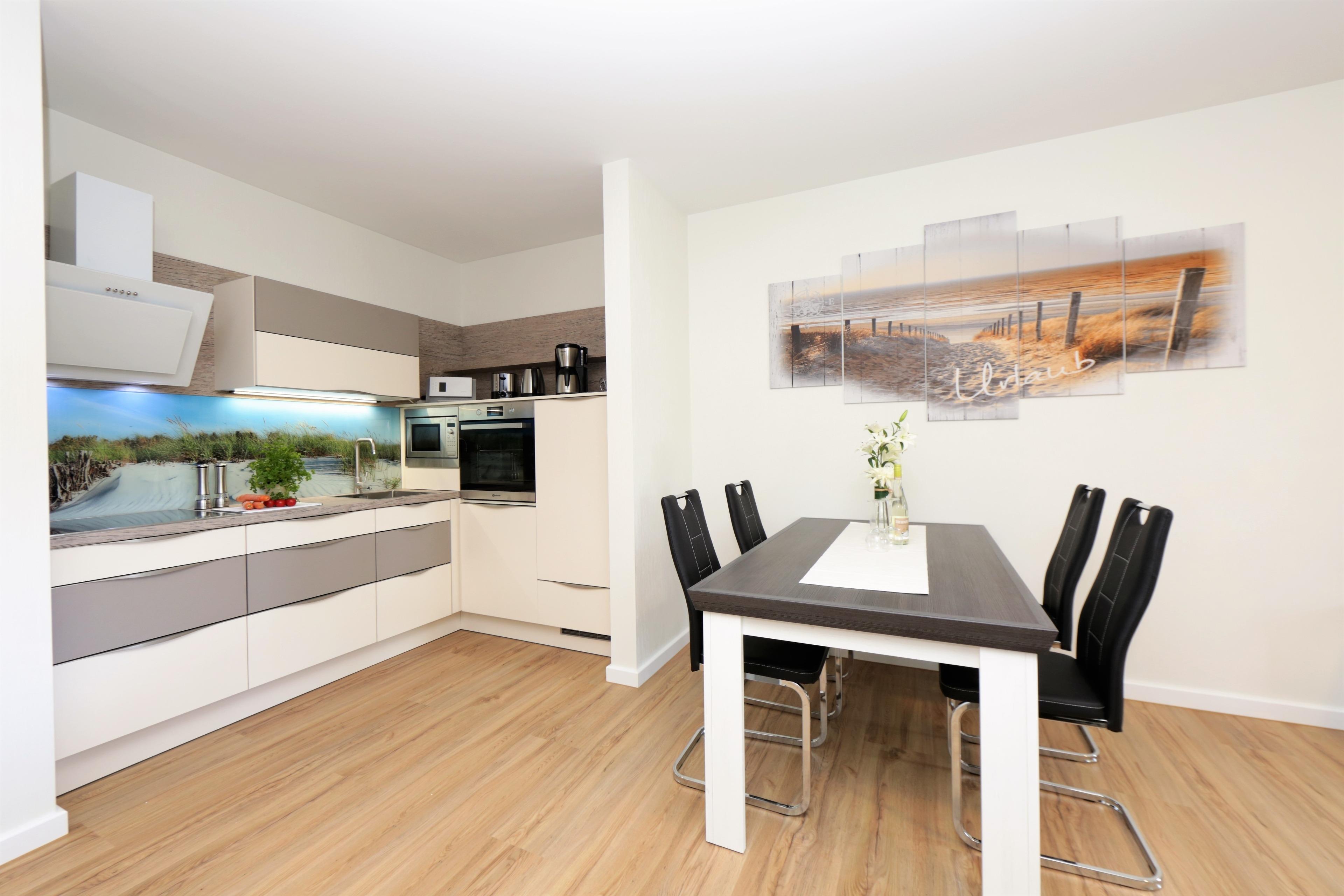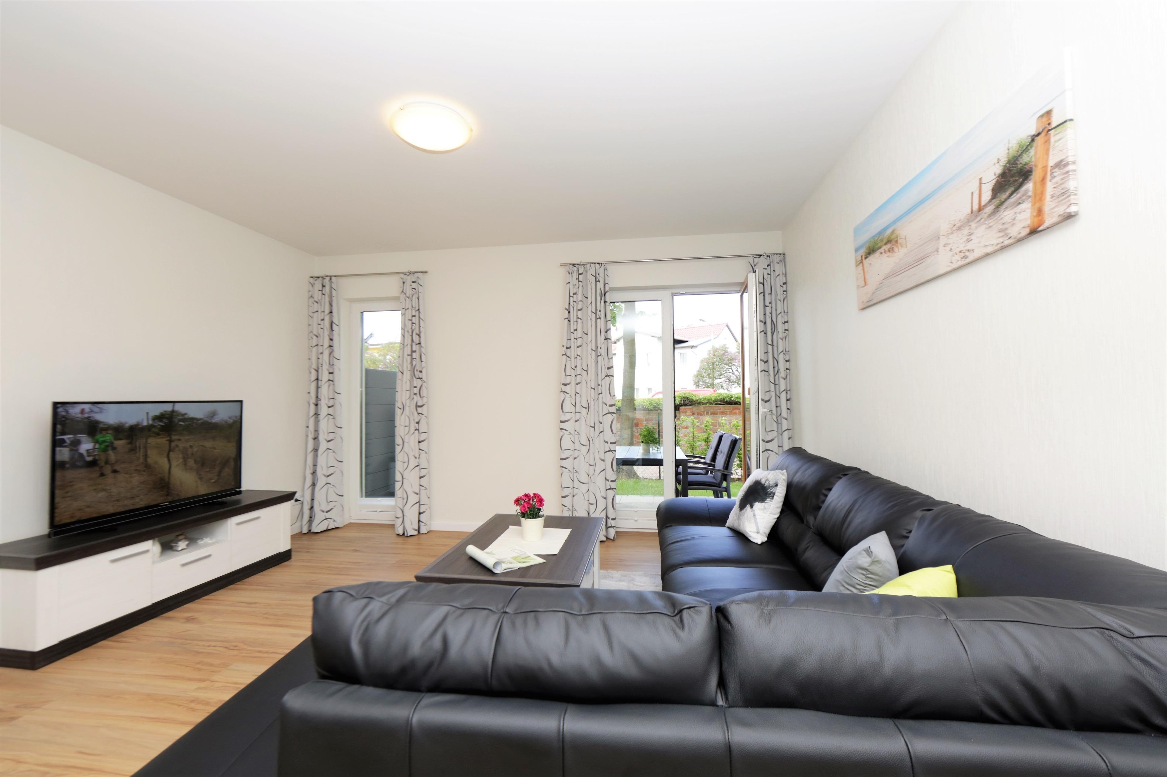 Dieses modern eingerichtete 62 qm große Zwei-Zimmer-Appartement befindet sich im Erdgeschoss der 2016 errichteten Anlage "Ahlbeck Suiten", ca. 300 Meter vom Strand entfernt. Der großzügige Wohnraum ist mit einer Wohnlandschaft mit Schlaffunktion (120 x 200) für eine dritte Person, einem Couchtisch und großem Flat TV sowie einem Esstisch, der bis zu 3 Personen Platz bietet, eingerichtet. Im hinteren Bereich des Wohnraums ist eine Vollküche mit Backofen, Mikrowelle, Ceranfeld, Kühlschrank, Geschirrspüler etc. offen integriert. Der möblierte, überdachte Balkon mit westlicher Ausrichtung ist vom Wohnraum begehbar. Im Schlafzimmer steht den Gästen ein Doppelbett mit getrennten Matratzen (90 x 200) zur Verfügung. Das angrenzende Ankleidezimmer bietet viel Platz und Stauraum. Das Badezimmer ist mit einer ebenerdigen Echtglasdusche und Waschtisch/WC ausgestattet. Für eine behagliche Wärme an kälteren Tagen sorgt in der kompletten Wohnung eine Fußbodenheizung.